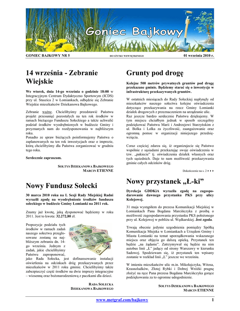 GONIEC BAJKOWY NR 5 01 września 2010 r. DO UśYTKU WEWNĘTRZNEGO 14 września - Zebranie Wiejskie We wtorek, dnia 14-go września o godzinie 18:00 w Integracyjnym Centrum Dydaktyczno Sportowym (ICDS) przy ul. Staszica 2 w Łomiankach, odbędzie się Zebranie Wiejskie mieszkańców Dziekanowa Bajkowego. Zebranie waŜne. Chcielibyśmy przedstawić Państwu projekt przesunięć pozostałych na ten rok środków w ramach bieŜącego Funduszu Sołeckiego a takŜe uchwalić podział środków wyodrębnionych w budŜecie Gminy i przyznanych nam do rozdysponowania w najbliŜszym roku. Ponadto ze spraw bieŜących poinformujemy Państwa o zaplanowanych na ten rok inwestycjach oraz o imprezie, którą chcielibyśmy dla Państwa zorganizować w grudniu tego roku. Serdecznie zapraszam. Grunty pod drogę Kolejne 500 metrów prywatnych gruntów pod drogę przekazane gminie. Będziemy starać się o inwestycje w infrastrukturę przekazywanych gruntów. W ostatnich miesiącach do Rady Sołeckiej napłynęły od mieszkańców naszego sołectwa kolejne oświadczenia dotyczące przekazywania na rzecz Gminy Łomianki działek drogowych z przeznaczeniem na urządzanie ulic. Raz jeszcze bardzo serdecznie Państwu dziękujemy. W tym miejscu chciałbym jednak w sposób szczególny podziękować Państwu Marii i Andrzejowi Starzyńskim z ul. Bolka i Lolka za Ŝyczliwość, zaangaŜowanie oraz ogromną pomoc w organizacji niniejszego przedsięwzięcia. Coraz częściej zdarza się, iŜ organizujecie się Państwo wspólnie z sąsiadami przekazując swoje oświadczenia w tzw. „pakiecie” tj. oświadczenia działek własnych oraz tych sąsiednich. Daje to nam moŜliwość przekazywania gminie całych odcinków dróg. SOŁTYS DZIEKANOWA BAJKOWEGO MARCIN ETIENNE Nowy Fundusz Sołecki 30 marca 2010 roku na L Sesji Rady Miejskiej Radni wyrazili zgodę na wyodrębnienie środków funduszu sołeckiego w budŜecie Gminy Łomianki na 2011 rok. Znamy juŜ kwotę, jaką dysponować będziemy w roku 2011. Jest to kwota: 32.272,80 zł. Propozycje podziału tych środków w ramach zadań naszego sołectwa przegłosowane zostaną na najbliŜszym zebraniu dn. 14go września. Jednym z zadań, jakie chcielibyśmy Państwu zaproponować, jako Rada Sołecka, jest dofinansowanie instalacji oświetlenia na odcinkach dróg przekazywanych przez mieszkańców w 2011 roku gminie. Chcielibyśmy takŜe zabezpieczyć część środków na dwie imprezy integracyjne – wiosenną oraz boŜonarodzeniową z paczkami dla dzieci. Dokończenie na s. 2 Nowy przystanek „Ł-ki” Dyrekcja GDDKiA wyraziła zgodę na zagospodarowanie dawnego przystanku PKS przy ulicy Kolejowej. 31 maja wystąpiłem do prezesa Komunikacji Miejskiej w Łomiankach Pana Bogdana Marcińczyka z prośbą o moŜliwość zagospodarowania przystanku PKS połoŜonego przy ul. Kolejowej w pobliŜu ul. Wędkarskiej. Jest zgoda. Trwają obecnie jedynie uzgodnienia pomiędzy Spółką Komunikacja Miejska w Łomiankach a Urzędem Gminy i Miasta Łomianki na temat uporządkowania wskazanego miejsca oraz objęcia go dalszą opieką. Przystanek ten będzie „na Ŝądanie”. Zatrzymywał się będzie na nim autobus linii „Ł” jadący od strony Warszawy w kierunku Sadowej. Spodziewam się, iŜ przystanek ten wpisany zostanie w rozkład linii „Ł” jeszcze we wrześniu. W imieniu mieszkańców ulic m.in. Mikołajczyka, Witosa, Krasnoludków, Złotej Rybki i Dobrej WróŜki pragnę złoŜyć na ręce Pana prezesa Bogdana Marcińczyka gorące podziękowania za to ogromne udogodnienie. RADA SOŁECKA DZIEKANOWA BAJKOWEGO www.metgraf.com/bajkowy SOŁTYS DZIEKANOWA BAJKOWEGO MARCIN ETIENNE 1 Przekazujemy grunty pod drogę Wybory za nami… Kolejne, przed nami Wybory samorządowe w listopadzie. To za niecałe 3 miesiące. To… bliŜej niŜ dalej. W wyborach do Parlamentu Europejskiego mieszkańcy Dziekanowa Bajkowego ustanowili frekwencję 40%. W wyborach prezydenckich - ponad 70% (statystyki dotyczące frekwencji na poszczególnych ulicach nasze-go sołectwa znajdziecie Państwo na stronie Dziekanowa Bajkowego: www.metgraf.com/bajkowy. Wierzę, Ŝe moŜemy powtórzyć ten wynik. Jestem przekonany, Ŝe powinniśmy to zrobić. Wybory te bowiem, będą dla nas – lokalnej społeczności – NAJWAśNIEJSZE. Ja ZAWSZE biorę udział w wyborach. Akt ten odbieram jako przywilej, ale teŜ obowiązek. W moim przypadku sprawa zawsze była prosta. Nigdy bowiem dotąd nie miałem wątpliwości, na kogo oddać swój głos. NiezaleŜnie, czy był to konkretny kandydat, czy ugrupowanie polityczne. Nigdy nie musiałem wybierać pomiędzy mniejszym złem. A gdybym musiał? Czy, gdyby nie było wśród kandydatów tego „mojego”, nie wziąłbym udziału w głosowaniu? Przeciwnie! Tym bardziej pobiegłbym zagłosować. Nie z racji przywileju, ale z obywatelskiego obowiązku - dokonałbym wyboru tego mniejszego zła. Oddając głos - kaŜdy z nas bierze jednocześnie na siebie cząstkę odpowiedzialności. Z wielka uwagą śledzę zawsze wyborczą frekwencję, mając nadzieję, Ŝe będzie ona rekordowa. Biorąc udział w głosowaniu zawsze mam poczucie, iŜ z chwilą wrzucenia głosu do urny zyskuję prawo do oceny osoby lub osób, na które oddaję swój głos. W zaleŜności od sytuacji mogę bowiem z podniesioną głową krytykować ją lub... wspierać. Za 3 miesiące wybory samorządowe. Dokonując wyboru lokalnego przedstawiciela chcę, by była to osoba wysokiej kultury osobistej, by umiała słuchać i czerpać z rad fachowców. By była bezstronna we wszystkich decyzjach i działaniach. Osoba taka powinna, moim zdaniem, wykazać się konkretnymi osiągnięciami. Chciałbym, by mój przedstawiciel do władz lokalnych był osobą wysoce kompetentną i sprawną w działaniu. Uczciwą. śeby był przyzwoitym człowiekiem. Z tego względu - brak udziału w wyborach oceniam jako szkodliwy społecznie nihilizm, „tumiwisizm”. Brak udziału w głosowaniu, w moim przekonaniu, pozbawia prawa do 