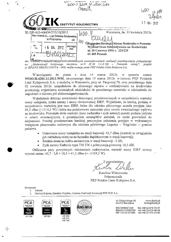 l、次ブ川.庖04.−1位くる44.初 d 出仇弘 圏 I書く INSTYTUT 圏図 17朝一2012 KoLEJNICTWA IK_Dp−4⊥2−4也436/233月OI2012 車nmaI剛胆叩OchronyS。。d。鵬k; l wPozoa… 〈2) 161博 聞Z 00」上, Warszawa・dnllkwietnia2012r 捲艶露語 ul.28Czerwea1956r.223/229 61−485Poznah lyChult,arunkowaniachT−ealiZaqlplZedsie彫teC7apOlegyqcego na,,Moderniza少∴kolqfowego kolytalZa nrlTi伍20iC−E20)− Po20StaieIWboか,〟.prqfekt nrlSPA/伍S2002/PL〃6/P/PA−009,realizowanegoprZeZPKPPoIskieLimeKolyoweS.A. WnawlaZaniu do plSma Z dnia14 marca 2012r.w sprawie numer WOO−H.4201.11.2011.WM,OtrZimanegO dnia19marca2012r wimieniuPKP PoIskich 国 LiniiKoldowychS.A.zsiedziba−WWarsz細′le,PrZyuLTargowej74,OraZPrZeSねnegodnia O2kwietnia2012r・YZuPehieniadozbZonego rapom00ddzia士ywaniuna SrodoⅥrisko przekaz可ewyjaSnienlaZaistniabTChnieScisIoScidoprzesねnegomateriahwodniesieniudo zagadniehzzakresupdlelektromagnetycznych・ WyfaSnieniedotyczynieScisねScidotyczac句PrZedstawionychlWuZuPehieniuwartoSci mocynadainika,ZySkuantenylmOCyr6wnowaznもEIRP・Wyiagniam,乞eistotna,POdan色W uzupeInieniuwartoSclqjestmocEIRP,kt6radlaodcinkapilotowegozostalaprzl衰tajako 61,2dBm(−1318,3W)iktdramapodstawoweznaczenieprzyocenieewentualnegoWPbIWu naSrodowisko.PozostaIedWiewartoあi(mocnadajnikaizyskanteny)zostabTPOdanejedynie w celach orientacy〕nyCh,Z POminleClem SZCZegSh5Wr Zak)Zen,CO mCZ・e prOit′adziC do nle]aSnOgCi.Poni2時PrZedstawiam bardzieiprecyzyJne Zaねえenia przy:衰te w Wykonanym wstepnymplanowaniuradiowym dla odcinkapilotowego LegnlCa−WQgliniec−granica pahshva ・Ustawieniemocynad勾nikanastacjibazow哲45,7dBm(WartO呈上auwzglednia jTi:ZakあdanastratenanaZacznlkudupleksowymwstaqjibazoⅥ㈲; ・Sredniastratanakabluantenowymwstacjlbazowg:−3dB; ・ZyskantenyKathreintypu730376zpolaryZaCja,Pionow往:18,5dBi Obliczona przy poWyZSZyCh zalozeniach maksymalna warto誇mocy EIRP anteny wynosizatem:45,7−3,0+18,5=61,2dBm(二一1318,3W)・ 孝教祖親佐《 KarolinaWiSniewska Pehomocnik PKPPoIskieLinieKolejoweS.A. OtIZymlウC. L Adresat 2.ManolaKujawa,DyrektorPnJektu,CentmmReali2,a擁Inwest)高iPIOPLKS・A・ uiChk・Piekieg050 www.ik01eJPi O4−275Warszawa ik〇回@ik0lej,Pi KR50000021539 fax+4822610−75−97 REGONO16382785 tei+4822610−08−68 NiPl13−22−57−883 tei+4822473−13−00 AB369 AB310 AB742 +