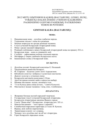 PATVIRTINTA Nacionalinio egzaminų centro direktoriaus 2012 m. sausio 20 d. įsakymu Nr. (1.3.)-V1-10 2012 METŲ GIMTOSIOS KALBOS (BALTARUSIŲ, LENKŲ, RUSŲ, VOKIEČIŲ) DALIES ŽODŽIU (VIEŠOJO KALBĖJIMO) PAGRINDINIO UGDYMO PASIEKIMŲ PATIKRINIMO TEMOS IR POTEMĖS GIMTOJI KALBA (BALTARUSIŲ) МОВА 1. 2. 3. 4. 5. 6. 7. 8. 9. 10. Нацыянальная мова – духоўны здабытак народа. Узнікненне пісьма і этапы яго развіцця. Моўнае асяроддзе як сродак развіцця чалавека. Стылі сучаснай беларускай літаратурнай мовы. Мова і сродкі масавай інфармацыі. Развіццё слоўнікавага запасу беларускай літаратурнай мовы на працягу ХХ ст. Беларуская мова – адна са славянскіх моў. Слоўнікі – зафіксаваная моўная спадчына народа. Метафары ў творах любімага беларускага паэта. Іншамоўныя словы ў беларускай мове. КУЛЬТУРА 1. 2. 3. 4. 5. 6. 7. 8. 9. 10. Духоўны подзвіг беларускай асветніцы Е. Полацкай. Традыцыйныя рамёствы Беларусі. Ф. Скарына – выдатны дзеяч эпохі Адраджэння. Біблейскія сюжэты і вобразы ў сусветным мастацтве. Дыялог культур у сучасным свеце. Беларускія мастацкія калектывы ў Літве. Архітэктурныя помнікі майго горада (на выбар). Цікавая мастацкая падзея апошняга года. “А на Купалу рана сонца ўстала...” (свята Купалле). Мастацтва ў жыцці чалавека: тэатр, кіно, тэлебачанне. ЛІТАРАТУРА 1. 2. 3. 4. 5. 6. 7. 8. 9. 10. Жанравае багацце вуснай народнай творчасці. Гістарычная тэма ў сучаснай беларускай літаратуры. Беларускія літаратурныя мясціны Вашага горада. Газета “Наша ніва” і беларуская літаратура пач. ХХ ст. Максім Багдановіч – “паэт красы і гармоніі”. Самабытныя народныя характары ў п’есах Я. Купалы. Вершы, якія люблю перачытваць. Экранізацыя класікі: за і супраць. Чалавек і яго духоўны свет як аб’ект літаратуры. Героі беларускіх народных казак. 1 GIMTOJI KALBA (LENKŲ) JĘZYK 1. 2. 3. 4. 5. 6. 7. 8. 9. 10. Grzeczność nie jest nauką łatwą ani małą (A. Mickiewicz). Polska etykieta językowa. W trosce o kulturę języka. Najpotrzebniejsze słowniki języka polskiego i wydawnictwa poprawnościowe. Nazwy własne w języku polskim: ich klasyfikacja i pochodzenie. Frazeologia polska i litewska – wspólne warstwy kulturowe i specyfika narodowa. Regionalna odmiana polszczyzny na Litwie i jej osobliwości (omów wybrany poziom języka, jak np. słownictwo, fonetykę, odmianę lub budowę wyrazów, składnię). Wielojęzyczność i wielokulturowość we współczesnej Europie. Język polski wśród innych języków słowiańskich. Język, którego chciałbyś się nauczyć. Co wiesz o nim i o jego użytkownikach? Jak napisać dobre wypracowanie? Zgromadź porady i podziel się doświadczeniem. Panuj słowom swoim i gestom swoim, jak wódz szykom w bitwie (L. Staff). Omów zasady dyskusji, odwołując się do różnych przykładów z życia społecznego, politycznego itp. KULTURA 1. 2. 3. 4. 5. 6. 7. 8. 9. 10. Piotr Skarga – pierwszy rektor Uniwersytetu Wileńskiego. Sylwetka Janusza Korczaka – człowieka, pedagoga, publicysty, pisarza i działacza społecznego. Ulicami Wilna. Przedstaw najcenniejsze zabytki architektury naszej stolicy. Cmentarze wileńskie jako zabytki kultury. Na skrzyżowaniu kultur. Tradycje i obyczaje na Wileńszczyźnie. Polskie miasta – gospodarze Mistrzostw Europy w piłce nożnej 2012, ich oblicze historyczne i kulturowe. Wybitny polski aktor (aktorka) i jego najbardziej udane kreacje filmowe. Dzieła sztuki, które przynoszą narodowi polskiemu rozgłos i uznanie w świecie. Wielkie dzieła i wielcy twórcy kultury epoki renesansu (lub innej wybranej epoki). Teatr bawi, uczy, wychowuje. Opowiedz o swoich spotkaniach z teatrem. LITERATURA 1. 2. 3. 4. 5. 6. 7. 8. 9. 10. Józef Ignacy Kraszewski – autor powieści historycznych. Portret Bolesława Prusa – człowieka, pisarza, Polaka. Tło historyczne poematu Adama Mickiewicza Pan Tadeusz. Wybitni polscy twórcy literatury i sztuki, związani z Litwą. Miejsca i pamiątki związane z życiem kulturalno-literackim w Twojej okolicy. Podróże kształcą. Motyw podróży w literaturze różnych epok. Literatura jako nauczycielka życia. Przedstaw utwór, w którym odkryłeś ważne dla Ciebie prawdy życiowe. Najlepsze, według Ciebie, polskie powieści młodzieżowe. Utwory literackie a ich ekranizacje. Omów na wybranych przykładach. Jak wyobrażasz sobie możliwości interpretacji scenicznej wybranego utworu dramatycznego (np. „Balladynaˮ J. Słowackiego, „Zemstaˮ A. Fredry, „Moralność pani Dulskiejˮ G. Zapolskiej lub in.)? Omów charaktery i wygląd postaci, zaprojektuj scenografię i inne szczegóły przedstawienia. 2 GIMTOJI KALBA (RUSŲ) ЯЗЫК 1. 2. 3. 4. 5. 6. 7. 8. 9. 10. Пословицы о языке и речи. Что они говорят нам о силе слова и его возможностях? Красноречие – ключ к успеху. Подтверди