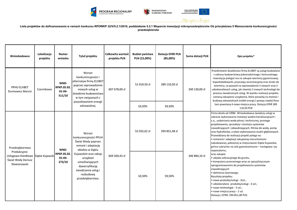 Lista projektów do dofinansowania w ramach konkursu RPOWKP 32/V/5.2.1/2010, poddziałanie 5.2.1 Wsparcie inwestycji mikroprzedsiębiorstw Oś priorytetowa 5 Wzmocnienie konkurencyjności przedsiębiorstw Wnioskodawca PPHU ELVBET Durmowicz Marcin Lokalizacja projektu Czernikowo Numer wniosku Tytuł projektu Wzrost konkurencyjności i alternatyw firmy ELVBET WNDpoprzez wprowadzenie RPKP.05.02. nowych usług w 01-04dziedzinie budownictwa 511/10 w tym związanych z pozyskiwaniem energii odnawialnej. Wzrost konkurencyjności PPUH Świat Wody poprzez remont i adaptację Przedsiębiorstwo WNDobiektu w Dąbiu ProdukcyjnoRPKP.05.02. Kujawskim oraz zakup Usługowo-Handlowe Dąbie Kujawski 01-04urządzeń Świat Wody Dariusz 273/10 umożliwiających Sławianowski dywersyfikację świadczenia usług i rozbudowę przedsiębiorstwa. Całkowita wartość projektu PLN Budżet państwa PLN (15,00%) 51 019,50 zł Dotacja EFRR PLN (85,00%) 52 032,62 zł Opis projektu* 340 130,00 zł Przedmiotem działalności firmy ELVBET są usługi budowlane z zakresu budownictwa jednorodzinnego i komunalnego. Inwestycja polegać ma na zakupie wiertnicy gąsienicowej, koparkoładowarki, przyczepy ascenizacyjnej oraz żerdzi do wiertnicy, co pozwoli na wprowadzenie 5 nowych oraz 5 udoskonalonych usług, jak również 2 nowych technologii do procesu świadczonych usług. W wyniku realizacji projektu zostaną zakupione urządzenia, które pozwolą na montaż i budowę odnawialnych żródeł energii ( pompy ciepła).Poza tym powstaną 4 nowe miejsca pracy. Dotacja EFRR 289 110,50 PLN 289 110,50 zł 607 678,00 zł 10,50% Suma dotacji PLN 59,50% 294 851,48 zł 604 569,43 zł 346 884,10 zł 10,50% 59,50% Firma działa od 1998r. Wnioskodawca świadczy usługi w zakresie wykonywania instalacji wodno-kanalizacyjnych i c.o., uzdatniania wody pitnej i technicznej, prostego projektowania, sprzedaży i montażu systemów nawadniających i odwadniających, filtrów do wody, pomp oraz hydroforów, a także wykonywania studni głębinowych. Przewidziany do realizacji projekt polega na: • remoncie i adaptacji zakupionej nieruchomości zabudowanej, położonej w miejscowości Dąbie Kujawskie, gmina Lubraniec na cele gastronomiczno – noclegowe i jej wyposażeniu, oraz zakupie: • ubijaka wibracyjnego do gruntu, • komputera przenośnego wraz ze specjalistycznym oprogramowaniem do projektowania systemów nawadniających • dalmierza laserowego. Rezultaty projektu: • nowe produkty/usługi - 3szt.; • udoskonalone produkty/usługi - 3 szt.; • nowe technologie - 3 szt.; • nowe miejsca pracy - 1 szt. Dotacja z EFRR: 294.851,48 PLN. Lista projektów do dofinansowania w ramach konkursu RPOWKP 32/V/5.2.1/2010, poddziałanie 5.2.1 Wsparcie inwestycji mikroprzedsiębiorstw Oś priorytetowa 5 Wzmocnienie konkurencyjności przedsiębiorstw Wnioskodawca Dampin Fryckowski&Polcyn, Marek Fryckowski, Monika Polcyn Lokalizacja projektu Chełmno Numer wniosku Tytuł projektu Wzrost konkurencyjności firmy WNDDampin Fryckowski& RPKP.05.02. Polcyn poprzez 01-04wzbogacenie i 237/10 udoskonalenie oferty usługowej. Całkowita wartość projektu PLN Budżet państwa PLN (15,00%) 15 750,00 zł Zakład ProdukcyjnoUsługowo-Handlowy CERAMIKON Rozmarynowicz Łukasz Grudziądz 34 975,50 zł Opis projektu* 105 000,00 zł Przedmiotem działalności firmy DAMPIN Fryckowski&Polcyn jest organizacja imprez okolicznościowych. Inwestycja polegać ma na zakupie sprzętu i wyposażeniu użytkowego pensjonatu, co pozwoli na wprowadzenie 3 nowych oraz 3 udoskonalonych produktów/usług, jak również 3 nowych technologii do procesu świadczonych usług. W wyniku realizacji projektu powstaną 3 nowe miejsca pracy. Dotacja EFRR 89 250,00 PLN 233 170,00 zł Głównym profilem działalności Zakładu ProdukcyjnoUsługowo-Handlowego CERAMIKON jest produkcja urządzeń do wyposażenia pracowni ceramicznych. W ramach projektu firma zakupi 46 szt. środków trwałych - speacjalistycznych maszyn i urządzeń, m.in.: gwintownica elektryczna na podstawie, wiertnica diamentowa wraz ze stojakiem i gwintownica elektryczna, co pozwoli na wprowadzenie 12 nowych usług, 5 udoskonalonych produktów oraz 4 nowych technologii do procesu produkcji. W wyniku realizacji projektu powstanie 1 nowe miejsce pracy. Dotacja EFRR 198 194,50 PLN 59,50% 198 194,50 zł 406 382,00 zł 10,50% Suma dotacji PLN 89 250,00 zł 183 000,00 zł 10,50% Zwiększenie zdolności produkcyjnych i usługowych Zakładu WNDProdukcyjno-UsługowoRPKP.05.02. Handlowego CERAMIKON 01-04231/10 Rozmarynowicz Łukasz poprzez zakup specjalistycznych urządzeń. Dotacja EFRR PLN (85,00%) 59,50% Lista projektów do dofinansowania w ramach konkursu RPOWKP 32/V/5.2.1/2010, poddziałanie 5.2.1 Wsparcie inwestycji mikroprzedsiębiorstw Oś priorytetowa 5 Wzmocnienie konkurencyjności przedsiębiorstw Wnioskodawca Lokalizacja projektu Numer wniosku Tytuł projektu Całkowita wartość projektu PLN Budżet państwa PLN (15,00%) 52 500,00 zł Stankowicz Sebastian Jeleń WNDUruchomienie karczmy z RPKP.05.02. funkcją noclegową w 01-04miejscowości Jeleń, 523/10 przez firmę Stankowicz. TM WOOD SUPPLY Tomasz Marach Bydgoszcz Suma dotacji PLN 297 500,00 zł 610 000,00 zł 350 000,00 zł 10,50% Wzrost konkurencyjności firmy WNDTM WOOD SUPPLY RPKP.05.02. Tomasz Marach poprzez 01-04zakup środków trwałych 082/10 oraz wartości niematerialnych i prawnych. Dotacja EFRR PLN (85,00%) 49 893,90 zł 59,50% 282 732,10 zł 579 719,60 zł 332 626,00 zł 10,50% 59,50% Opis projektu* Firma działa od 1993r., ostatnio w branży stolarskiej (głównie meble ogrodowe) i gastronomicznej. Inwestycja planowana przez Wnioskodawcę polegać będzie na wybudowaniu kompletnej restauracji w stylu karczmy wraz z zapleczem noclegowym. W ramach zakupu wyposażenia planuje się nabyć następujące środki trwałe: - kompletne wyposażenie technologiczne kuchni; - sprzęt informatyczny (komputer, projektor, ekran projekcyjny, oprogramowanie – łącznie 3 p