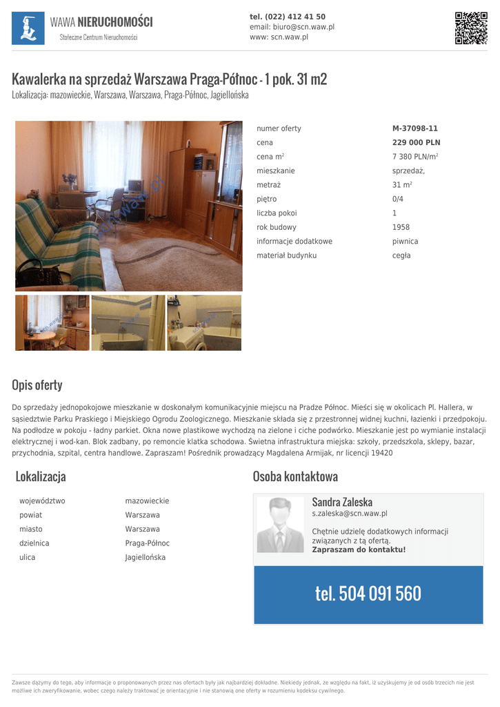 tel. (022) 412 41 50 email: [email protected] www: scn.waw.pl Kawalerka na sprzedaż Warszawa Praga-Północ - 1 pok. 31 m2 Lokalizacja: mazowieckie, Warszawa, Warszawa, Praga-Północ, Jagiellońska numer oferty M-37098-11 cena 229 000 PLN cena m 7 380 PLN/m2 mieszkanie sprzedaż, metraż 31 m2 piętro 0/4 liczba pokoi 1 rok budowy 1958 informacje dodatkowe piwnica materiał budynku cegła 2 Opis oferty Do sprzedaży jednopokojowe mieszkanie w doskonałym komunikacyjnie miejscu na Pradze Północ. Mieści się w okolicach Pl. Hallera, w sąsiedztwie Parku Praskiego i Miejskiego Ogrodu Zoologicznego. Mieszkanie składa się z przestronnej widnej kuchni, łazienki i przedpokoju. Na podłodze w pokoju - ładny parkiet. Okna nowe plastikowe wychodzą na zielone i ciche podwórko. Mieszkanie jest po wymianie instalacji elektrycznej i wod-kan. Blok zadbany, po remoncie klatka schodowa. Świetna infrastruktura miejska: szkoły, przedszkola, sklepy, bazar, przychodnia, szpital, centra handlowe. Zapraszam! Pośrednik prowadzący Magdalena Armijak, nr licencji 19420 Lokalizacja Osoba kontaktowa Sandra Zaleska województwo mazowieckie powiat Warszawa [email protected] miasto Warszawa dzielnica Praga-Północ ulica Jagiellońska Chętnie udzielę dodatkowych informacji związanych z tą ofertą. Zapraszam do kontaktu! tel. 504 091 560 Zawsze dążymy do tego, aby informacje o proponowanych przez nas ofertach były jak najbardziej dokładne. Niekiedy jednak, ze względu na fakt, iż uzyskujemy je od osób trzecich nie jest możliwe ich zweryfikowanie, wobec czego należy traktować je orientacyjnie i nie stanowią one oferty w rozumieniu kodeksu cywilnego.