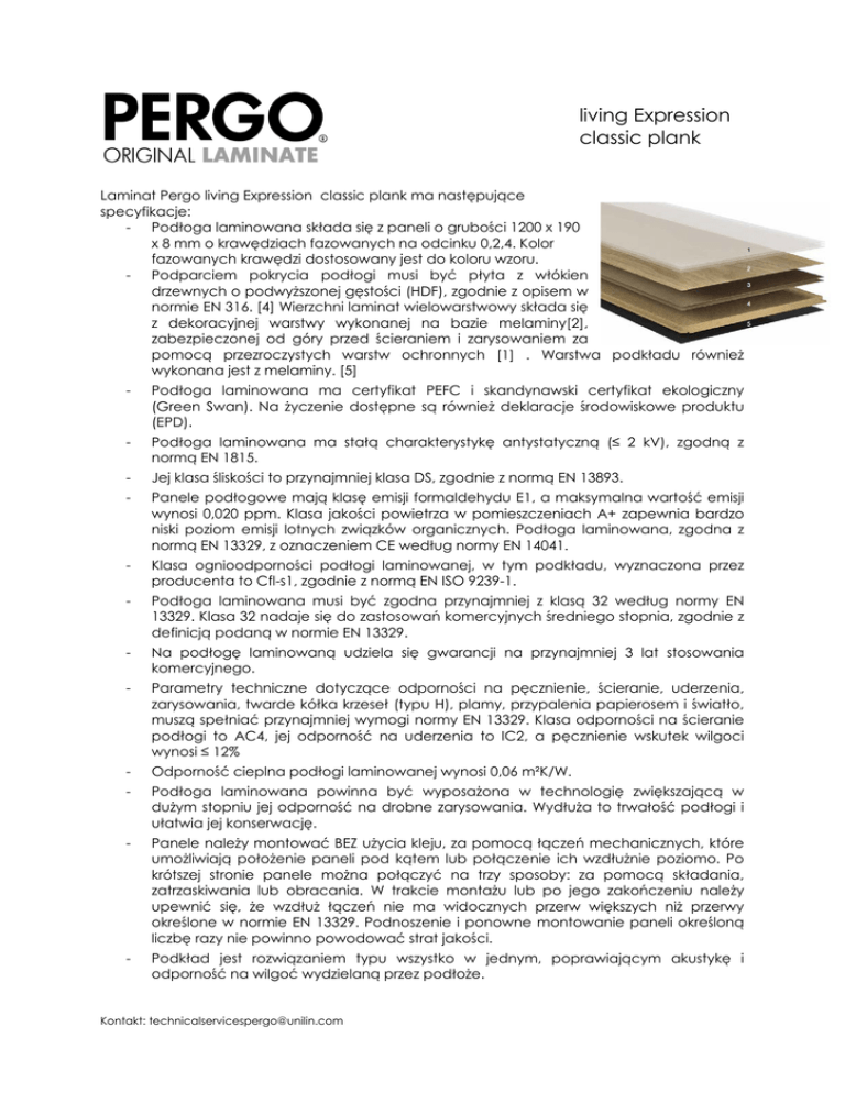 living Expression classic plank Laminat Pergo living Expression classic plank ma następujące specyfikacje: - Podłoga laminowana składa się z paneli o grubości 1200 x 190 x 8 mm o krawędziach fazowanych na odcinku 0,2,4. Kolor fazowanych krawędzi dostosowany jest do koloru wzoru. - Podparciem pokrycia podłogi musi być płyta z włókien drzewnych o podwyższonej gęstości (HDF), zgodnie z opisem w normie EN 316. [4] Wierzchni laminat wielowarstwowy składa się z dekoracyjnej warstwy wykonanej na bazie melaminy[2], zabezpieczonej od góry przed ścieraniem i zarysowaniem za pomocą przezroczystych warstw ochronnych [1] . Warstwa podkładu również wykonana jest z melaminy. [5] - Podłoga laminowana ma certyfikat PEFC i skandynawski certyfikat ekologiczny (Green Swan). Na życzenie dostępne są również deklaracje środowiskowe produktu (EPD). - Podłoga laminowana ma stałą charakterystykę antystatyczną (≤ 2 kV), zgodną z normą EN 1815. - Jej klasa śliskości to przynajmniej klasa DS, zgodnie z normą EN 13893. - Panele podłogowe mają klasę emisji formaldehydu E1, a maksymalna wartość emisji wynosi 0,020 ppm. Klasa jakości powietrza w pomieszczeniach A+ zapewnia bardzo niski poziom emisji lotnych związków organicznych. Podłoga laminowana, zgodna z normą EN 13329, z oznaczeniem CE według normy EN 14041. - Klasa ognioodporności podłogi laminowanej, w tym podkładu, wyznaczona przez producenta to Cfl-s1, zgodnie z normą EN ISO 9239-1. - Podłoga laminowana musi być zgodna przynajmniej z klasą 32 według normy EN 13329. Klasa 32 nadaje się do zastosowań komercyjnych średniego stopnia, zgodnie z definicją podaną w normie EN 13329. - Na podłogę laminowaną udziela się gwarancji na przynajmniej 3 lat stosowania komercyjnego. - Parametry techniczne dotyczące odporności na pęcznienie, ścieranie, uderzenia, zarysowania, twarde kółka krzeseł (typu H), plamy, przypalenia papierosem i światło, muszą spełniać przynajmniej wymogi normy EN 13329. Klasa odporności na ścieranie podłogi to AC4, jej odporność na uderzenia to IC2, a pęcznienie wskutek wilgoci wynosi ≤ 12% - Odporność cieplna podłogi laminowanej wynosi 0,06 m²K/W. - Podłoga laminowana powinna być wyposażona w technologię zwiększającą w dużym stopniu jej odporność na drobne zarysowania. Wydłuża to trwałość podłogi i ułatwia jej konserwację. - Panele należy montować BEZ użycia kleju, za pomocą łączeń mechanicznych, które umożliwiają położenie paneli pod kątem lub połączenie ich wzdłużnie poziomo. Po krótszej stronie panele można połączyć na trzy sposoby: za pomocą składania, zatrzaskiwania lub obracania. W trakcie montażu lub po jego zakończeniu należy upewnić się, że wzdłuż łączeń nie ma widocznych przerw większych niż przerwy określone w normie EN 13329. Podnoszenie i ponowne montowanie paneli określoną liczbę razy nie powinno powodować strat jakości. - Podkład jest rozwiązaniem typu wszystko w jednym, poprawiającym akustykę i odporność na wilgoć wydzielaną przez podłoże. Kontakt: [email protected] - Odstępy od ścian zostaną zasłonięte listwami przyściennymi lub profilami o pasującym do paneli wzorze. Wzór można wybrać z kolekcji living Expression , classic plank. Kontakt: [email protected]