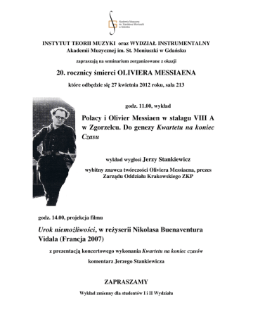 INSTYTUT TEORII MUZYKI oraz WYDZIAŁ INSTRUMENTALNY Akademii Muzycznej im. St. Moniuszki w Gdańsku zapraszają na seminarium zorganizowane z okazji 20. rocznicy śmierci OLIVIERA MESSIAENA które odbędzie się 27 kwietnia 2012 roku, sala 213 godz. 11.00, wykład Polacy i Olivier Messiaen w stalagu VIII A w Zgorzelcu. Do genezy Kwartetu na koniec Czasu wykład wygłosi Jerzy Stankiewicz wybitny znawca twórczości Oliviera Messiaena, prezes Zarządu Oddziału Krakowskiego ZKP godz. 14.00, projekcja filmu Urok niemoŜliwości, w reŜyserii Nikolasa Buenaventura Vidala (Francja 2007) z prezentacją koncertowego wykonania Kwartetu na koniec czasów komentarz Jerzego Stankiewicza ZAPRASZAMY Wykład zmienny dla studentów I i II Wydziału