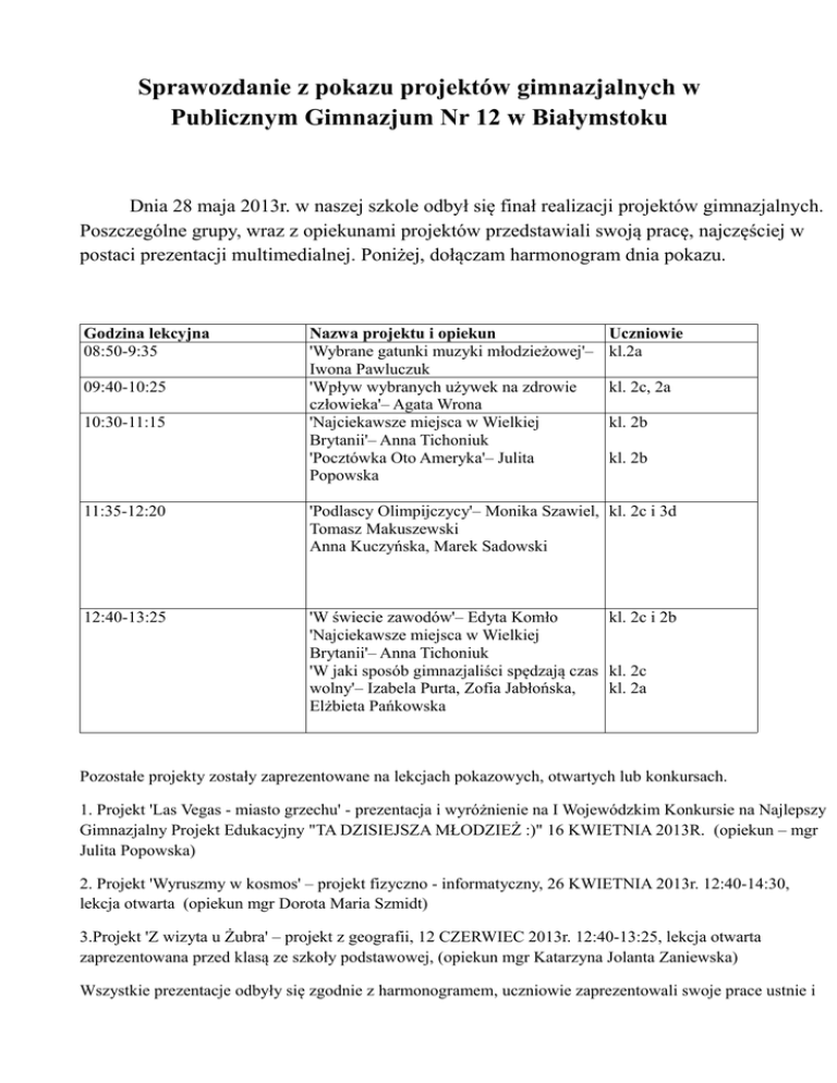 Sprawozdanie z pokazu projektów gimnazjalnych w Publicznym Gimnazjum Nr 12 w Białymstoku Dnia 28 maja 2013r. w naszej szkole odbył się finał realizacji projektów gimnazjalnych. Poszczególne grupy, wraz z opiekunami projektów przedstawiali swoją pracę, najczęściej w postaci prezentacji multimedialnej. Poniżej, dołączam harmonogram dnia pokazu. Godzina lekcyjna 08:50-9:35 09:40-10:25 10:30-11:15 Nazwa projektu i opiekun 'Wybrane gatunki muzyki młodzieżowej'– Iwona Pawluczuk 'Wpływ wybranych używek na zdrowie człowieka'– Agata Wrona 'Najciekawsze miejsca w Wielkiej Brytanii'– Anna Tichoniuk 'Pocztówka Oto Ameryka'– Julita Popowska Uczniowie kl.2a kl. 2c, 2a kl. 2b kl. 2b 11:35-12:20 'Podlascy Olimpijczycy'– Monika Szawiel, kl. 2c i 3d Tomasz Makuszewski Anna Kuczyńska, Marek Sadowski 12:40-13:25 'W świecie zawodów'– Edyta Komło kl. 2c i 2b 'Najciekawsze miejsca w Wielkiej Brytanii'– Anna Tichoniuk 'W jaki sposób gimnazjaliści spędzają czas kl. 2c wolny'– Izabela Purta, Zofia Jabłońska, kl. 2a Elżbieta Pańkowska Pozostałe projekty zostały zaprezentowane na lekcjach pokazowych, otwartych lub konkursach. 1. Projekt 'Las Vegas - miasto grzechu' - prezentacja i wyróżnienie na I Wojewódzkim Konkursie na Najlepszy Gimnazjalny Projekt Edukacyjny "TA DZISIEJSZA MŁODZIEŻ :)" 16 KWIETNIA 2013R. (opiekun – mgr Julita Popowska) 2. Projekt 'Wyruszmy w kosmos' – projekt fizyczno - informatyczny, 26 KWIETNIA 2013r. 12:40-14:30, lekcja otwarta (opiekun mgr Dorota Maria Szmidt) 3.Projekt 'Z wizyta u Żubra' – projekt z geografii, 12 CZERWIEC 2013r. 12:40-13:25, lekcja otwarta zaprezentowana przed klasą ze szkoły podstawowej, (opiekun mgr Katarzyna Jolanta Zaniewska) Wszystkie prezentacje odbyły się zgodnie z harmonogramem, uczniowie zaprezentowali swoje prace ustnie i w postaci prezentacji multimedialnych lub filmów. Jury (p. Dyrektor Bożena Janiak, koordynatorka projektów Julita Popowska, oraz nauczyciele obserwatorzy) przydzielali punkty w następujących kategoriach: oryginalność/pomysł, techniki pracy, poprawność językowa i prezentacja ustna w skali 1-6. 1. Największą liczbę głosów i I miejsce zdobył projekt – film „W świecie zawodów” - 24 punkty. 2. Drugie miejsce przyznano uczniom i prezentacji „Szkocja – najciekawsze miejsca Wielkiej Brytanii” – 23 punkty. 3. Trzecie miejsce otrzymał projekt „Podlascy Olimpijczycy” w wykonaniu jednej z trzech grup – 22 punkty. Dyplomy oraz nagroda dla pierwszego miejsca zostały rozdane 7 czerwca br. w trakcie „Dnia Bez Przemocy”. Opracowanie: mgr Julita Popowska (koordynatorka projektów)
