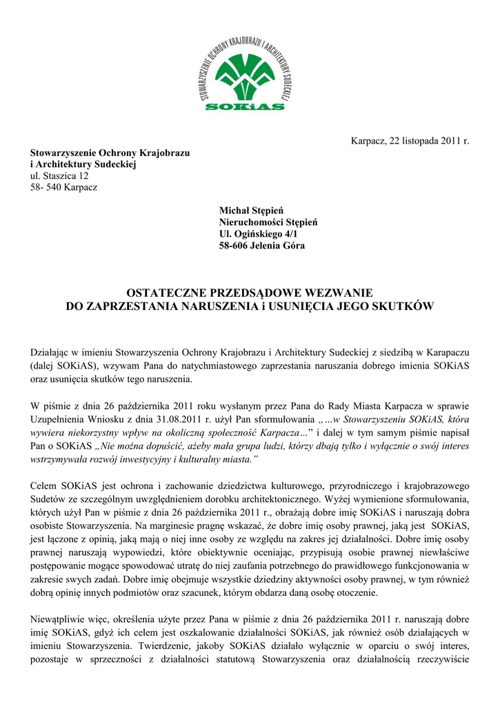 Karpacz, 22 listopada 2011 r. Stowarzyszenie Ochrony Krajobrazu i Architektury Sudeckiej ul. Staszica 12 58- 540 Karpacz Michał Stępień Nieruchomości Stępień Ul. Ogińskiego 4/1 58-606 Jelenia Góra OSTATECZNE PRZEDSĄDOWE WEZWANIE DO ZAPRZESTANIA NARUSZENIA i USUNIĘCIA JEGO SKUTKÓW Działając w imieniu Stowarzyszenia Ochrony Krajobrazu i Architektury Sudeckiej z siedzibą w Karapaczu (dalej SOKiAS), wzywam Pana do natychmiastowego zaprzestania naruszania dobrego imienia SOKiAS oraz usunięcia skutków tego naruszenia. W piśmie z dnia 26 października 2011 roku wysłanym przez Pana do Rady Miasta Karpacza w sprawie Uzupełnienia Wniosku z dnia 31.08.2011 r. użył Pan sformułowania „…w Stowarzyszeniu SOKiAS, która wywiera niekorzystny wpływ na okoliczną społeczność Karpacza…” i dalej w tym samym piśmie napisał Pan o SOKiAS „Nie można dopuścić, ażeby mała grupa ludzi, którzy dbają tylko i wyłącznie o swój interes wstrzymywała rozwój inwestycyjny i kulturalny miasta.” Celem SOKiAS jest ochrona i zachowanie dziedzictwa kulturowego, przyrodniczego i krajobrazowego Sudetów ze szczególnym uwzględnieniem dorobku architektonicznego. Wyżej wymienione sformułowania, których użył Pan w piśmie z dnia 26 października 2011 r., obrażają dobre imię SOKiAS i naruszają dobra osobiste Stowarzyszenia. Na marginesie pragnę wskazać, że dobre imię osoby prawnej, jaką jest SOKiAS, jest łączone z opinią, jaką mają o niej inne osoby ze względu na zakres jej działalności. Dobre imię osoby prawnej naruszają wypowiedzi, które obiektywnie oceniając, przypisują osobie prawnej niewłaściwe postępowanie mogące spowodować utratę do niej zaufania potrzebnego do prawidłowego funkcjonowania w zakresie swych zadań. Dobre imię obejmuje wszystkie dziedziny aktywności osoby prawnej, w tym również dobrą opinię innych podmiotów oraz szacunek, którym obdarza daną osobę otoczenie. Niewątpliwie więc, określenia użyte przez Pana w piśmie z dnia 26 października 2011 r. naruszają dobre imię SOKiAS, gdyż ich celem jest oszkalowanie działalności SOKiAS, jak również osób działających w imieniu Stowarzyszenia. Twierdzenie, jakoby SOKiAS działało wyłącznie w oparciu o swój interes, pozostaje w sprzeczności z działalności statutową Stowarzyszenia oraz działalnością rzeczywiście podejmowaną przez SOKiAS w celu realizacji zadań związanych z ochroną i zachowaniem dziedzictwa kulturowego, przyrodniczego i krajobrazowego Sudetów, ze szczególnym uwzględnieniem dorobku architektonicznego. Zgodnie z statutem SOKiAS ma na celu utrzymanie niepowtarzalnego charakteru tego regionu dla przyszłych pokoleń. Tym bardziej, przy uwzględnieniu powyższych okoliczności, zarzucanie SOKiAS zamiaru wstrzymania rozwoju inwestycyjnego i kulturalnego miasta Karpacz stanowi naruszenie dobrego imienia. Oceniając naruszenie dobrej sławy należy uwzględnić nie tylko znaczenie użytych słów, ale także cały kontekst sytuacyjny oraz jego społeczny odbiór. Do naruszenia dobrego imienia może dojść również w drodze pisma skierowanego do urzędu, w tym również w sytuacjach, w których pismo to nie podlegało publikacji. Użycie wymienionych wyżej sformułowań w piśmie skierowanym do Rady Miasta Karpacza w sytuacji w której SOKiAS reprezentuje mieszkańców Karpacza, którzy negatywnie oceniają zamierzenia inwestycyjne pana Jerry Nowikovsky, stanowi nadużycie prawa do wyrażania własnej opinii. Każda osoba fizyczna i prawna ma prawo do dokonywania samodzielnej oceny poczynań innej osoby i fakt braku poparcia dla działań podejmowanych przez inną osobę nie stanowi podstawy do naruszenia jej dobrego imienia. Mając zatem na uwadze powyższe okoliczności, wzywam Pana, na podstawie art. 24 k.c., do zaprzestania naruszania dobrego imienia SOKiAS i usunięcia skutków tego naruszenia. W celu usunięcia skutków dokonanego naruszenia żądam pisemnych przeprosin skierkowanych do SOKiAS oraz sprostowania powyższych stwierdzeń w piśmie skierowanym do Rady Miasta Karpacza. Powyższe należy wykonać niezwłocznie, jednakże nie później niż do dnia 2 grudnia 2011 r. Jednocześnie zaznaczam, iż niezastosowanie się do niniejszego wezwania spowoduje wstąpienie na drogę postępowania sądowego z roszczeniem o zaprzestanie dokonywania przez Pana naruszeń, usunięcia skutków naruszeń oraz naprawienia wynikłej stąd szkody, w tym zapłaty stosownego zadośćuczynienia. Mirosław Rzepka /v-ce presez SOKiAS/ Anna Bialikiewicz-Stoch /członek Zarządu/ Załączniki: 1) wydruk pisma z dnia 26 października w sprawie Uzupełnienia Wniosku z dnia 31.08.2011 r. Otrzymują: 1) Adresat, 2) Rada Miasta Karpacz. 3) a/a