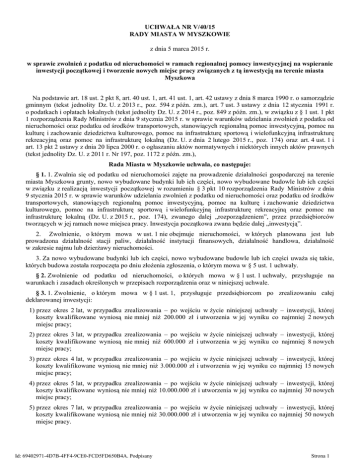 UCHWAŁA NR V/40/15 RADY MIASTA W MYSZKOWIE z dnia 5 marca 2015 r. w sprawie zwolnień z podatku od nieruchomości w ramach regionalnej pomocy inwestycyjnej na wspieranie inwestycji początkowej i tworzenie nowych miejsc pracy związanych z tą inwestycją na terenie miasta Myszkowa Na podstawie art. 18 ust. 2 pkt 8, art. 40 ust. 1, art. 41 ust. 1, art. 42 ustawy z dnia 8 marca 1990 r. o samorządzie gminnym (tekst jednolity Dz. U. z 2013 r., poz. 594 z późn. zm.), art. 7 ust. 3 ustawy z dnia 12 stycznia 1991 r. o podatkach i opłatach lokalnych (tekst jednolity Dz. U. z 2014 r., poz. 849 z późn. zm.), w związku z § 1 ust. 1 pkt 1 rozporządzenia Rady Ministrów z dnia 9 stycznia 2015 r. w sprawie warunków udzielania zwolnień z podatku od nieruchomości oraz podatku od środków transportowych, stanowiących regionalną pomoc inwestycyjną, pomoc na kulturę i zachowanie dziedzictwa kulturowego, pomoc na infrastrukturę sportową i wielofunkcyjną infrastrukturę rekreacyjną oraz pomoc na infrastrukturę lokalną (Dz. U. z dnia 2 lutego 2015 r., poz. 174) oraz art. 4 ust. 1 i art. 13 pkt 2 ustawy z dnia 20 lipca 2000 r. o ogłaszaniu aktów normatywnych i niektórych innych aktów prawnych (tekst jednolity Dz. U. z 2011 r. Nr 197, poz. 1172 z późn. zm.), Rada Miasta w Myszkowie uchwala, co następuje: § 1. 1. Zwalnia się od podatku od nieruchomości zajęte na prowadzenie działalności gospodarczej na terenie miasta Myszkowa grunty, nowo wybudowane budynki lub ich części, nowo wybudowane budowle lub ich części w związku z realizacją inwestycji początkowej w rozumieniu § 3 pkt 10 rozporządzenia Rady Ministrów z dnia 9 stycznia 2015 r. w sprawie warunków udzielania zwolnień z podatku od nieruchomości oraz podatku od środków transportowych, stanowiących regionalną pomoc inwestycyjną, pomoc na kulturę i zachowanie dziedzictwa kulturowego, pomoc na infrastrukturę sportową i wielofunkcyjną infrastrukturę rekreacyjną oraz pomoc na infrastrukturę lokalną (Dz. U. z 2015 r., poz. 174), zwanego dalej „rozporządzeniem”, przez przedsiębiorców tworzących w jej ramach nowe miejsca pracy. Inwestycja początkowa zwana będzie dalej „inwestycją”. 2. Zwolnienie, o którym mowa w ust. 1 nie obejmuje nieruchomości, w których planowana jest lub prowadzona działalność stacji paliw, działalność instytucji finansowych, działalność handlowa, działalność w zakresie najmu lub dzierżawy nieruchomości. 3. Za nowo wybudowane budynki lub ich części, nowo wybudowane budowle lub ich części uważa się takie, których budowa została rozpoczęta po dniu złożenia zgłoszenia, o którym mowa w § 5 ust. 1 uchwały. § 2. Zwolnienie od podatku od nieruchomości, o których mowa w § 1 ust. 1 uchwały, przysługuje na warunkach i zasadach określonych w przepisach rozporządzenia oraz w niniejszej uchwale. § 3. 1. Zwolnienie, o którym mowa w § 1 ust. 1, przysługuje przedsiębiorcom po zrealizowaniu całej deklarowanej inwestycji: 1) przez okres 2 lat, w przypadku zrealizowania – po wejściu w życie niniejszej uchwały – inwestycji, której koszty kwalifikowane wyniosą nie mniej niż 200.000 zł i utworzenia w jej wyniku co najmniej 2 nowych miejsc pracy; 2) przez okres 3 lat, w przypadku zrealizowania – po wejściu w życie niniejszej uchwały – inwestycji, której koszty kwalifikowane wyniosą nie mniej niż 600.000 zł i utworzenia w jej wyniku co najmniej 8 nowych miejsc pracy; 3) przez okres 4 lat, w przypadku zrealizowania – po wejściu w życie niniejszej uchwały – inwestycji, której koszty kwalifikowane wyniosą nie mniej niż 3.000.000 zł i utworzenia w jej wyniku co najmniej 15 nowych miejsc pracy; 4) przez okres 5 lat, w przypadku zrealizowania – po wejściu w życie niniejszej uchwały – inwestycji, której koszty kwalifikowane wyniosą nie mniej niż 10.000.000 zł i utworzenia w jej wyniku co najmniej 30 nowych miejsc pracy; 5) przez okres 7 lat, w przypadku zrealizowania – po wejściu w życie niniejszej uchwały – inwestycji, której koszty kwalifikowane wyniosą nie mniej niż 30.000.000 zł i utworzenia w jej wyniku co najmniej 50 nowych miejsc pracy. Id: 69402971-4D7B-4FF4-9CE0-FCD5FD650B4A. Podpisany Strona 1 2. Zwolnienie od podatku od nieruchomości, o którym mowa w § 1 następuje na podstawie złożonej deklaracji lub informacji na podatek od nieruchomości zawierającej dane o nieruchomościach korzystających ze zwolnienia w podatku od nieruchomości. 3. Łączna wartość pomocy udzielonej przedsiębiorcy na daną inwestycję początkową nie może przekroczyć równowartości dopuszczalnej wartości pomocy, o której mowa w rozporządzeniu. § 4. Zwolnienie, o którym mowa w § 1 ust. 1, przysługuje od dnia 1 stycznia roku następującego po roku, w którym inwestycja została zrealizowana, z uwzględnieniem dnia powstania obowiązku podatkowego zgodnie z przepisami ustawy z dnia 12 stycznia 1991 r. o podatkach i opłatach lokalnych - nie dłużej jednak niż do końca miesiąca poprzedzającego miesiąc, w którym przekroczono maksymalną intensywność pomocy, o której mowa w § 11 ust. 2 rozporządzenia lub w przypadku dużego projektu inwestycyjnego maksymalną wielkość pomocy, o której mowa w § 11 ust. 3 rozporządzenia. § 5. 1. Przedsiębiorca ubiegający się o pomoc na podstawie uchwały zobowiązany jest do zgłoszenia organowi podatkowemu przed rozpoczęciem prac związanych z inwestycją zamiaru korzystania z tej pomocy w formie pisemnej – na formularzu, którego wzór stanowi Załącznik nr 1 do uchwały, wraz z wymaganymi załącznikami, najpóźniej do 31.12.2020 r. 2. Przedsiębiorca zobowiązany jest do złożenia dokumentów niezbędnych do udzielenia pomocy, o których mowa w rozporządzeniu Rady Ministrów z 29 marca 2010 r. w sprawie zakresu informacji przedstawianych przez podmiot ubiegający się o pomoc inną niż pomoc de minimis lub pomoc de minimis w rolnictwie 
