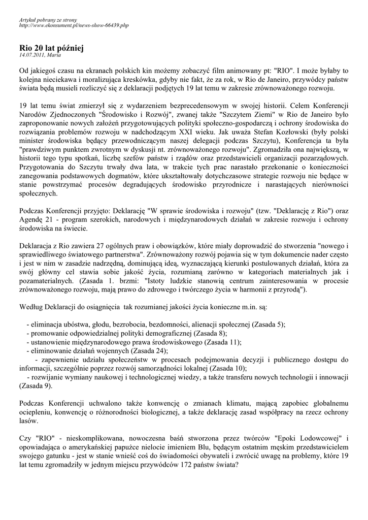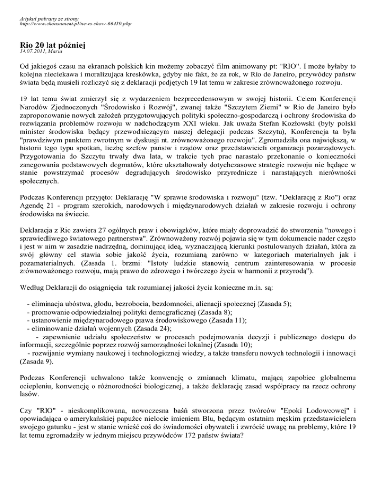 Artykuł pobrany ze strony http://www.ekonsument.pl/news-show-66439.php Rio 20 lat później 14.07.2011, Maria Od jakiegoś czasu na ekranach polskich kin możemy zobaczyć film animowany pt: "RIO". I może byłaby to kolejna nieciekawa i moralizująca kreskówka, gdyby nie fakt, że za rok, w Rio de Janeiro, przywódcy państw świata będą musieli rozliczyć się z deklaracji podjętych 19 lat temu w zakresie zrównoważonego rozwoju. 19 lat temu świat zmierzył się z wydarzeniem bezprecedensowym w swojej historii. Celem Konferencji Narodów Zjednoczonych "Środowisko i Rozwój", zwanej także "Szczytem Ziemi" w Rio de Janeiro było zaproponowanie nowych założeń przygotowujących polityki społeczno-gospodarczą i ochrony środowiska do rozwiązania problemów rozwoju w nadchodzącym XXI wieku. Jak uważa Stefan Kozłowski (były polski minister środowiska będący przewodniczącym naszej delegacji podczas Szczytu), Konferencja ta była "prawdziwym punktem zwrotnym w dyskusji nt. zrównoważonego rozwoju". Zgromadziła ona największą, w historii tego typu spotkań, liczbę szefów państw i rządów oraz przedstawicieli organizacji pozarządowych. Przygotowania do Szczytu trwały dwa lata, w trakcie tych prac narastało przekonanie o konieczności zanegowania podstawowych dogmatów, które ukształtowały dotychczasowe strategie rozwoju nie będące w stanie powstrzymać procesów degradujących środowisko przyrodnicze i narastających nierówności społecznych. Podczas Konferencji przyjęto: Deklarację "W sprawie środowiska i rozwoju" (tzw. "Deklarację z Rio") oraz Agendę 21 - program szerokich, narodowych i międzynarodowych działań w zakresie rozwoju i ochrony środowiska na świecie. Deklaracja z Rio zawiera 27 ogólnych praw i obowiązków, które miały doprowadzić do stworzenia "nowego i sprawiedliwego światowego partnerstwa". Zrównoważony rozwój pojawia się w tym dokumencie nader często i jest w nim w zasadzie nadrzędną, dominującą ideą, wyznaczającą kierunki postulowanych działań, która za swój główny cel stawia sobie jakość życia, rozumianą zarówno w kategoriach materialnych jak i pozamaterialnych. (Zasada 1. brzmi: "Istoty ludzkie stanowią centrum zainteresowania w procesie zrównoważonego rozwoju, mają prawo do zdrowego i twórczego życia w harmonii z przyrodą"). Według Deklaracji do osiągnięcia tak rozumianej jakości życia konieczne m.in. są: - eliminacja ubóstwa, głodu, bezrobocia, bezdomności, alienacji społecznej (Zasada 5); - promowanie odpowiedzialnej polityki demograficznej (Zasada 8); - ustanowienie międzynarodowego prawa środowiskowego (Zasada 11); - eliminowanie działań wojennych (Zasada 24); - zapewnienie udziału społeczeństw w procesach podejmowania decyzji i publicznego dostępu do informacji, szczególnie poprzez rozwój samorządności lokalnej (Zasada 10); - rozwijanie wymiany naukowej i technologicznej wiedzy, a także transferu nowych technologii i innowacji (Zasada 9). Podczas Konferencji uchwalono także konwencję o zmianach klimatu, mającą zapobiec globalnemu ociepleniu, konwencję o różnorodności biologicznej, a także deklarację zasad współpracy na rzecz ochrony lasów. Czy "RIO" - nieskomplikowana, nowoczesna baśń stworzona przez twórców "Epoki Lodowcowej" i opowiadająca o amerykańskiej papużce nielocie imieniem Blu, będącym ostatnim męskim przedstawicielem swojego gatunku - jest w stanie wnieść coś do świadomości obywateli i zwrócić uwagę na problemy, które 19 lat temu zgromadziły w jednym miejscu przywódców 172 państw świata? Czy ci przywódcy, zgodnie z podpisaną deklaracją, zrobili wszystko, aby się z tymi problemami zmierzyć? Już za rok będą musiały paść odpowiedzi na te, a także inne ważne pytania. A wszystkich, którzy nie wybierają się na wakacje do Rio odsyłamy do kin na "RIO".