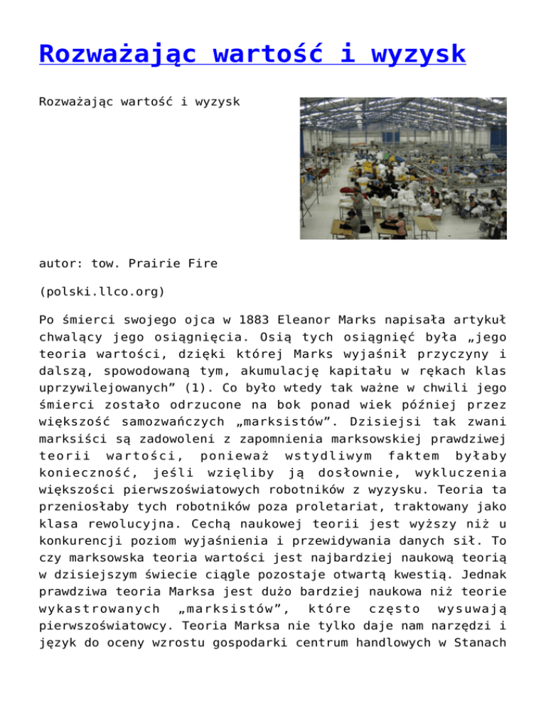 Rozważając wartość i wyzysk Rozważając wartość i wyzysk autor: tow. Prairie Fire (polski.llco.org) Po śmierci swojego ojca w 1883 Eleanor Marks napisała artykuł chwalący jego osiągnięcia. Osią tych osiągnięć była „jego teoria wartości, dzięki której Marks wyjaśnił przyczyny i dalszą, spowodowaną tym, akumulację kapitału w rękach klas uprzywilejowanych” (1). Co było wtedy tak ważne w chwili jego śmierci zostało odrzucone na bok ponad wiek później przez większość samozwańczych „marksistów”. Dzisiejsi tak zwani marksiści są zadowoleni z zapomnienia marksowskiej prawdziwej teorii wartości, ponieważ wstydliwym faktem byłaby konieczność, jeśli wzięliby ją dosłownie, wykluczenia większości pierwszoświatowych robotników z wyzysku. Teoria ta przeniosłaby tych robotników poza proletariat, traktowany jako klasa rewolucyjna. Cechą naukowej teorii jest wyższy niż u konkurencji poziom wyjaśnienia i przewidywania danych sił. To czy marksowska teoria wartości jest najbardziej naukową teorią w dzisiejszym świecie ciągle pozostaje otwartą kwestią. Jednak prawdziwa teoria Marksa jest dużo bardziej naukowa niż teorie wykastrowanych „marksistów”, które często wysuwają pierwszoświatowcy. Teoria Marksa nie tylko daje nam narzędzi i język do oceny wzrostu gospodarki centrum handlowych w Stanach Zjednoczonych i innych krajach Pierwszego Świata, ale także pomaga nam przewidzieć i wyjaśnić brak rewolucyjnego sentymentu wśród ogromnej większości pierwszoświatowców. Marksowska teoria wartości jest astronomią przy astrologii pierwszoświatowych wróżbitów. Eleanor Marks tak opisuje źródło wartości w kapitalizmie. „Suma, która wkracza do kieszeni kapitalisty jest nazywana przez Marksa wartością dodatkową. Nie jest to cały zysk, ale kwota ta zysk zawiera. Musi on podzielić się nim z innymi: z rządem w postaci rat i podatków, z właścicielem nieruchomości w postaci czynszu, z kupcem itp… Dlatego, wszystkie klasy społeczeństwa, które nie są związane z rzeczywistymi i bezpośrednimi producentami dóbr.. wszystkie klasy, od królów i królowych do muzyków i sprzedawców warzyw, żyją z odpowiednich części tej wartości dodatkowej. Innymi słowy, żyją dzięki sieci producentów pracy dodatkowej, którą kapitaliści wyzyskują ze swoich robotników, ale za którą im nie płacą. Nie jest ważne to, czy udział z zysków osiągniętych poprzez dodatkową pracę członek społeczeństwa dostanie jako dar ustawowy ze środków publicznych, czy dzięki pracy na stanowiskach, które nie są produkcyjne. Nie ma żadnego funduszu z którego mogliby być opłacani poza sumą totalnej wartości dodatkowej stworzoną przez bezpośrednich producentów, za którą nie są oni opłacani” (2) Według zarówno Karola jak i Eleanor Marksów, wartość która umożliwia istnienie społeczeństwa ma tylko jedno źródło: „bezpośrednich producentów wartości”. W Anglii czasów Marksa klasa ta składała się głównie z robotników przemysłowych żyjących z pracy najemnej – wliczając w to robotników na farmach przemysłowych, od kiedy chłopscy bezpośredni producenci zeszli ze sceny. Marks przewidział, że trendy których doświadczył w Europie Zachodniej zaistnieją globalnie. Myślał, że społeczeństwo spolaryzuje się w dwie wielkie klasy, przemysłowych kapitalistów i ich robotników. Dlatego wraz z rozwojem kapitalizmu typowy bezpośredni producent będzie reprezentowany przez robotnika przemysłowego. Dlatego widział przemysłową klasę robotniczą jako proletariat, agenta rewolucji. Marks myślał również, że konkurencja i w końcu rozwój wyrówna się z kraju na kraj. Dlatego rewolucja była sprawą „połączenia się proletariuszy wszystkich krajów”. Jednak sprawy nie potoczyły się dokładnie tak jak Marks przewidział. Zawsze warto pamiętać, że wiele z konkluzji Marksa pojawiło się ponieważ oszacowywał je na podstawie abstrakcyjnych modeli, dokładnie tak samo jak dzisiejsi ekonomiści. To, oraz duża dawka teleologii kształtowała jego poglądy. Jednak prawdziwy świat jest dużo bardziej skomplikowany. Globalne społeczeństwo nie spolaryzowało się w sposób przewidziany przez Marksa. W zamian istnieją rozmaite konfiguracje społeczeństw klasowych różnych w zależności od kraju. W niektórych państwach jest w sumie bardzo mało bezpośrednich producentów. Są to pierwszoświatowe gospodarki centrów handlowych. Fabryki nie są już dominujące w życiu mieszkańców Pierwszego Świata. W rzeczywistości bardzo mały procent pierwszoświatowców pracuje w fabrykach. Dużo większa ich liczba jest zatrudniona w zarządzaniu, usługach itp. Może być to opisane w terminologii Marksa, jako spadek procentu populacji zaangażowanej w pracę produkcyjną, pracę która wnosi coś do totalnego produktu społecznego. Wielu gospodarek Pierwszego Świata może być opisana jako zdominowana przez centra handlowa. Nic, albo bardzo mało jest produkowane w centrum handlowych. Ludzie są tam zatrudniani w zarządzaniu, transporcie, ochronie itp. a dobra produkowane są gdzie indziej, jednak sprzedawana w centrum handlowym. To przypływ dóbr spoza centrum pozwala mu funkcjonować. Produkcja jest usytuowana poza centrum handlowym, w Trzecim Świecie. To właśnie zanik bezpośredniej produkcji, który współgrał z zanikiem rewolucyjnej świadomości skłonił Fryderyka Engelsa do określenia angielskiej klasy robotniczej jako zburżuazyjniałej na placach Indii i reszty świata. O angielskich robotnikach Engels napisał “robotnicy najspokojniej w świecie korzystają wraz z nimi z kolonialnego monopolu Anglii i z jej monopolu na rynku światowym”. Mimo, że Marks mylił się w kwestiach unitarnego rozwoju i polaryzacji klasowej, jego teoria wartości pozostała ważna dla dzisiejszego świata. Gospodarka światowa składa się z łańcuchów powiązań e