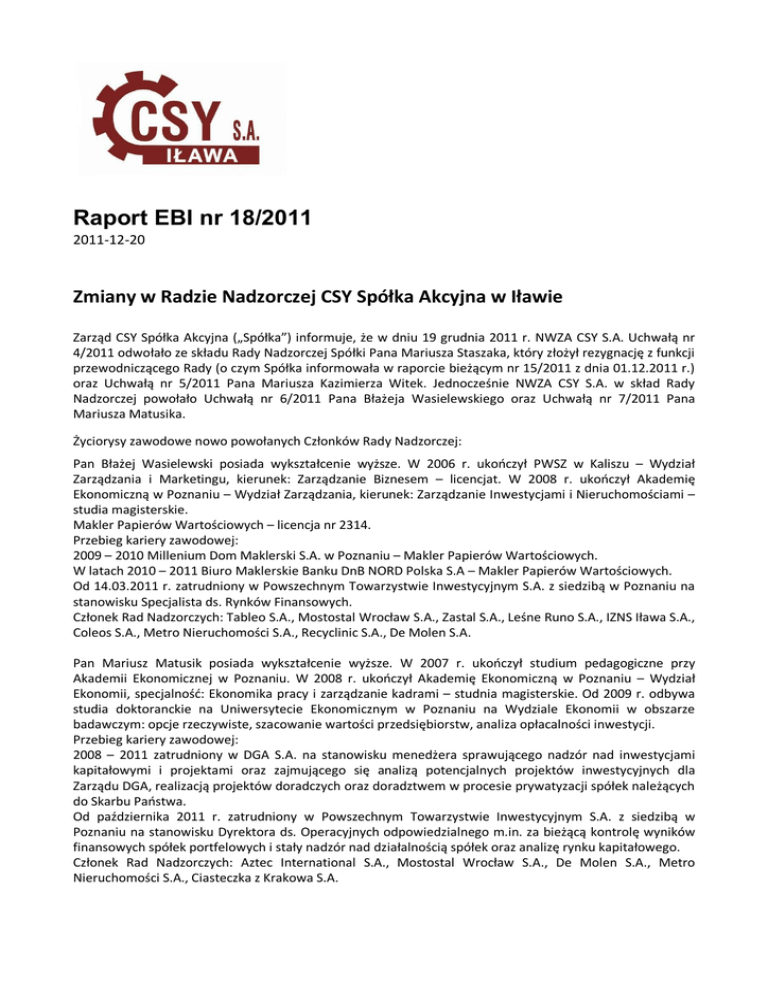 Raport EBI nr 18/2011 2011-12-20 Zmiany w Radzie Nadzorczej CSY Spółka Akcyjna w Iławie Zarząd CSY Spółka Akcyjna („Spółka”) informuje, że w dniu 19 grudnia 2011 r. NWZA CSY S.A. Uchwałą nr 4/2011 odwołało ze składu Rady Nadzorczej Spółki Pana Mariusza Staszaka, który złożył rezygnację z funkcji przewodniczącego Rady (o czym Spółka informowała w raporcie bieżącym nr 15/2011 z dnia 01.12.2011 r.) oraz Uchwałą nr 5/2011 Pana Mariusza Kazimierza Witek. Jednocześnie NWZA CSY S.A. w skład Rady Nadzorczej powołało Uchwałą nr 6/2011 Pana Błażeja Wasielewskiego oraz Uchwałą nr 7/2011 Pana Mariusza Matusika. Życiorysy zawodowe nowo powołanych Członków Rady Nadzorczej: Pan Błażej Wasielewski posiada wykształcenie wyższe. W 2006 r. ukończył PWSZ w Kaliszu – Wydział Zarządzania i Marketingu, kierunek: Zarządzanie Biznesem – licencjat. W 2008 r. ukończył Akademię Ekonomiczną w Poznaniu – Wydział Zarządzania, kierunek: Zarządzanie Inwestycjami i Nieruchomościami – studia magisterskie. Makler Papierów Wartościowych – licencja nr 2314. Przebieg kariery zawodowej: 2009 – 2010 Millenium Dom Maklerski S.A. w Poznaniu – Makler Papierów Wartościowych. W latach 2010 – 2011 Biuro Maklerskie Banku DnB NORD Polska S.A – Makler Papierów Wartościowych. Od 14.03.2011 r. zatrudniony w Powszechnym Towarzystwie Inwestycyjnym S.A. z siedzibą w Poznaniu na stanowisku Specjalista ds. Rynków Finansowych. Członek Rad Nadzorczych: Tableo S.A., Mostostal Wrocław S.A., Zastal S.A., Leśne Runo S.A., IZNS Iława S.A., Coleos S.A., Metro Nieruchomości S.A., Recyclinic S.A., De Molen S.A. Pan Mariusz Matusik posiada wykształcenie wyższe. W 2007 r. ukończył studium pedagogiczne przy Akademii Ekonomicznej w Poznaniu. W 2008 r. ukończył Akademię Ekonomiczną w Poznaniu – Wydział Ekonomii, specjalność: Ekonomika pracy i zarządzanie kadrami – studnia magisterskie. Od 2009 r. odbywa studia doktoranckie na Uniwersytecie Ekonomicznym w Poznaniu na Wydziale Ekonomii w obszarze badawczym: opcje rzeczywiste, szacowanie wartości przedsiębiorstw, analiza opłacalności inwestycji. Przebieg kariery zawodowej: 2008 – 2011 zatrudniony w DGA S.A. na stanowisku menedżera sprawującego nadzór nad inwestycjami kapitałowymi i projektami oraz zajmującego się analizą potencjalnych projektów inwestycyjnych dla Zarządu DGA, realizacją projektów doradczych oraz doradztwem w procesie prywatyzacji spółek należących do Skarbu Państwa. Od października 2011 r. zatrudniony w Powszechnym Towarzystwie Inwestycyjnym S.A. z siedzibą w Poznaniu na stanowisku Dyrektora ds. Operacyjnych odpowiedzialnego m.in. za bieżącą kontrolę wyników finansowych spółek portfelowych i stały nadzór nad działalnością spółek oraz analizę rynku kapitałowego. Członek Rad Nadzorczych: Aztec International S.A., Mostostal Wrocław S.A., De Molen S.A., Metro Nieruchomości S.A., Ciasteczka z Krakowa S.A. Jednocześnie Zarząd informuje, iż wszyscy nowo powołani członkowie Rady Nadzorczej złożyli oświadczenia, iż nie wykonują działalności konkurencyjnej w stosunku do CSY Spółka Akcyjna z siedzibą w Iławie, nie uczestniczą w spółce konkurencyjnej jako wspólnik spółki cywilnej, spółki osobowej lub jako członek organu spółki kapitałowej, ani też nie uczestniczą w innej konkurencyjnej osobie prawnej jako członek jej organu. Oświadczyli również, że nie zostali wpisani do rejestru dłużników niewypłacalnych, prowadzonego na podstawie ustawy o Krajowym Rejestrze Sądowym Podstawa prawna: Art. 56 ust. 1 pkt 2 Ustawy o ofercie – informacje bieżące i okresowe Osoby reprezentujące spółkę: Grzegorz Wrona - Prezes Zarządu