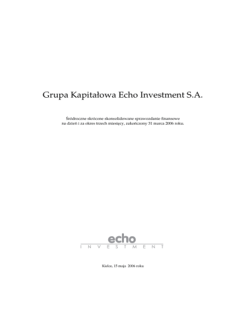 Grupa Kapitałowa Echo Investment S.A. ródroczne skrócone skonsolidowane sprawozdanie finansowe na dzie i za okres trzech miesi cy, zako czony 31 marca 2006 roku. Kielce, 15 maja 2006 roku Grupa Kapitałowa Echo Investment S.A. SA–QSr 1Q–2006 tys. zł 1. Skrócony skonsolidowany bilans w tys. zł Aktywa 1. Aktywa trwałe stan na 2006.03.31 koniec kwartału 1.1. Warto ci niematerialne i prawne 1.2. Warto firmy jednostek podporz dkowanych 1.3. Rzeczowe aktywa trwałe 1.4. Nale no ci długoterminowe 1.5. Nieruchomo ci inwestycyjne 1.6. Długoterminowe aktywa finansowe 1.7. Aktywa z tytułu odroczonego podatku dochodowego stan na 2005.12.31koniec poprzedniego roku stan na 2005.03.31koniec kwartału 69 85 51 - - - 262 808 245 081 241 031 - - 2 577 1 428 799 1 400 398 1 176 627 17 746 17 747 20 813 15 843 1 725 265 15 613 1 678 924 11 930 1 453 029 156 508 170 595 163 377 30 943 35 184 8 681 10 452 2. Aktywa obrotowe 2.1. Zapasy 2.2. Nale no ci z tytułu podatków 2.3. Nale no ci z tyt. dostaw i usług i inne 9 383 13 794 2.4. Krótkoterminowe inwestycje finansowe 7 644 7 889 1 468 2.5. Rozliczenia mi dzyokresowe 7 442 831 7 205 324 518 536 438 242 483 470 776 353 669 544 852 2 261 703 2 149 700 1 997 881 781 696 2.6. rodki pieni ne i inne aktywa pieni ne Aktywa razem Pasywa 1. Kapitał własny 1.1. Kapitał własny przypisany akcjonariuszom jednostki dominuj cej 973 887 917 103 1.1.1. Kapitał zakładowy 21 000 21 000 21 000 1.1.2. Kapitał zapasowy 353 771 353 771 319 084 1.1.3. Niepodzielony zysk (strata) z lat ubiegłych 542 332 347 918 382 605 56 784 194 414 59 007 19 152 993 039 18 145 935 248 1 946 783 642 2.1. Rezerwa z tytułu odroczonego podatku dochodowego 132 013 125 972 96 276 2.2. Pozostałe rezerwy 28 408 160 421 30 797 156 769 42 694 138 970 3.1. Zobowi zania finansowe 806 983 685 010 681 553 3.2. Pozostałe zobowi zania 28 535 835 518 29 255 714 265 10 366 691 919 4.1. Zobowi zania finansowe 121 961 152 992 169 332 4.2. Zobowi zania podatkowe 18 110 57 499 74 614 4.3. Zobowi zania z tyt. dostaw i usług 33 573 27 878 32 521 4.4. Pozostałe zobowi zania 99 081 105 049 106 883 272 725 343 418 383 350 2 261 703 2 149 700 1 997 881 1.1.4. Zysk (strata) roku bie cego 1.2. Kapitały mniejszo ci 2. Rezerwy 3. Zobowi zania długoterminowe 4. Zobowi zania krótkoterminowe Pasywa razem 2 Grupa Kapitałowa Echo Investment S.A. Warto SA–QSr 1Q–2006 tys. zł ksi gowa Liczba akcji Warto ksi gowa na jedn akcj (w zł) Rozwodniona liczba akcji Rozwodniona warto ksi gowa na jedn akcj (w zł) 973 887 917 103 781 696 10 500 000 10 500 000 10 500 000 92,75 87,34 74,45 10 500 000 10 500 000 10 500 000 92,75 87,34 74,45 stan na 2005.12.31 koniec poprzedniego roku stan na 2006.03.31 koniec kwartału POZYCJE POZABILANSOWE w tys. zł stan na 2005.03.31 koniec kwartału 1. Nale no ci pozabilansowe 2. Zobowi zania pozabilansowe 17 048 24 809 14 955 2. Skrócony skonsolidowany rachunek zysków i strat w tys. zł 1 kwartał okres od 2006.01.01 do 2006.03.31 Przychody operacyjne Koszty operacyjne Zysk (strata) brutto ze sprzeda y 1 kwartał okres od 2006.01.01 do 2006.03. 1 kwartał okres od 2005.01.01 do 2005.03.31 1 kwartał okres od 2005.01.01 do 2005.03.31 90 919 90 919 57 179 57 179 (39 703) (39 703) (18 041) (18 041) 51 216 51 216 39 138 39 138 Zysk (strata) ze sprzeda y nieruchomo ci 9 512 9 512 62 641 62 641 Aktualizacji warto ci nieruchomo ci 43 477 43 477 (11) Koszty sprzeda y (2 282) (2 282) (11) (2 001) - (2 001) Koszty ogólnego zarz du Pozostałe przychody (koszty) operacyjne Zysk przed opodatkowaniem i uwzgl dnieniem przychodów/kosztów finansowych (7 920) (7 920) (6 426) (6 426) (6 512) (6 512) 59 59 87 491 87 491 93 400 93 400 Przychody finansowe 2 403 2 403 2 615 2 615 (12 026) (12 026) (14 305) (14 305) (5 725) (5 725) (3 516) (3 516) - - (3 073) (3 073) - - - - Zysk (strata) brutto 72 143 72 143 75 121 75 121 Podatek dochodowy (14 352) (14 352) (15 695) (15 695) 57 791 57 791 59 426 59 426 1 007 1 007 419 419 56 784 59 007 59 007 Koszty finansowe Zysk (strata) z tytułu ró nic kursowych Aktualizacja warto ci firmy jednostek podporz dkowanych Udział w zysku jednostek stowarzyszonych Zysk (strata) netto 1. Zysk (strata) przypadaj cy akcjonariuszom mniejszo ciowym 2. Zysk (strata) przypadaj cy akcjonariuszom jednostki dominuj cej Zysk (strata) netto (zanualizowany) 56 784 192 191 49 742 3 Grupa Kapitałowa Echo Investment S.A. SA–QSr 1Q–2006 tys. zł 3. Skrócone zestawienie zmian w skonsolidowanym kapitale własnym w tys. zł Kapitał zakładowy Za 1 kwartał (rok bie Kapitał zapasowy Niepodzielony zysk (strata) z lat ubiegłych Kapitał własny Zysk przypisany Kapitały (strata) akcjonariuszom mniejszo ci roku jednostki bie cego dominuj cej Kapitał własny razem cy) okres od 2006.01.01 do 2006.03.31 Stan na pocz tek okresu Korekty bł dów podstawowych Stan na pocz tek okresu, po uzgodnieniu do danych porównywalnych Podział wyniku z lat ubiegłych Zysk (strata) netto danego okresu Stan na koniec okresu 21 000 353 771 542 332 917 103 18 145 - 935 248 - 21 000 353 771 542 332 - 917 103 18 145 935 248 - - - - - - - - - - 56 784 56 784 1 007 57 791 21 000 353 771 542 332 56 784 973 887 19 152 993 039 1 531 723 650 Za 1 kwartał (rok poprzedni) okres od 2005.01.01 do 2005.03.31 21 000 319 084 382 035 - 722 119 Zmiany przyj tych zasad (polityki) rachunkowo ci Stan na pocz tek okresu - - 570 - 570 - 570 Korekty bł dów podstawowych Stan na pocz tek okresu, po uzgodnieniu do danych porównywalnych - - - - - - - 21 000 319 084 382 605 - 722 689 1 531 724 220 Podział wyniku z lat ubiegłych - - - - - - - ZmainyZmiany w udziałach mniejszo ciowych - - - - - (4) (4) Zysk (strata) netto danego okresu - - - 59 007 59 007 419 59 426 21 000 319 084 382 605 59 007 781 696 1 946 783 642 21 000 319 084 382 035 - 722 119 1 531 723 650 Stan na koniec okresu Za rok poprzedni okres od 2005.01.01 do 2005.12.31 Stan na pocz tek okresu Zmiany przyj tych zasad (polityki) rachunkowo ci - - 570