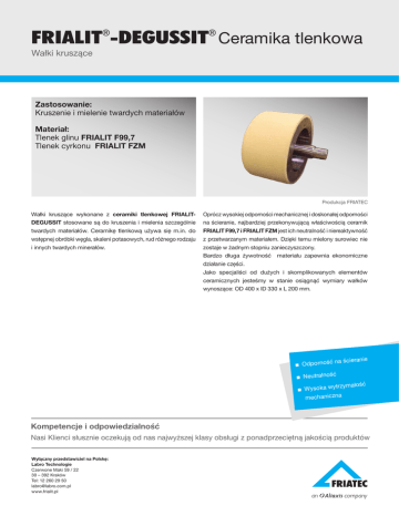 Frialit -Degussit Ceramika tlenkowa ® ® Wałki kruszące Zastosowanie: Kruszenie i mielenie twardych materiałów Materiał: Tlenek glinu FRIALIT F99,7 Tlenek cyrkonu FRIALIT FZM Produkcja Friatec Wałki kruszące wykonane z ceramiki tlenkowej FRIALIT- Oprócz wysokiej odporności mechanicznej i doskonałej odporności DEGUSSIT stosowane są do kruszenia i mielenia szczególnie na ścieranie, najbardziej przekonywującą właściwością ceramik twardych materiałów. Ceramikę tlenkową używa się m.in. do FRIALIT F99,7 i FRIALIT FZM jest ich neutralność i niereaktywność wstępnej obróbki węgla, skaleni potasowych, rud różnego rodzaju z przetwarzanym materiałem. Dzięki temu mielony surowiec nie i innych twardych minerałów. zostaje w żadnym stopniu zanieczyszczony. Bardzo długa żywotność materiału zapewnia ekonomiczne działanie części. Jako specjaliści od dużych i skomplikowanych elementów ceramicznych jesteśmy w stanie osiągnąć wymiary wałków wynoszące: OD 400 x ID 330 x L 200 mm. W Odporność na W Neutralność ścieranie ymałość Wysoka wytrz na mechanicz W Kompetencje i odpowiedzialność Nasi Klienci słusznie oczekują od nas najwyższej klasy obsługi z ponadprzeciętną jakością produktów Wyłączny przedstawiciel na Polskę: Labro Technologie Czerwone Maki 59 / 22 30 – 392 Kraków Tel: 12 260 29 50 [email protected] www.frialit.pl