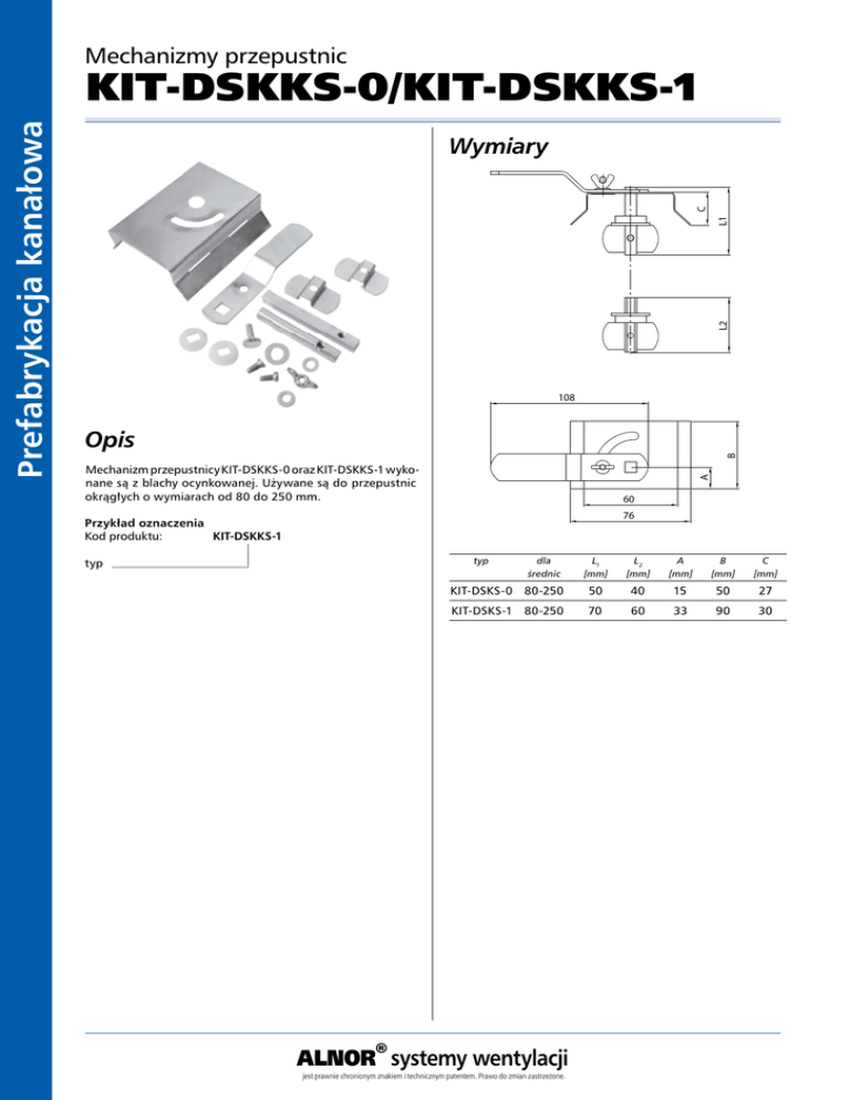 Mechanizmy przepustnic Pobierz Wentyle Pobierz AlnorCAM Zamawiaj w B2B L2 L1 C Wymiary 108 B Opis Mechanizm przepustnicy KIT-DSKKS-0 oraz KIT-DSKKS-1 wykonane są z blachy ocynkowanej. Używane są do przepustnic okrągłych o wymiarach od 80 do 250 mm. A Prefabrykacja kanałowa KIT-DSKKS-0/KIT-DSKKS-1 60 76 Przykład oznaczenia Kod produktu: KIT-DSKKS-1 typ typ dla średnic L1 [mm] L2 [mm] A [mm] B [mm] C [mm] KIT-DSKS-0 80-250 50 40 15 50 27 KIT-DSKS-1 80-250 70 60 33 90 30 ALNOR® systemy wentylacji jest prawnie chronionym znakiem i technicznym patentem. Prawo do zmian zastrzeżone.