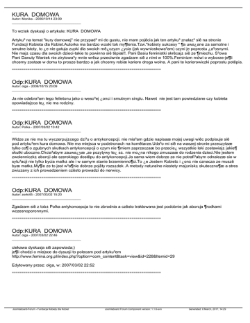 KURA DOMOWA Autor: Monika - 2006/10/14 23:09 _____________________________________ To w±tek dyskusji o artykule: KURA DOMOWA Artyku³ na temat "kury domowej" nie przypad³ mi do gustu, nie mam pojêcia jak ten artyku³ znalaz³ siê na stronie Fundacji Kobieta dla Kobiet.Autorka ma bardzo w±ski tok my¶lenia.Tzw."kobiety sukcesy " ¶a uwa¿ane za samotne i smutne istoty, to ¿e nie gotuja zupki dla swoich mê¿czyzn ¿ycia (jak wywnioskowa³am) czyni je poprostu ¿a³osnymi. Nie maj± czasu dla swoich dzieci-takie to powinno siê têpiæ!!. Pani Basiu feministki skrêcaj± siê ze ¶miechu. S³owa Pani Danuty Waniek nie zirytowa³y mnie wrêcz przeciwnie zgadzam siê z nimi w 100%.Feminizm mówi o wyborze-je¶li chcemy zostaæ w domu to prosze bardzo a jak chcemy robiæ kariere droga wolna. A pani te karierowiczki poprostu potêpia. ============================================================================ Odp:KURA DOMOWA Autor: olga - 2006/10/15 23:09 _____________________________________ Ja nie odebra³am tego felietonu jako o weso³ej ¿onci i smutnym singlu. Nawet nie jest tam powiedziane czy kobieta opowiadaj±ca te¿ nie ma rodziny. ============================================================================ Odp:KURA DOMOWA Autor: Polka - 2007/03/02 13:42 _____________________________________ Widze ze nie ma tu wyczerpuj±cego dzi³u o antykoncepcji. nie mia³am gdzie napisaæ mojej uwagi wiêc podpisuje siê pod artyku³em kura domowa. Nie ma miejsca w podstronach na komêtarze.Uda³o mi siê na waszej stronie przeczytaæ tylko co¶ o zgubnych skutkach antykoncepcji o czym nie ¶miem zaprzeczaæ bo przecie¿ wszystkie leki zostawiaj± jakie¶ skutki uboczne.Chcia³abym zauwa¿yæ ,ze pozytywy te¿ s±. nie mo¿na nikogo zmuszaæ do rodzenia dzieci.Nie jestem zwolenniczk± aborcji ale szerokiego dostêpu do antykoncepcji.Ja sama wiem dobrze ze nie potrafi³abym odnalezæ sie w sytu³acji nie tylko bycia matk± ale i w samym stanie brzemienno¶ci.To ¿e Jestem Kobiet± i ¿on± nie oznacza ze muszê byæ matk±.My¶le ze to jest w³a¶nie dobrze pojêty rozs±dek .A metody naturalne niestety maj±nisk± skuteczno¶æ a stres zwi±zany z ich prowadzeniem czêsto prowadzi do nerwicy. ============================================================================ Odp:KURA DOMOWA Autor: zorki45 - 2007/03/02 15:20 _____________________________________ Zgadzam siê z tob± Polka antykoncepcja to nie zbrodnia a czêsto traktowana jest podobnie jak aborcja ¶rodkami wczesnoporonnymi. ============================================================================ Odp:KURA DOMOWA Autor: olga - 2007/03/02 22:46 _____________________________________ ciekawa dyskusja siê zapowiada;) je¶li chodzi o miejsce do dysusji to polecam pod artyku³em http://www.femina.org.pl/index.php?option=com_content&task=view&id=228&Itemid=29 Edytowany przez: olga, w: 2007/03/02 22:52 ============================================================================ Joomlaboard-Forum - Fundacja Kobiety dla Kobiet Joomlaboard Forum Component version: 1.1.6-svn Generated: 8 March, 2017, 14:29