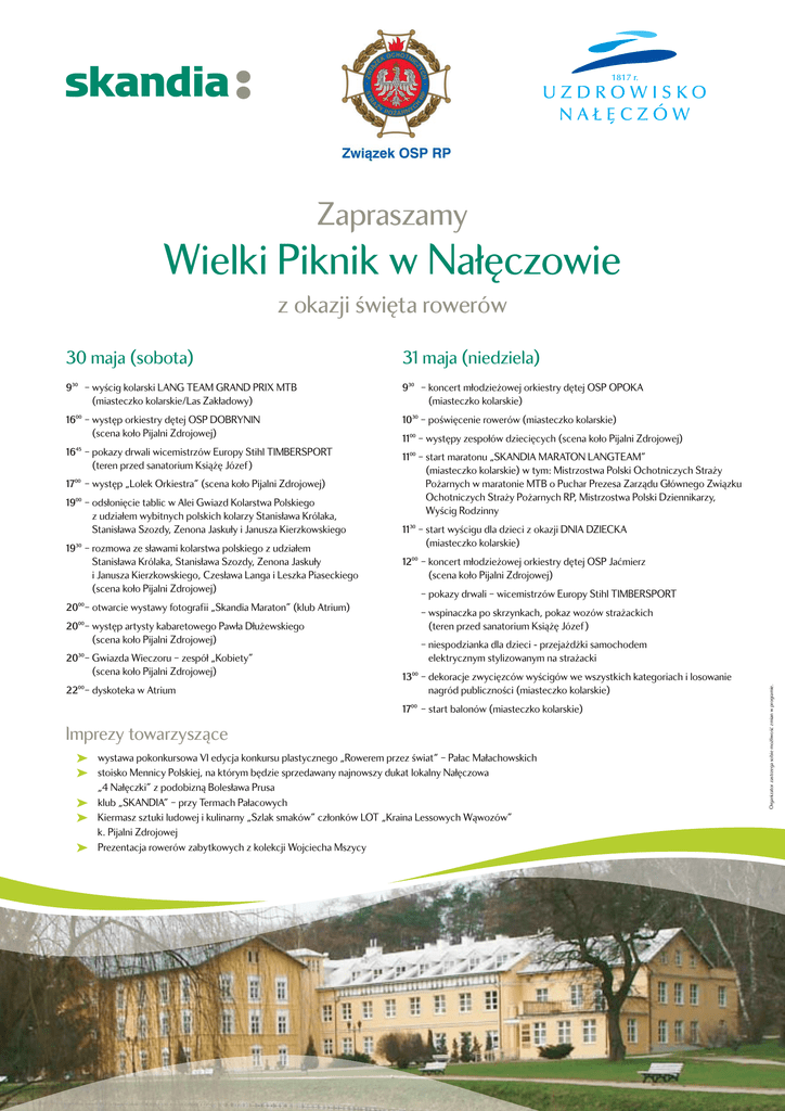 Zapraszamy Wielki Piknik w Nałęczowie z okazji święta rowerów 30 maja (sobota) 31 maja (niedziela) 930 – wyścig kolarski LANG TEAM GRAND PRIX MTB (miasteczko kolarskie/Las Zakładowy) 930 – koncert młodzieżowej orkiestry dętej OSP OPOKA (miasteczko kolarskie) 1600 – występ orkiestry dętej OSP DOBRYNIN (scena koło Pijalni Zdrojowej) 1030 – poświęcenie rowerów (miasteczko kolarskie) 16 – pokazy drwali wicemistrzów Europy Stihl TIMBERSPORT (teren przed sanatorium Książę Józef ) 1700 – występ „Lolek Orkiestra” (scena koło Pijalni Zdrojowej) 1900 – odsłonięcie tablic w Alei Gwiazd Kolarstwa Polskiego z udziałem wybitnych polskich kolarzy Stanisława Królaka, Stanisława Szozdy, Zenona Jaskuły i Janusza Kierzkowskiego 1930 – rozmowa ze sławami kolarstwa polskiego z udziałem Stanisława Królaka, Stanisława Szozdy, Zenona Jaskuły i Janusza Kierzkowskiego, Czesława Langa i Leszka Piaseckiego (scena koło Pijalni Zdrojowej) 2000– otwarcie wystawy fotografii „Skandia Maraton” (klub Atrium) 2000– występ artysty kabaretowego Pawła Dłużewskiego (scena koło Pijalni Zdrojowej) 30 20 – Gwiazda Wieczoru – zespół „Kobiety” (scena koło Pijalni Zdrojowej) 00 22 – dyskoteka w Atrium 1100 – występy zespołów dziecięcych (scena koło Pijalni Zdrojowej) 1100 – start maratonu „SKANDIA MARATON LANGTEAM” (miasteczko kolarskie) w tym: Mistrzostwa Polski Ochotniczych Straży Pożarnych w maratonie MTB o Puchar Prezesa Zarządu Głównego Związku Ochotniczych Straży Pożarnych RP, Mistrzostwa Polski Dziennikarzy, Wyścig Rodzinny 1130 – start wyścigu dla dzieci z okazji DNIA DZIECKA (miasteczko kolarskie) 1200 – koncert młodzieżowej orkiestry dętej OSP Jaćmierz (scena koło Pijalni Zdrojowej) – pokazy drwali – wicemistrzów Europy Stihl TIMBERSPORT – wspinaczka po skrzynkach, pokaz wozów strażackich (teren przed sanatorium Książę Józef ) – niespodzianka dla dzieci - przejażdżki samochodem elektrycznym stylizowanym na strażacki 1300 – dekoracje zwycięzców wyścigów we wszystkich kategoriach i losowanie nagród publiczności (miasteczko kolarskie) 1700 – start balonów (miasteczko kolarskie) Imprezy towarzyszące  wystawa pokonkursowa VI edycja konkursu plastycznego „Rowerem przez świat“ – Pałac Małachowskich  stoisko Mennicy Polskiej, na którym będzie sprzedawany najnowszy dukat lokalny Nałęczowa „4 Nałęczki” z podobizną Bolesława Prusa  klub „SKANDIA” – przy Termach Pałacowych  Kiermasz sztuki ludowej i kulinarny „Szlak smaków” członków LOT „Kraina Lessowych Wąwozów” k. Pijalni Zdrojowej  Prezentacja rowerów zabytkowych z kolekcji Wojciecha Mszycy Organizator zastrzega sobie możliwość zmian w programie. 45