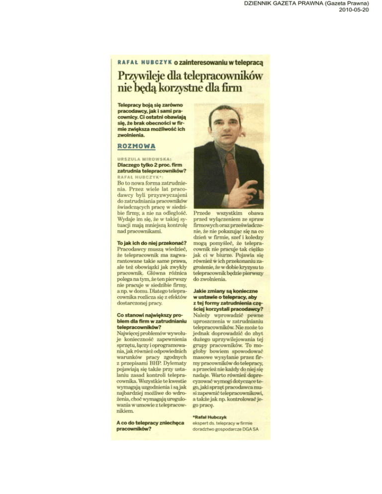 DZIENNIK GAZETA PRAWNA (Gazeta Prawna) 2010-05-20 RAFAŁ HUBCZYKO zainteresowaniu w telepracą Przywileje dla telepracowników nie będą korzystne dla firm Telepracy boją się zarówno pracodawcy, jak i sami pra cownicy. Ci ostatni obawiają się, że brak obecności w fir mie zwiększa możliwość ich zwolnienia. ROZMOWA URSZULA MIROWSKA: Dlaczego tylko 2 proc. firm zatrudnia telepracowników? RAFAŁ HUBCZYK*: Bo to nowa forma zatrudnie nia. Przez wiele lat praco dawcy byli przyzwyczajeni do zatrudniania pracowników świadczących pracę w siedzi bie firmy, a nie na odległość. Wydaje im się, że w takiej sy tuacji mają mniejszą kontrolę nad pracownikami. To jak ich do niej przekonać? Przede wszystkim obawa przed wyłączeniem ze spraw firmowych oraz przeświadcze nie, że nie pokazując się na co dzień w firmie, szef i koledzy mogą pomyśleć, że telepra cownik nie pracuje tak ciężko jak ci w biurze. Pojawia się również w ich przekonaniu za grożenie, że w dobie kryzysu to telepracownik będzie pierwszy do zwolnienia. Pracodawcy muszą wiedzieć, że telepracownik ma zagwa rantowane takie same prawa, ale też obowiązki jak zwykły pracownik. Główna różnica polega na tym, że ten pierwszy nie pracuje w siedzibie firmy, a np. w domu. Dlatego telepra- Jakie zmiany są konieczne cownika rozlicza się z efektów w ustawie o telepracy, aby dostarczonej pracy. z tej formy zatrudnienia czę ściej korzystali pracodawcy? Co stanowi największy pro blem dla firm w zatrudnianiu telepracowników? Najwięcej problemów wywołu je konieczność zapewnienia sprzętu, łączy i oprogramowa nia, jak również odpowiednich warunków pracy zgodnych z przepisami BHP. Dylematy pojawiają się także przy usta laniu zasad kontroli telepracownika. Wszystkie te kwestie wymagają uzgodnienia i są jak najbardziej możliwe do wdro żenia, choć wymagają uregulo wania w umowie z telepracownikiem. A co do telepracy zniechęca pracowników? Należy wprowadzić pewne uproszczenia w zatrudnianiu telepracowników. Nie może to jednak doprowadzić do zbyt dużego uprzywilejowania tej grupy pracowników. To mo głoby bowiem spowodować masowe wysyłanie przez fir my pracowników do telepracy, a przecież nie każdy do niej się nadaje. Warto również dopre cyzować wymogi dotyczące te go, jaki sprzęt pracodawca mu si zapewnić telepracownikowi, a także jak np. kontrolować je go pracę. •Rafał Hubczyk ekspert ds. telepracy w firmie doradztwo gospodarcze DGA SA