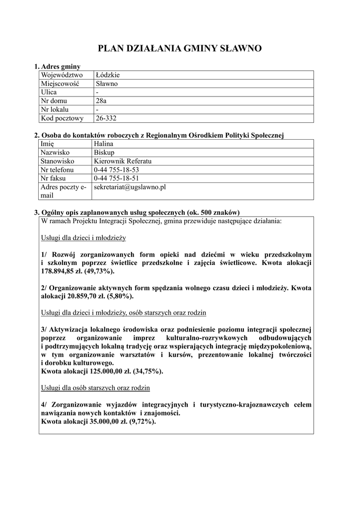 PLAN DZIAŁANIA GMINY SŁAWNO 1. Adres gminy Województwo Miejscowość Ulica Nr domu Nr lokalu Kod pocztowy Łódzkie Sławno 28a 26-332 2. Osoba do kontaktów roboczych z Regionalnym Ośrodkiem Polityki Społecznej Imię Halina Nazwisko Biskup Stanowisko Kierownik Referatu Nr telefonu 0-44 755-18-53 Nr faksu 0-44 755-18-51 Adres poczty e- [email protected] mail 3. Ogólny opis zaplanowanych usług społecznych (ok. 500 znaków) W ramach Projektu Integracji Społecznej, gmina przewiduje następujące działania: Usługi dla dzieci i młodzieży 1/ Rozwój zorganizowanych form opieki nad dziećmi w wieku przedszkolnym i szkolnym poprzez świetlice przedszkolne i zajęcia świetlicowe. Kwota alokacji 178.894,85 zł. (49,73%). 2/ Organizowanie aktywnych form spędzania wolnego czasu dzieci i młodzieży. Kwota alokacji 20.859,70 zł. (5,80%). Usługi dla dzieci i młodzieży, osób starszych oraz rodzin 3/ Aktywizacja lokalnego środowiska oraz podniesienie poziomu integracji społecznej poprzez organizowanie imprez kulturalno-rozrywkowych odbudowujących i podtrzymujących lokalną tradycję oraz wspierających integrację międzypokoleniową, w tym organizowanie warsztatów i kursów, prezentowanie lokalnej twórczości i dorobku kulturowego. Kwota alokacji 125.000,00 zł. (34,75%). Usługi dla osób starszych oraz rodzin 4/ Zorganizowanie wyjazdów integracyjnych i turystyczno-krajoznawczych celem nawiązania nowych kontaktów i znajomości. Kwota alokacji 35.000,00 zł. (9,72%). 4. Czy planowane usługi są zgodne z zapisami w planach strategicznych gminy (w tym w strategii rozwiązywania problemów społecznych, jeśli istnieje)? TAK Proszę zacytować odpowiednie zapisy: 1. Rozwój zorganizowanych form opieki nad dziećmi w wieku przedszkolnym i szkolnym poprzez świetlice przedszkolne i zajęcia świetlicowe jest zbieżny z celami Gminnej Strategii Rozwiązywania Problemów Społecznych na lata 2008-2015 Rozdział III Zakres i cele opracowania strategii: pkt 1 Edukacja podpunkt a, b, d wzbudzenie potrzeb edukacyjnych wśród młodzieży szkolnej wyrównywanie szans edukacyjnych małych dzieci zapewnienie opieki połączonej z organizacją zajęć edukacyjnych. 2/ Organizowanie aktywnych form spędzania wolnego czasu dzieci i młodzieży jest zbieżne z celami Gminnej Strategii Rozwiązywania Problemów Społecznych na lata 2008-2015 Rozdział III Zakres i cele opracowania strategii: pkt 2 Kultura, Sport, Czas wolny podpunkt c, h podnoszenie sprawności fizycznej organizowanie warsztatów, kursów, konkursów i rozgrywek pkt 3 Zdrowie podpunkt b, d poprawa sprawności fizycznej mieszkańców gminy promocja zdrowego stylu życia 3/ Aktywizacja lokalnego środowiska oraz podniesienie poziomu integracji społecznej celem rozwiązywania lokalnych problemów poprzez organizowanie imprez kulturalnorozrywkowych odbudowujących i podtrzymujących lokalną tradycję oraz wspierających integrację międzypokoleniową, w tym organizowanie warsztatów i kursów, prezentowanie lokalnej twórczości i dorobku kulturowego jest zbieżne z celami Gminnej Strategii Rozwiązywania Problemów Społecznych na lata 2008-2015 Rozdział III Zakres i cele opracowania strategii: pkt 2 Kultura, Sport, Czas wolny podpunkt b, e, g, h kultywowanie lokalnej tradycji i dorobku kulturowego aktywizacja społeczności lokalnej w tym ułatwianie funkcjonowania w środowisku lokalnym osób starszych, niepełnosprawnych organizowanie imprez kulturalno rozrywkowych organizowanie warsztatów, kursów konkursów i rozgrywek. 4/ Rozwój zainteresowań poprzez wyjazdy integracyjne celem nawiązania nowych kontaktów jest zbieżne z celami Gminnej Strategii Rozwiązywania Problemów Społecznych na lata 2008-2015 Rozdział III Zakres i cele opracowania strategii: pkt 2 Kultura, Sport, Czas wolny podpunkt b, e, f kultywowanie lokalnej tradycji i dorobku kulturowego aktywizacja społeczności lokalnej w tym ułatwianie funkcjonowania w środowisku lokalnym osób starszych, niepełnosprawnych wyjazdy integracyjne NIE Jeśli NIE, proszę o wyjaśnienie rozbieżności: Nie dotyczy 5. Prognozowany harmonogram realizacji Planu Działania Główne etapy ROK 2008 realizacji Planu Działania Kwartały I II III ROK 2009 IV I x x x x Przygotowanie dokumentacji konkursowej Ogłoszenie konkursów II III IV Podpisanie umów z usługodawcami Realizacja działań x x x x x Promocja realizowanych działań Rozliczenie, sprawozdawczość x x x x x 6. Plan zapotrzebowania na środki finansowe TABELA 6.1. Rodzaje usług zgodnie z Kwota (w złotych) podziałem w punkcie 3, np.: Usługi dla dzieci i młodzieży Usługi dla dzieci i młodzieży, osób starszych oraz rodzin Usługi dla osób starszych i rodzin Razem: % kwoty objętej Planem Działania 199.754,55 125.000,00 55,53 34,75 35.000,00 9,72 359.754,55 100% kwoty objętej Planem Działania TABELA 6.2. Podział kwot Kwota zł Kwota objęta Planem Działania Kwota pozostająca nadal w dyspozycji gminy RAZEM TABELA 6.3. Kwota w rozbiciu na kwartały* % 359.754,55 100 0,00 0 359.74,55 100% kwoty alokowanej na gminę ROK 2008 I II III ROK 2009 IV I II III RAZEM IV Kwartały 89.939 89.939 107.926 71.950, Kwota (w 359.754, 55 złotych) 55 * - szczegółowe dane dotyczące planowanych wydatków w rozbiciu na poszczególne miesiące będą przekazywane zgodnie z rozdziałem 3 Podręcznika Realizacji PI 7. Oświadczam, że informacje zawarte w niniejszym opisie usług społecznych są zgodne z prawdą. Wyrażam zgodę na udostępnienie niniejszego planu innym instytucjom oraz ekspertom dokonującym ewaluacji i oceny. Imię i nazwisko osoby uprawnionej Stanowisko Miejsce i data Podpis i pieczęć osoby uprawnionej Tadeusz Wojciechowski Wójt Gminy Sławno Sławno, 30.10.2008r. 8. Weryfikacja planu (WYPEŁNIA ROPS / KONSULTANT REGIONALNY): Czy wszystkie pola zostały właściwie wypełnione przez gminę? Czy prognozowany koszt działań jest zgodny z kwotą alokowaną na daną gminę? Czy zakres planowan