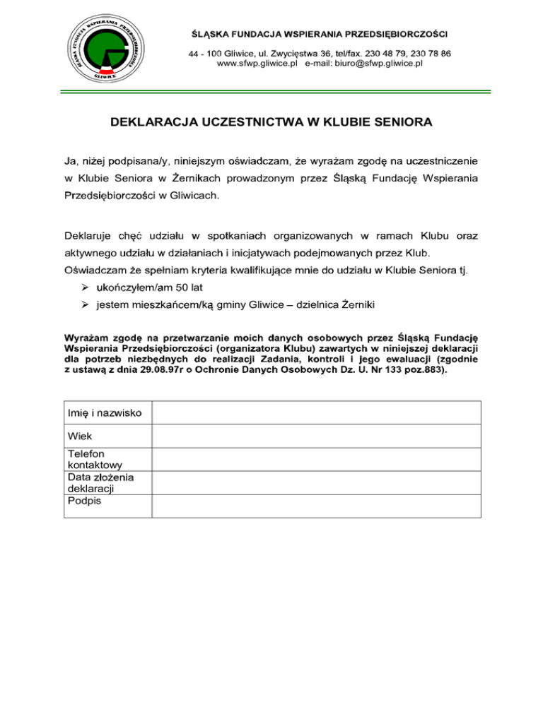 DEKLARACJA UCZESTNICTWA W KLUBIE SENIORA