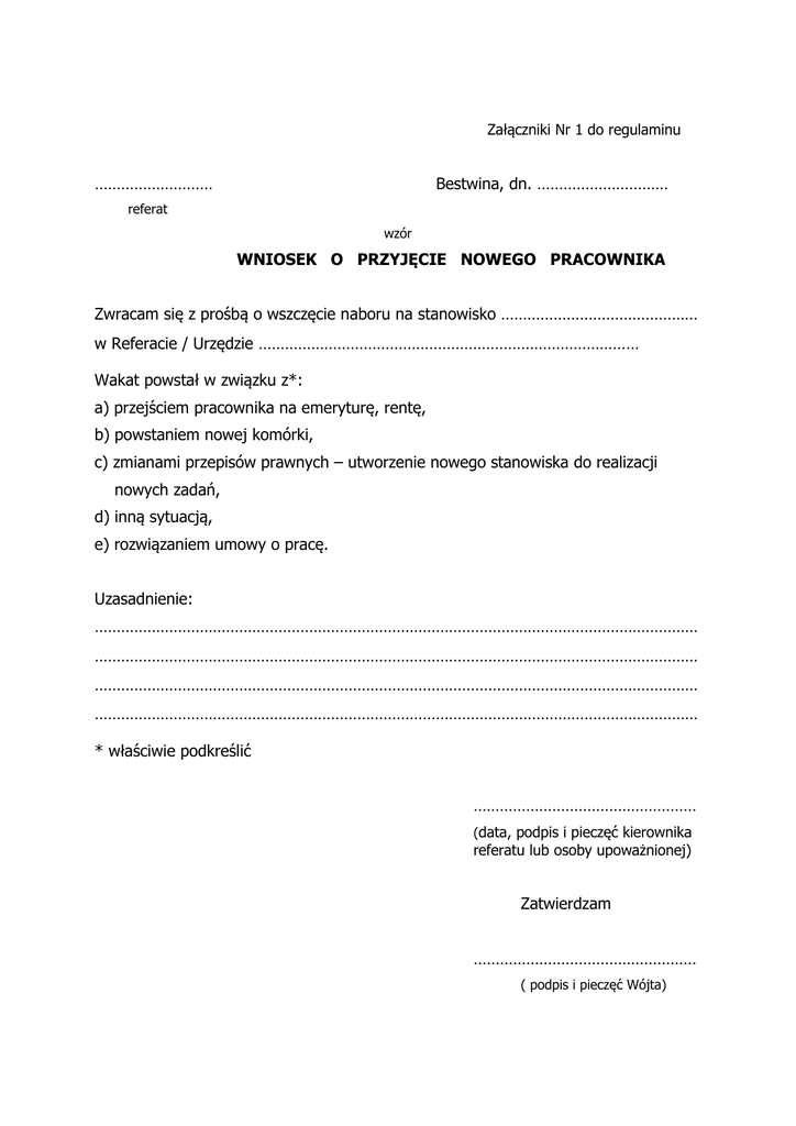 Załączniki Nr 1 do regulaminu ……………………… Bestwina, dn. ………………………… referat wzór WNIOSEK O PRZYJĘCIE NOWEGO PRACOWNIKA Zwracam się z prośbą o wszczęcie naboru na stanowisko ……………………………………… w Referacie / Urzędzie …………………………………………………………………………… Wakat powstał w związku z*: a) przejściem pracownika na emeryturę, rentę, b) powstaniem nowej komórki, c) zmianami przepisów prawnych – utworzenie nowego stanowiska do realizacji nowych zadań, d) inną sytuacją, e) rozwiązaniem umowy o pracę. Uzasadnienie: ………………………………………………………………………………………………………………………… ………………………………………………………………………………………………………………………… ………………………………………………………………………………………………………………………… ………………………………………………………………………………………………………………………… * właściwie podkreślić …………………………………………… (data, podpis i pieczęć kierownika referatu lub osoby upoważnionej) Zatwierdzam …………………………………………… ( podpis i pieczęć Wójta) Załącznik Nr 2 do regulaminu wzór FORMULARZ OPISU STANOWISKA PRACY W URZĘDZIE A. INFORMACJE OGÓLNE DOTYCZĄCE STANOWISKA PRACY 1. Stanowisko …………………………………………………………………………………………………… 2. Referat …………….…………………...…………………………………………………………………… B. WYMOGI NIEZBĘDNE I DODATKOWE W TYM WYMOGI KWALIFIKACYJNE 1. Niezbędne : ……………………………………………………………………………………………….. ……………………………………………………………………………………………………………………… 2. Dodatkowe: …………………………………………………………………………………………………. ………………………………………………………………………………………………………………………… 3. Wykształcenie (charakter lub typ szkoły) ………………………………………………………… 4. Wymagany profil (specjalność) ……………………………………………………………………… 5. Obligatoryjne uprawnienia …………………………………………………………………………… ……………………………………………………………………………………………………………………… ……………………………………………………………………………………………………………………… 6. Doświadczenie zawodowe …………………………………………………………………………… ……………………………………………………………………………………………………………………… ……………………………………………………………………………………………………………………… w tym doświadczenie w pracy w administracji publicznej ……………………………………… 7. Predyspozycje osobowościowe ……………………………………………………………………… 8. Umiejętności zawodowe ………………………………………………………………………………… C. ZAKRES ZADAŃ WYKONYWANYCH NA STANOWISKU (zadania główne) ………………………………………………………………………………………………………………………… ………………………………………………………………………………………………………………………… ………………………………………………………………………………………………………………………… ………………………………………………………………………………………………………………………… ………………………………………………………………………………………………………………………… ………………………………………………………………………………………………………………………… ………………………………………………………………………………………………………………………… ………………………………………………………………………………………………………………………… ………………………………………………………………………………………………………………………… ……………………………………………………………………………………………………………………… ………………………………………………………………………………………………………………………… ………………………………………………………………………………………………………………………… ………………………………………………………………………………………………………………………… ………………………………………………………………………………………………………………………… ………………………………………………………………………………………………………………………… ……………………………………………………………………………
