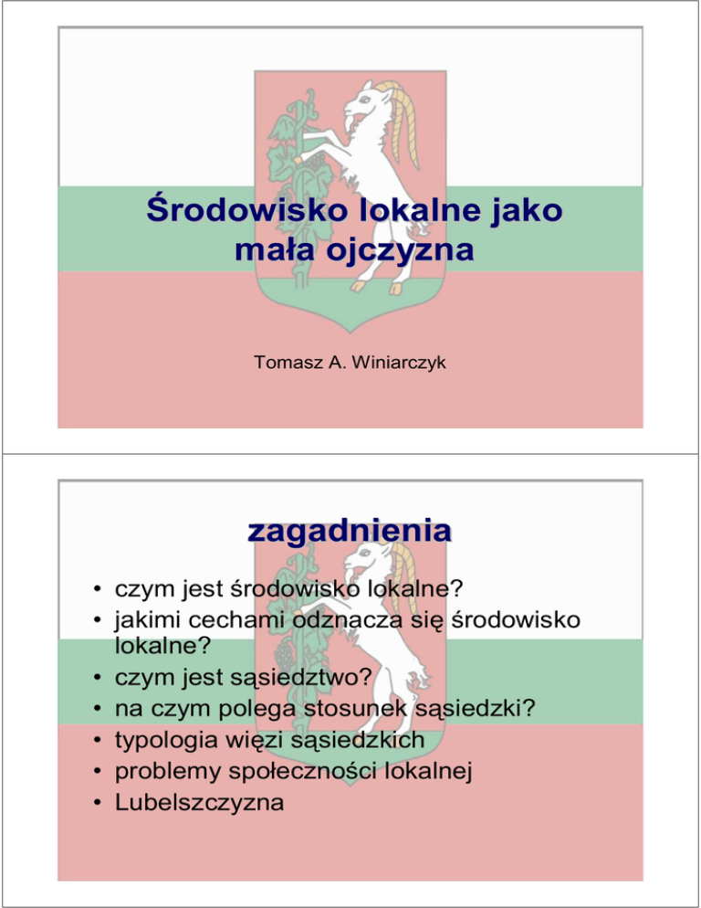 Środowisko lokalne jako mała ojczyzna Tomasz A. Winiarczyk zagadnienia • czym jest środowisko lokalne? • jakimi cechami odznacza się środowisko lokalne? • czym jest sąsiedztwo? • na czym polega stosunek sąsiedzki? • typologia więzi sąsiedzkich • problemy społeczności lokalnej • Lubelszczyzna środowisko lokalne • grupa ludzi zamieszkujących ograniczone i względnie izolowane terytorium, posiadających i ceniących wspólne tradycje, wartości i symbole, instytucje usługowe i kulturowe, świadomych jedności, odrębności i gotowości do wspólnego działania, żyjących w poczuciu przynależności i wewnętrznego bezpieczeństwa. cechy środowiska lokalnego • granice terytorialne • interakcje społeczne • występują grupy o charakterze wspólnotowym, świadome swej przynależności (istnienie trwałej więzi między członkami) • podział prac i usług • poczucie jedności i wspólne działanie w przypadku zagrożeń • wspólna tradycja i kultura • tożsamość etniczna, religijna • poczucie odrębności i względnej izolacji, kontroli grupy nad jednostką i powszechnej identyfikacji członków sąsiedztwo • układ względnie trwałych powiązań między osobami, powstałych na gruncie zależności wynikających z bliskości zamieszkania, a wyrażających się na zewnątrz w postaci unormowanych czynności, na które składają się określone obowiązki i uprawnienia obu stron stosunek sąsiedzki • system wzajemnych czynności czy świadczeń wykonywanych na podstawie układu uprawnień i obowiązków wynikających ze wspólnej podstawy zależności, którą jest bliskość zamieszkania typologia więzi sąsiedzkich • • • • • • • brak sąsiedztwa – nieutrzymywanie żadnych stosunków sąsiedzkich, samoizolacja sąsiedztwo utajone – polega na nieutrzymywaniu kontaktów sąsiedzkich mimo przeświadczenia o wzajemnej życzliwości, postawa ta nie wyklucza jednak możliwości nawiązania owych kontaktów w razie potrzeby sąsiedztwo poinformowane, ale nieodwzajemnione grzecznościowo – cechuje się posiadaniem orientacji i wiedzy o współzamieszkujących osobach, nie są nawiązywane jednak konwencjonalne ukłony i pozdrowienia sąsiedztwo grzecznościowe i poinformowane – charakteryzuje się orientacją i wiedzą na temat życia rodzinnego, zawodowego, a nawet osobistego współmieszkańców, dodatkowo pojawia się jednak element wymiany grzecznościowych ukłonów i pozdrowień sąsiedztwo polegające na wymianie poglądów i informacji bez utrzymywania bliższych styczności – polega przede wszystkim na zdawkowej wymianie informacji dotyczących, funkcjonalnej strony życia społeczności, w zakres tych informacji nie wchodzą te dotyczące życia prywatnego współmieszkańców sąsiedztwo okazjonalno–świadczeniowe – głównie natury usługowej, bez elementu wzajemnego towarzyskiego odwiedzania się sąsiedztwo bliskie – osobiste i trwale, związane ze wzajemnymi odwiedzinami problemy społeczności lokalnej • coraz częstszy brak znajomości sąsiadów • dezintegracja pod wpływem przemian cywilizacyjnych • ruchy migracyjne • procesy urbanizacyjne (zastępowanie klasycznych społeczności lokalnych aglomeracjami) • rozstrzyganie sporów nie w ramach zbiorowości ale za pośrednictwem instytucji • odrzucanie tradycji przez młodych LUBELSZCZYZNA Lubelszczyzna • określenie regionu używane w zależności od kontekstu w odniesieniu do: – ziemi lubelskiej (średniowiecze), – województwa lubelskiego z lat 1474–1795 lub – do późniejszych województw lubelskich. • po 1999 r. instytucje samorządowe pod nazwą Lubelszczyzna określają obecne województwo lubelskie i stosują je zamiennie Lubelszczyzna • Kraina historyczna w północno-wschodniej Małopolsce, na prawym brzegu Wisły, między Wieprzem i Tyśmienicą na północy oraz Sanem i Tanwią na południu. • W większości położona jest na Wyżynie Lubelskiej, która zajmuje środkową część krainy. • Wysokość terenu waha się od ok. 100 do ok. 300 m n.p.m. • Głównym miastem krainy jest Lublin. Lubelszczyzna – nazwa • Nazwa Lublin znana jest już od najstarszych zapisków z 1228 (Lublin). • Pochodzi ona od nazwy osobowej Lubla utworzonej od imienia Lubomir, poprzez dodanie dawniej pieszczotliwego przyrostka -la. Lubelszczyzna – 19 miast • • • • • • • • • • Lublin Puławy Świdnik Kraśnik Biłgoraj Lubartów Łęczna Janów Lubelski Parczew Poniatowa • • • • • • • • • Opole Lubelskie Bełżyce Bychawa Nałęczów Kazimierz Dolny Annopol Piaski Ostrów Lubelski Frampol herb • Herb ten pojawił się około połowy XIV wieku. • Jan Długosz w swych Rocznikach wśród chorągwi rycerstwa spod Grunwaldu w roku 1410 wymienia chorągiew ziemi lubelskiej. • Obecnie herb województwa lubelskiego. WOJEWÓDZTWO LUBELSKIE województwo lubelskie • Obejmuje kilka głównych krain historycznych. – z regionu Małopolski należą do niego prawie w całości ziemia lubelska i ziemia łukowska, a ponadto część ziemi stężyckiej i fragment ziemi radomskiej na lewym brzegu Wisły – należy do niego też płd. skraj Podlasia, część ziemi chełmskiej, która należała do Rusi Czerwonej, oraz część Polesia – od 1809 r. północna część obszaru między Wisłą a Bugiem znajdowała się w siedleckim regionie administracyjnym jako tzw. Podlasie mapa województwa województwo lubelskie • powierzchnia 25 122,49 km² • zajmuje 8% powierzchni Polski – 3 miejsce w kraju pod względem powierzchni województwo lubelskie • 4 powiaty grodzkie i 20 powiatów ziemskich, – 213 gmin, • 3645 sołectw i 4206 wsi • 42 miasta – w tym 4 miasta na prawach powiatów (Lublin, Chełm, Zamość,Biała Podlaska) województwo lubelskie • ludność 2 175 700 (2011 NSP) • ludność 2 151 800 (2014 GUS) – Lublin 349 100 • gęstość zaludnienia 85,78 mieszk. na km2 • u