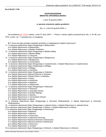 Zniesienie sądów grodzkich. Dz.U.2009.221.1745 wersja: 2010.01.01 Dz.U.09.221.1745 ROZPORZĄDZENIE MINISTRA SPRAWIEDLIWOŚCI z dnia 18 grudnia 2009 r. w sprawie zniesienia sądów grodzkich (Dz. U. z dnia 24 grudnia 2009 r.) Na podstawie art. 13 § 3 ustawy z dnia 27 lipca 2001 r. - Prawo o ustroju sądów powszechnych (Dz. U. Nr 98, poz. 1) 1070, z późn. zm. ) zarządza się, co następuje: § 1. Znosi się sądy grodzkie (wydziały grodzkie) w następujących sądach rejonowych: 1) w obszarze właściwości Sądu Okręgowego w Białymstoku: a) w Sądzie Rejonowym w Białymstoku, b) w Sądzie Rejonowym w Bielsku Podlaskim, 2) w obszarze właściwości Sądu Okręgowego w Bielsku-Białej: a) w Sądzie Rejonowym w Bielsku-Białej, b) w Sądzie Rejonowym w Cieszynie, 3) w obszarze właściwości Sądu Okręgowego w Bydgoszczy: a) w Sądzie Rejonowym w Bydgoszczy, b) w Sądzie Rejonowym w Inowrocławiu, 4) w obszarze właściwości Sądu Okręgowego w Częstochowie, w Sądzie Rejonowym w Częstochowie, 5) w obszarze właściwości Sądu Okręgowego w Elblągu: a) w Sądzie Rejonowym w Elblągu, b) w Sądzie Rejonowym w Ostródzie, 6) w obszarze właściwości Sądu Okręgowego w Gdańsku: a) w Sądzie Rejonowym Gdańsk-Południe w Gdańsku, b) w Sądzie Rejonowym Gdańsk-Północ w Gdańsku, c) w Sądzie Rejonowym w Gdyni, d) w Sądzie Rejonowym w Kwidzynie, e) w Sądzie Rejonowym w Malborku, f) w Sądzie Rejonowym w Wejherowie, 7) w obszarze właściwości Sądu Okręgowego w Gliwicach: a) w Sądzie Rejonowym w Gliwicach, b) w Sądzie Rejonowym w Jastrzębiu-Zdroju, c) w Sądzie Rejonowym w Rudzie Śląskiej, d) w Sądzie Rejonowym w Rybniku, e) w Sądzie Rejonowym w Tarnowskich Górach, f) w Sądzie Rejonowym w Zabrzu, 8) w obszarze właściwości Sądu Okręgowego w Gorzowie Wielkopolskim, w Sądzie Rejonowym w Gorzowie Wielkopolskim, 9) w obszarze właściwości Sądu Okręgowego w Jeleniej Górze, w Sądzie Rejonowym w Jeleniej Górze, 10) w obszarze właściwości Sądu Okręgowego w Kaliszu, w Sądzie Rejonowym w Kaliszu, 11) w obszarze właściwości Sądu Okręgowego w Katowicach: a) w Sądzie Rejonowym w Będzinie, b) w Sądzie Rejonowym w Bytomiu, c) w Sądzie Rejonowym w Chorzowie, d) w Sądzie Rejonowym w Dąbrowie Górniczej, e) w Sądzie Rejonowym Katowice-Wschód w Katowicach, f) w Sądzie Rejonowym Katowice-Zachód w Katowicach, g) w Sądzie Rejonowym w Sosnowcu, h) w Sądzie Rejonowym w Tychach, 12) w obszarze właściwości Sądu Okręgowego w Kielcach, w Sądzie Rejonowym w Kielcach, System Informacji Prawnej Lex (Lex Omega) 14/2010 Zniesienie sądów grodzkich. Dz.U.2009.221.1745 wersja: 2010.01.01 13) w obszarze właściwości Sądu Okręgowego w Koninie, w Sądzie Rejonowym w Koninie, 14) w obszarze właściwości Sądu Okręgowego w Koszalinie: a) w Sądzie Rejonowym w Białogardzie, b) w Sądzie Rejonowym w Koszalinie, 15) w obszarze właściwości Sądu Okręgowego w Krakowie: a) w Sądzie Rejonowym w Chrzanowie, b) w Sądzie Rejonowym dla Krakowa-Krowodrzy w Krakowie, c) w Sądzie Rejonowym dla Krakowa-Nowej Huty w Krakowie, d) w Sądzie Rejonowym dla Krakowa-Podgórza w Krakowie, e) w Sądzie Rejonowym dla Krakowa-Śródmieścia w Krakowie, f) w Sądzie Rejonowym w Wieliczce, 16) w obszarze właściwości Sądu Okręgowego w Krośnie: a) w Sądzie Rejonowym w Krośnie, b) w Sądzie Rejonowym w Lesku, 17) w obszarze właściwości Sądu Okręgowego w Legnicy: a) w Sądzie Rejonowym w Głogowie, b) w Sądzie Rejonowym w Legnicy, c) w Sądzie Rejonowym w Lubinie, 18) w obszarze właściwości Sądu Okręgowego w Lublinie: a) w Sądzie Rejonowym w Białej Podlaskiej, b) w Sądzie Rejonowym w Chełmie, c) w Sądzie Rejonowym w Lublinie, 19) w obszarze właściwości Sądu Okręgowego w Łomży, w Sądzie Rejonowym w Łomży, 20) w obszarze właściwości Sądu Okręgowego w Łodzi: a) w Sądzie Rejonowym dla Łodzi-Śródmieścia w Łodzi, b) w Sądzie Rejonowym dla Łodzi-Widzewa w Łodzi, c) w Sądzie Rejonowym w Zgierzu, 21) w obszarze właściwości Sądu Okręgowego w Nowym Sączu, w Sądzie Rejonowym w Nowym Sączu, 22) w obszarze właściwości Sądu Okręgowego w Olsztynie: a) w Sądzie Rejonowym w Giżycku, b) w Sądzie Rejonowym w Olsztynie, 23) w obszarze właściwości Sądu Okręgowego w Opolu: a) w Sądzie Rejonowym w Nysie, b) w Sądzie Rejonowym w Opolu, 24) w obszarze właściwości Sądu Okręgowego w Piotrkowie Trybunalskim, w Sądzie Rejonowym w Piotrkowie Trybunalskim, 25) w obszarze właściwości Sądu Okręgowego w Płocku: a) w Sądzie Rejonowym w Ciechanowie, b) w Sądzie Rejonowym w Płocku, 26) w obszarze właściwości Sądu Okręgowego w Poznaniu: a) w Sądzie Rejonowym Poznań-Grunwald i Jeżyce w Poznaniu, b) w Sądzie Rejonowym Poznań-Nowe Miasto i Wilda w Poznaniu, c) w Sądzie Rejonowym Poznań-Stare Miasto w Poznaniu, d) w Sądzie Rejonowym w Trzciance, 27) w obszarze właściwości Sądu Okręgowego w Przemyślu, w Sądzie Rejonowym w Przemyślu, 28) w obszarze właściwości Sądu Okręgowego w Radomiu: a) w Sądzie Rejonowym w Grójcu, b) w Sądzie Rejonowym w Radomiu, 29) w obszarze właściwości Sądu Okręgowego w Rzeszowie, w Sądzie Rejonowym w Rzeszowie, 30) w obszarze właściwości Sądu Okręgowego w Siedlcach, w Sądzie Rejonowym w Siedlcach, 31) w obszarze właściwości Sądu Okręgowego w Sieradzu, w Sądzie Rejonowym w Łasku, 32) w obszarze właściwości Sądu Okręgowego w Słupsku, w Sądzie Rejonowym w Słupsku, 33) w obszarze właściwości Sądu Okręgowego w Suwałkach, w Sądzie Rejonowym w Suwałkach, 34) w obszarze właściwości Sądu Okręgowego w Szczecinie: a) w Sądzie Rejonowym w Gryfinie, b) w Sądzie Rejonowym w Stargardzie Szczecińskim, c) w Sądzie Rejonowym Szczecin-Centrum w Szczecinie, d) w Sądzie Rejonowym Szczecin-Prawobrzeże i Zachód w Szczecinie, System Informacji Prawnej Lex (Lex Omega) 14/2010 Zniesienie sądów grodzkich. Dz.U.2009.221.1745 wersja: 2010.01.01 35) w obszarze w