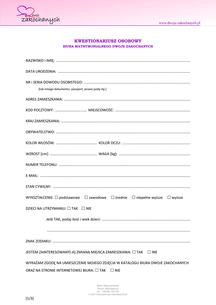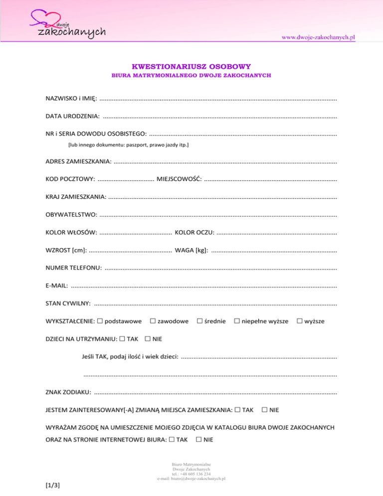 KWESTIONARIUSZ OSOBOWY BIURA MATRYMONIALNEGO DWOJE ZAKOCHANYCH NAZWISKO i IMIĘ: ...................................................................................................................................... DATA URODZENIA: .................................................................................................................................... NR i SERIA DOWODU OSOBISTEGO: .......................................................................................................... [lub innego dokumentu: paszport, prawo jazdy itp.] ADRES ZAMIESZKANIA: .............................................................................................................................. KOD POCZTOWY: ................................ MIEJSCOWOŚĆ: ........................................................................... KRAJ ZAMIESZKANIA: ................................................................................................................................. OBYWATELSTWO: ...................................................................................................................................... KOLOR WŁOSÓW: ......................................... KOLOR OCZU: .................................................................... WZROST [cm]: ............................................... WAGA [kg]: ....................................................................... NUMER TELEFONU: ................................................................................................................................... E-MAIL: ...................................................................................................................................................... STAN CYWILNY: ......................................................................................................................................... WYKSZTAŁCENIE: podstawowe zawodowe średnie niepełne wyższe wyższe DZIECI NA UTRZYMANIU: TAK NIE Jeśli TAK, podaj ilość i wiek dzieci: ........................................................................................ ............................................................................................................................................... ZNAK ZODIAKU: ......................................................................................................................................... JESTEM ZAINTERESOWANY[-A] ZMIANĄ MIEJSCA ZAMIESZKANIA: TAK NIE WYRAŻAM ZGODĘ NA UMIESZCZENIE MOJEGO ZDJĘCIA W KATALOGU BIURA DWOJE ZAKOCHANYCH ORAZ NA STRONIE INTERNETOWEJ BIURA: TAK NIE Biuro Matrymonialne Dwoje Zakochanych tel.: +48 605 136 234 e-mail: [email protected] [1/3] POSIADAM SAMOCHÓD: TAK NIE POSIADAM WŁASNE: MIESZKANIE DOM MOJE WARUNKI MATERIALNE SĄ: ZADOWALAJĄCE DOBRE BARDZO DOBRE ZAWÓD WYKONYWANY: ........................................................................................................................... ZATRUDNIENIE: .......................................................................................................................................... ZNAJOMOŚĆ JĘZYKÓW OBCYCH: angielski niemiecki francuski włoski inne: ............................................................................................................................................... WYZNANIE (wiara): .................................................................................................................................... PALĘ PAPIEROSY: TAK NIE PIJĘ ALKOHOL: TAK NIE HOBBY: ...................................................................................................................................................... .................................................................................................................................................................... .................................................................................................................................................................... KILKA ZDAŃ NA WŁASNY TEMAT: .............................................................................................................. .................................................................................................................................................................... .................................................................................................................................................................... .................................................................................................................................................................... .................................................................................................................................................................... .................................................................................................................................................................... CHCĘ OTRZYMYWAĆ OFERTY ZAGRANICZNE: TAK NIE Biuro Matrymonialne Dwoje Zakochanych tel.: +48 605 136 234 e-mail: [email protected] [2/3] POSZUKUJĘ: KOBIETY MĘŻCZYZNY WIEK PARTNERA: OD ......................................... DO ................................................. WYKSZTAŁCENIE PARTNERA: podstawowe zawodowe niepełne wyższe wyższe średnie dowolne STAN CYWILNY PARTNERA: ........................................................................................ POSZUKIWANE CECHY PARTNERA: ............................................................................ .................................................................................................................................... CECHY WYKLUCZAJĄCE PARTNERA: ........................................................................... .................................................................................................................................... PARTNER MOŻE POSIADAĆ DZIECI: TAK NIE WARUNKI MATERIALNE PAR