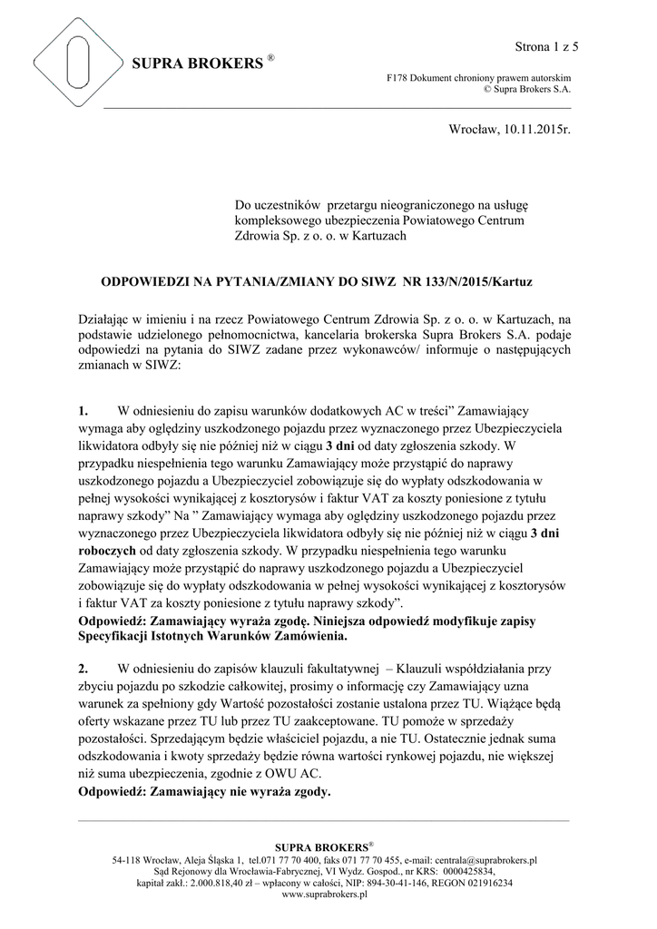 Strona 1 z 5 SUPRA BROKERS ® F178 Dokument chroniony prawem autorskim © Supra Brokers S.A. _____________________________________________________________________________ Wrocław, 10.11.2015r. Do uczestników przetargu nieograniczonego na usługę kompleksowego ubezpieczenia Powiatowego Centrum Zdrowia Sp. z o. o. w Kartuzach ODPOWIEDZI NA PYTANIA/ZMIANY DO SIWZ NR 133/N/2015/Kartuz Działając w imieniu i na rzecz Powiatowego Centrum Zdrowia Sp. z o. o. w Kartuzach, na podstawie udzielonego pełnomocnictwa, kancelaria brokerska Supra Brokers S.A. podaje odpowiedzi na pytania do SIWZ zadane przez wykonawców/ informuje o następujących zmianach w SIWZ: 1. W odniesieniu do zapisu warunków dodatkowych AC w treści” Zamawiający wymaga aby oględziny uszkodzonego pojazdu przez wyznaczonego przez Ubezpieczyciela likwidatora odbyły się nie później niż w ciągu 3 dni od daty zgłoszenia szkody. W przypadku niespełnienia tego warunku Zamawiający może przystąpić do naprawy uszkodzonego pojazdu a Ubezpieczyciel zobowiązuje się do wypłaty odszkodowania w pełnej wysokości wynikającej z kosztorysów i faktur VAT za koszty poniesione z tytułu naprawy szkody” Na ” Zamawiający wymaga aby oględziny uszkodzonego pojazdu przez wyznaczonego przez Ubezpieczyciela likwidatora odbyły się nie później niż w ciągu 3 dni roboczych od daty zgłoszenia szkody. W przypadku niespełnienia tego warunku Zamawiający może przystąpić do naprawy uszkodzonego pojazdu a Ubezpieczyciel zobowiązuje się do wypłaty odszkodowania w pełnej wysokości wynikającej z kosztorysów i faktur VAT za koszty poniesione z tytułu naprawy szkody”. Odpowiedź: Zamawiający wyraża zgodę. Niniejsza odpowiedź modyfikuje zapisy Specyfikacji Istotnych Warunków Zamówienia. 2. W odniesieniu do zapisów klauzuli fakultatywnej – Klauzuli współdziałania przy zbyciu pojazdu po szkodzie całkowitej, prosimy o informację czy Zamawiający uzna warunek za spełniony gdy Wartość pozostałości zostanie ustalona przez TU. Wiążące będą oferty wskazane przez TU lub przez TU zaakceptowane. TU pomoże w sprzedaży pozostałości. Sprzedającym będzie właściciel pojazdu, a nie TU. Ostatecznie jednak suma odszkodowania i kwoty sprzedaży będzie równa wartości rynkowej pojazdu, nie większej niż suma ubezpieczenia, zgodnie z OWU AC. Odpowiedź: Zamawiający nie wyraża zgody. _________________________________________________________________________________________ SUPRA BROKERS® 54-118 Wrocław, Aleja Śląska 1, tel.071 77 70 400, faks 071 77 70 455, e-mail: [email protected] Sąd Rejonowy dla Wrocławia-Fabrycznej, VI Wydz. Gospod., nr KRS: 0000425834, kapitał zakł.: 2.000.818,40 zł – wpłacony w całości, NIP: 894-30-41-146, REGON 021916234 www.suprabrokers.pl Strona 2 z 5 SUPRA BROKERS ® F178 Dokument chroniony prawem autorskim © Supra Brokers S.A. _____________________________________________________________________________ 3. Prosimy o informację czy wartość pojazdów obejmuje również wartość wyposażenia dodatkowego w tym medycznego. Odpowiedź: Nie. 4. Prosimy o informacje na jaki dzień została przedstawiona szkodowość z ryzyk komunikacyjnych. Odpowiedź: Przedstawiona szkodowość jest z połowy października. 5. W związku z 36-miesięcznym terminem realizacji zamówienia prosimy o wprowadzenie klauzuli wypowiedzenia o poniższej treści: Umowa Ubezpieczenia może zostać wypowiedziana przez Ubezpieczającego lub Ubezpieczyciela za 3-miesięcznym okresem wypowiedzenia, ze skutkiem na koniec każdego okresu polisowania, przy czym Ubezpieczyciel może wypowiedzieć Umowę generalną jedynie z ważnych powodów, za które uznaje się wyłącznie: 1) Niemożność uzyskania przez Ubezpieczyciela pokrycia reasekuracyjnego dla jakichkolwiek ryzyk wskazanych w Umowie generalnej, 2) Znaczne pogorszenie finansowych warunków pokrycia reasekuracyjnego, 3) Przekroczenie wskaźnika szkodowości w następujących przypadkach: a) pierwszy okres rozliczeniowy: • gdy szkodowość rozumiana jako stosunek rezerw oraz wypłaconych odszkodowań z poszczególnych ubezpieczeń do składki zarobionej (składka przypisana za okres 8 miesięcy za poszczególne ubezpieczenia) za pierwsze 8 miesięcy pierwszego roku ochrony nie przekroczy 50% - utrzymanie stawek i warunków ubezpieczenia określonych w ofercie w drugim roku ubezpieczenia. W przypadku, kiedy szkodowość nie spełnia powyższych warunków i przekracza wskazany wyżej 50% wskaźnik szkodowości, strony dopuszczają możliwość renegocjacji stawek prowadzonej w formie pisemnej. Ubezpieczyciel w takiej sytuacji jest zobowiązany przedstawić nową propozycję w terminie 15 dni od dnia zakończenia 8 miesięcy pierwszego roku ochrony. Z chwilą braku porozumienia pomiędzy stronami umowy w kwestii nowych stawek ubezpieczeniowych, umowa ulega rozwiązaniu z dniem końca pierwszego okresu ubezpieczenia. W przypadku niezłożenia przez Ubezpieczyciela nowej propozycji składek w terminie 15 dni od dnia zakończenia 8 miesięcy pierwszego roku ochrony składki na kolejny okres nie ulegają zmianie. b) drugi okres rozliczeniowy: • gdy szkodowość rozumiana jako stosunek rezerw oraz wypłaconych odszkodowań z poszczególnych ubezpieczeń do składki zarobionej (składka przypisana za okres 12 miesięcy pierwszego roku ochrony i 8 miesięcy drugiego roku ochrony za poszczególne ubezpieczenia) za 12 miesięcy pierwszego roku ochrony i 8 miesięcy drugiego roku ochrony nie przekroczy 50% - utrzymanie stawek i warunków ubezpieczenia określonych w ofercie w trzecim roku ubezpieczenia. W przypadku, kiedy szkodowość nie spełnia powyższych warunków i przekracza wskazany wyżej 50% wskaźnik szkodowości, strony dopuszczają możliwość renegocjacji stawek _________________________________________________________________________________________ SUPRA BROKERS® 54-118 Wrocław, Aleja Śląska 1, tel.071 77 70 400, faks 071 77 70 455