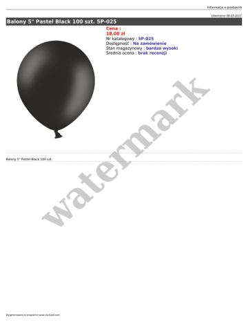 Informacje o produkcie Utworzono 08-03-2017 Balony 5" Pastel Black 100 szt. 5P-025 Cena : 18,00 zł w at Balony 5" Pastel Black 100 szt. er m ar k Nr katalogowy : 5P-025 Dostępność : Na zamówienie Stan magazynowy : bardzo wysoki Średnia ocena : brak recenzji Wygenerowano w programie www.oscGold.com