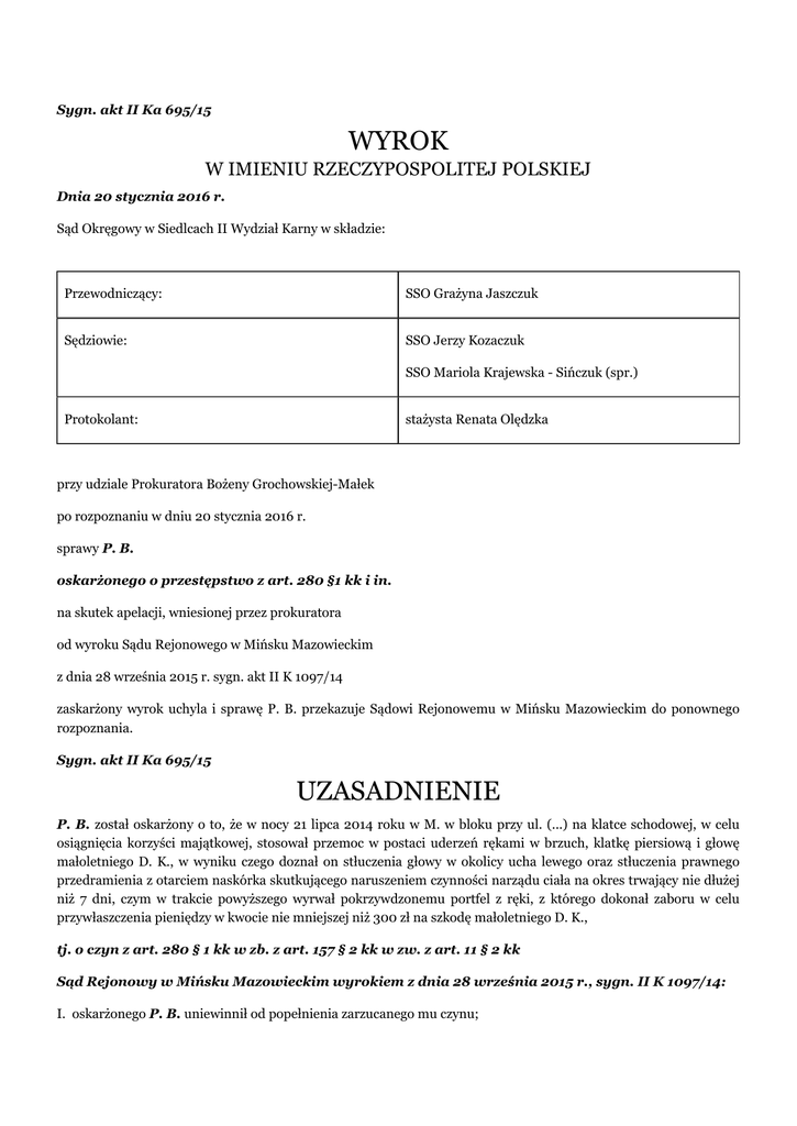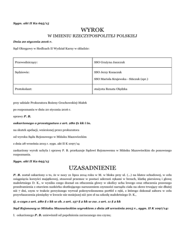 Sygn. akt II Ka 695/15 WYROK W IMIENIU RZECZYPOSPOLITEJ POLSKIEJ Dnia 20 stycznia 2016 r. Sąd Okręgowy w Siedlcach II Wydział Karny w składzie: Przewodniczący: SSO Grażyna Jaszczuk Sędziowie: SSO Jerzy Kozaczuk SSO Mariola Krajewska - Sińczuk (spr.) Protokolant: stażysta Renata Olędzka przy udziale Prokuratora Bożeny Grochowskiej-Małek po rozpoznaniu w dniu 20 stycznia 2016 r. sprawy P. B. oskarżonego o przestępstwo z art. 280 §1 kk i in. na skutek apelacji, wniesionej przez prokuratora od wyroku Sądu Rejonowego w Mińsku Mazowieckim z dnia 28 września 2015 r. sygn. akt II K 1097/14 zaskarżony wyrok uchyla i sprawę P. B. przekazuje Sądowi Rejonowemu w Mińsku Mazowieckim do ponownego rozpoznania. Sygn. akt II Ka 695/15 UZASADNIENIE P. B. został oskarżony o to, że w nocy 21 lipca 2014 roku w M. w bloku przy ul. (...) na klatce schodowej, w celu osiągnięcia korzyści majątkowej, stosował przemoc w postaci uderzeń rękami w brzuch, klatkę piersiową i głowę małoletniego D. K., w wyniku czego doznał on stłuczenia głowy w okolicy ucha lewego oraz stłuczenia prawnego przedramienia z otarciem naskórka skutkującego naruszeniem czynności narządu ciała na okres trwający nie dłużej niż 7 dni, czym w trakcie powyższego wyrwał pokrzywdzonemu portfel z ręki, z którego dokonał zaboru w celu przywłaszczenia pieniędzy w kwocie nie mniejszej niż 300 zł na szkodę małoletniego D. K., tj. o czyn z art. 280 § 1 kk w zb. z art. 157 § 2 kk w zw. z art. 11 § 2 kk Sąd Rejonowy w Mińsku Mazowieckim wyrokiem z dnia 28 września 2015 r., sygn. II K 1097/14: I. oskarżonego P. B. uniewinnił od popełnienia zarzucanego mu czynu; II. wydatki postępowania przejął na rachunek Skarbu Państwa. Apelację od przedstawionego wyżej wyroku wniósł prokurator, zaskarżając go w całości na niekorzyść oskarżonego. Orzeczeniu temu zarzucił obrazę przepisów prawa procesowego w postaci art. 4 kpk, art. 7 kpk, art. 410 kpk, art. 424 § 1 pkt 1 kpk, polegającą na uwzględnieniu jedynie okoliczności przemawiających na korzyść oskarżonego, przekroczeniu granic swobodnej oceny zgromadzonego materiału dowodowego, dokonanej wbrew zasadom prawidłowego rozumowania oraz wskazań wiedzy i doświadczenia życiowego, oparcie ustaleń jedynie na części zebranego materiału dowodowego, co w konsekwencji doprowadziło do niesłusznego uznania zeznań pokrzywdzonego za niewiarygodne w całości, w sytuacji gdy prawidłowa ocena zeznań tego pokrzywdzonego w odniesieniu do prawidłowej oceny pozostałych dowodów, tj. zeznań świadka M. W., czynności okazania, dokumentacji medycznej, oględzin miejsca rozboju, oględzin ciała pokrzywdzonego, opinii biegłego lekarza, prowadzi do wniosku, iż zeznania pokrzywdzonego są wiarygodne, a oskarżony popełnił zarzucany mu czyn. Stawiając powyższy zarzut prokurator wniósł o uchylenie zaskarżonego wyroku i przekazanie sprawy do ponownego rozpoznania Sądowi Rejonowemu w Mińsku Mazowieckim. Na rozprawę odwoławczą nie stawił się oskarżony, o terminie zawiadomiony prawidłowo. Prokurator poparł apelację i wniosek w niej zawarty. Sąd Okręgowy w Siedlcach zważył, co następuje: Apelacja prokuratora jest zasadna i jako taka zasługiwała na uwzględnienie. Nie przesądzając kwestii ostatecznego rozstrzygnięcia w sprawie niniejszej stwierdzić należy, że wyrok Sądu Rejonowego w Siedlcach musiał zostać uchylony, a sprawa przekazana do ponownego rozpoznania, bowiem orzeczenie to zostało wydane z obrazą przepisów prawa procesowego, a mianowicie art. 4 kpk, art. 7 kpk, art. 410 kpk i art. 424 § 1 kpk. Błędy, jakich dopuścił się Sąd a quo, wykluczają możliwość merytorycznej kontroli wyroku tegoż Sądu w postępowaniu odwoławczym. Podkreślić przy tym należy, iż uchybienia Sądu I instancji w zakresie ustaleń stanu faktycznego wynikają bezpośrednio z tego, że poczynione zostały dowolnie, z przekroczeniem granic swobodnej oceny dowodów, w sprzeczności z zasadami logiki, doświadczenia życiowego i prawidłowego rozumowania. Nadto Sąd meriti oparł ustalenia jedynie na części zebranego materiału dowodowego, eksponując okoliczności przemawiające jedynie na korzyść P. B., a pomijając te, które przemawiały na jego niekorzyść. Mimo uwzględnienia przez Sąd II instancji wszystkich zarzutów apelacyjnych wskazanych przez prokuratora, za jej wiodący uznano zarzut obrazy art. 7 kpk. W tym miejscu przypomnieć należy, że zgodnie z utrwalonym orzecznictwem Sądu Najwyższego oraz sądów powszechnych, przekonanie sądu o wiarygodności jednych dowodów i niewiarygodności innych pozostaje pod ochroną przepisu art. 7 kpk, jeśli tylko: - jest poprzedzone ujawnieniem w toku rozprawy głównej całokształtu okoliczności sprawy; - stanowi wyraz rozważenia wszystkich okoliczności przemawiających na korzyść, jak i na niekorzyść oskarżonego; - jest zgodne ze wskazaniami wiedzy i doświadczenia życiowego, a nadto zostało wyczerpująco i logicznie uargumentowane w uzasadnieniu wyroku (postanowienie Sądu Najwyższego z dnia 28 kwietnia 2015 r., sygn. II KK 89/15, Prok. i Pr. 2015 nr 7-8, poz. 7, Prok. i Pr. 2015 nr 7-8, poz. 8, Legalis Numer 1242114, podobnie: Sąd Apelacyjny w Warszawie w wyroku z dnia 13 października 2014 r., sygn. II AKa 262/14, Legalis Numer 1092983; Sąd Apelacyjny w Gdańsku w wyroku z dnia 22 stycznia 2014 r., sygn. II AKa 415/13, Legalis Numer 992862; Sąd Apelacyjny w Łodzi w wyroku z dnia 26 lutego 2013 r., sygn. II AKa 283/12, Legalis Numer 734294). Odnosząc powyższe do zaskarżonego orzeczenia należy stwierdzić, iż dokonana przez Sąd Rejonowy w Mińsku Mazowieckim ocena dowodów nie odpowiada wymogom cytowanego orzeczenia Sądu Najwyższego, dotyczącego wszechstronnego rozważenia okoliczności sprawy, dlatego też rozumowanie Sądu I instancji przedstawione w pisemnych motywach zaskarżonego wyroku nie mogło zyskać aprobaty Sądu O