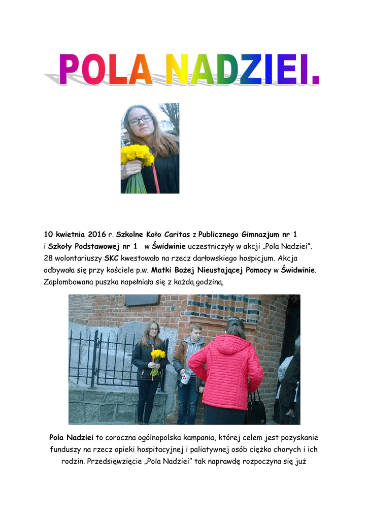 10 kwietnia 2016 r. Szkolne Koło Caritas z Publicznego Gimnazjum nr 1 i Szkoły Podstawowej nr 1 w Świdwinie uczestniczyły w akcji „Pola Nadziei”. 28 wolontariuszy SKC kwestowało na rzecz darłowskiego hospicjum. Akcja odbywała się przy kościele p.w. Matki Bożej Nieustającej Pomocy w Świdwinie. Zaplombowana puszka napełniała się z każdą godziną. Pola Nadziei to coroczna ogólnopolska kampania, której celem jest pozyskanie funduszy na rzecz opieki hospitacyjnej i paliatywnej osób ciężko chorych i ich rodzin. Przedsięwzięcie „Pola Nadziei” tak naprawdę rozpoczyna się już w październiku, kiedy zasadzane są żonkile, często w ogródkach przy hospicjach. Żonkile to kwiaty, które są symbolem nadziei – przypominają o ludziach cierpiących, nieuleczalnie chorych, potrzebujących naszej pomocy i opieki w ostatnim, trudnym dla nich okresie życia. Poprzez swoją łagodność i delikatność uświadamiają wyższe cele istnienia, oznaczając kruchość ludzkiej egzystencji. Kwiaty te, jako jedne z pierwszych, kwitną na początku wiosny, dlatego stały się międzynarodowym symbolem nadziei. Wiosną, w okresie Wielkanocnym, kiedy żonkile zaczynają rozkwitać, w parafiach Diecezji Koszalińsko – Kołobrzeskiej wolontariusze Caritas kwestują na rzecz nieuleczalnie chorych przebywających hospicjum im. Bpa Czesława Domina w Darłowie.