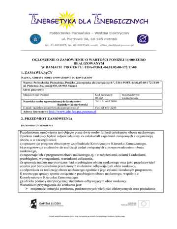 Politechnika Poznańska – Wydział Elektryczny ul. Piotrowo 3A, 60-965 Poznań tel. 61-6652077, fax. 61-6652548, email: [email protected] OGŁOSZENIE O ZAMÓWIENIU O WARTOŚCI PONIŻEJ 14 000 EURO REALIZOWANYM W RAMACH PROJEKTU: UDA-POKL-04.01.02-00-172/11-00 1. ZAMAWIAJĄCY NAZWA, ADRESY I OSOBY UPOWAŻNIONE DO KONTAKTÓW Nazwa: Politechnika Poznańska, Projekt ,,Energetyka dla energicznych”, UDA-POKL-04.01.02-00-172/11-00 ul. Piotrowo 3A, pokój 830, 60-965 Poznań Adres pocztowy: Miejscowość: Poznań Kod pocztowy: 60-965 Tel.: 61 665 2030 Województwo: wielkopolskie Nazwisko osoby upoważnionej do kontaktów: Radosław Szczerbowski E-mail: [email protected] Fax: 61 665 2280 Adresy internetowe http://www.ede.fee.put.poznan.pl 2. PRZEDMIOT ZAMÓWIENIA PRZEDMIOT ZAMÓWIENIA Przedmiotem zamówienia jest objęcie przez dwie osoby funkcji opiekunów obozu naukowego. Opiekun naukowy będzie odpowiedzialny za całokształt zagadnień związanych z organizacją obozu, a w szczególności: a) opracowuje program obozu przy współudziale Koordynatora Kierunku Zamawianego, b) przygotowuje studentów do realizacji zadań związanych z przeprowadzeniem obozu naukowego, c) zapoznaje ich z programem obozu naukowego, tj. : z założeniami, celami i zadaniami, przebiegiem, wymaganiami, warunkami zaliczenia, d) sprawuje nadzór merytoryczny nad przebiegiem obozu naukowego oraz jako przedstawiciel uczelni jest bezpośrednim przełożonym studentów odbywających obóz naukowy, e) odpowiada za realizację obozu naukowego zgodnie z jego celami i ustalonym programem, f) rozstrzyga sprawy sporne związane z przebiegiem obozu naukowego, wspólnie z Koordynatorem Kierunku Zamawianego. g) udziela pomocy merytorycznej studentom odbywającym obóz naukowy. Warunkiem przystąpienia do konkursu jest: znajomość tematyki pomiarów podstawowych wielkości elektrycznych oraz posiadanie Projekt współfinansowany przez Unię Europejską w ramach Europejskiego Funduszu Społecznego Politechnika Poznańska – Wydział Elektryczny ul. Piotrowo 3A, 60-965 Poznań tel. 61-6652077, fax. 61-6652548, email: [email protected] uprawnień elektrycznych na stanowiskach Eksploatacji oraz Dozoru w zakresie obsługi, konserwacji, remontów, montażu i kontrolno-pomiarowym, znajomość zagadnień związanych z opracowywaniem oraz tworzeniem założeń do gminnych planów zaopatrzenia w energię elektryczną, ciepło i paliwa gazowe lub znajomość wykonywania audytów energetycznych. Obóz Naukowy odbywać się będzie w Gminie Nowa Sól. Termin obozu naukowego: 8-21 lipiec 2013 r. Ogłoszenie dotyczy zamówienia realizowanego w ramach projektów współfinansowanych ze środków EFS w ramach POKL lata 2007-2013 CZAS TRWANIA ZAMÓWIENIA LUB TERMIN WYKONANIA Termin obozu naukowego: 8-21 lipiec 2013 r. 4. KRYTERIA OCENY OFERT ORAZ ICH ZNACZENIE CENA (100%) 5. INFORMACJE ADMINISTRACYJNE Miejsce i termin składania ofert Miejsce składania ofert (adres): ): ul. Piotrowo 3A, pokój 830, 60-965 Poznań lub mailowo na adres: [email protected] data: dni robocze od 26/06/2013 do 01/07/2013 Godzina: 8:00-14:00 Miejsce i termin otwarcia ofert Miejsce otwarcia ofert (adres): ul. Piotrowo 3A, pokój 830, 60-965 Poznań Data: 02/07/2013 Godzina: 9:00 Projekt współfinansowany przez Unię Europejską w ramach Europejskiego Funduszu Społecznego