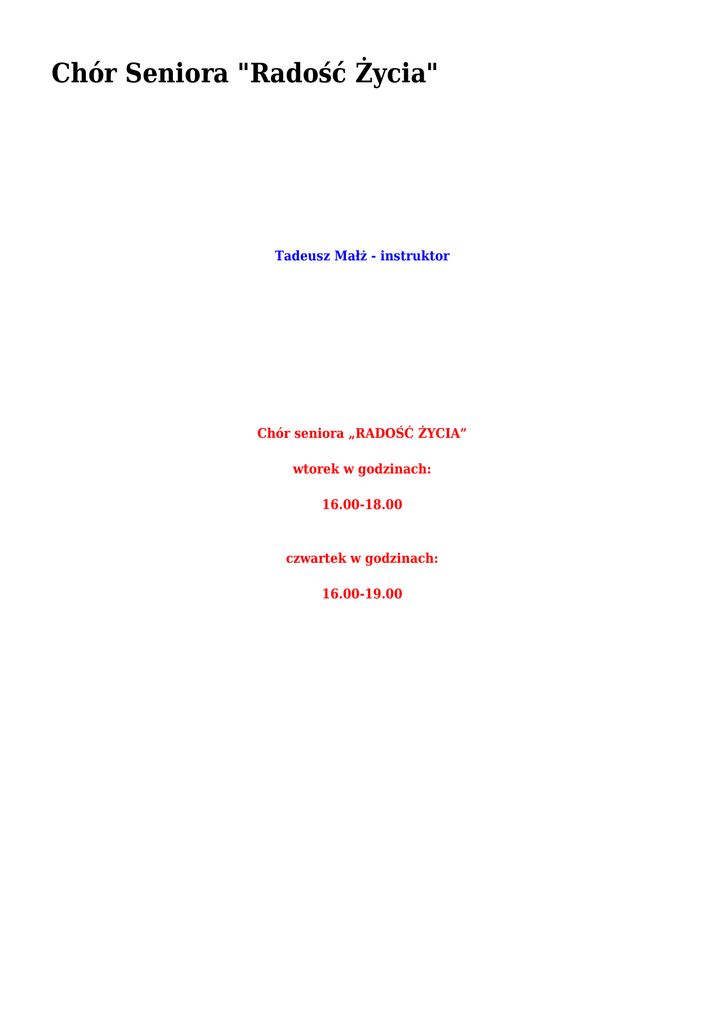 Chór Seniora "Radość Życia" Tadeusz Małż - instruktor Chór seniora „RADOŚĆ ŻYCIA” wtorek w godzinach: 16.00-18.00 czwartek w godzinach: 16.00-19.00