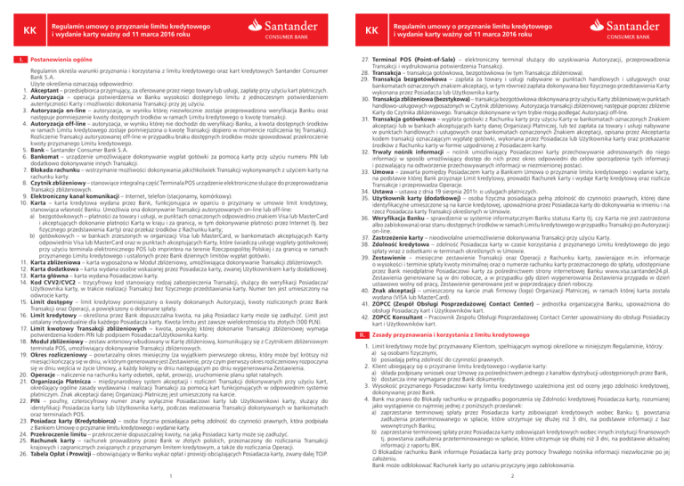 KK I. Regulamin umowy o przyznanie limitu kredytowego i wydanie karty ważny od 11 marca 2016 roku Postanowienia ogólne Regulamin określa warunki przyznania i korzystania z limitu kredytowego oraz kart kredytowych Santander Consumer Bank S.A. Użyte określenia oznaczają odpowiednio: 1.Akceptant – przedsiębiorca przyjmujący, za oferowane przez niego towary lub usługi, zapłatę przy użyciu kart płatniczych. 2.Autoryzacja – operacja potwierdzenia w Banku wysokości dostępnego limitu z jednoczesnym potwierdzeniem autentyczności Karty i możliwości dokonania Transakcji przy jej użyciu. 3.Autoryzacja on-line – autoryzacja, w wyniku której niezwłocznie zostaje przeprowadzona weryfikacja Banku oraz następuje pomniejszenie kwoty dostępnych środków w ramach Limitu kredytowego o kwotę transakcji. 4.Autoryzacja off-line – autoryzacja, w wyniku której nie dochodzi do weryfikacji Banku, a kwota dostępnych środków w ramach Limitu kredytowego zostaje pomniejszona o kwotę Transakcji dopiero w momencie rozliczenia tej Transakcji. Rozliczenie Transakcji autoryzowanej off-line w przypadku braku dostępnych środków może spowodować przekroczenie kwoty przyznanego Limitu kredytowego. 5.Bank – Santander Consumer Bank S.A. 6.Bankomat – urządzenie umożliwiające dokonywanie wypłat gotówki za pomocą karty przy użyciu numeru PIN lub dodatkowo dokonywanie innych Transakcji. 7.Blokada rachunku – wstrzymanie możliwości dokonywania jakichkolwiek Transakcji wykonywanych z użyciem karty na rachunku karty. 8.Czytnik zbliżeniowy – stanowiące integralną część Terminala POS urządzenie elektroniczne służące do przeprowadzania Transakcji zbliżeniowych. 9.Elektroniczny kanał komunikacji – Internet, telefon (stacjonarny, komórkowy). 10. Karta – karta kredytowa wydana przez Bank, funkcjonująca w oparciu o przyznany w umowie limit kredytowy, stanowiąca własność Banku. Umożliwia ona dokonywanie Transakcji autoryzowanych on-line lub off-line: a) bezgotówkowych – płatności za towary i usługi, w punktach oznaczonych odpowiednio znakiem Visa lub MasterCard i akceptujących dokonanie płatności Kartą w kraju i za granicą, w tym dokonywanie płatności przez Internet (tj. bez fizycznego przedstawienia Karty) oraz przekaz środków z Rachunku karty; b) gotówkowych – w bankach zrzeszonych w organizacji Visa lub MasterCard, w bankomatach akceptujących Karty odpowiednio Visa lub MasterCard oraz w punktach akceptujących Karty, które świadczą usługę wypłaty gotówkowej przy użyciu terminala elektronicznego POS lub imprintera na terenie Rzeczpospolitej Polskiej i za granicą w ramach przyznanego Limitu kredytowego i ustalonych przez Bank dziennych limitów wypłat gotówki. 11. Karta zbliżeniowa – karta wyposażona w Moduł zbliżeniowy, umożliwiająca dokonywanie Transakcji zbliżeniowych. 12. Karta dodatkowa – karta wydana osobie wskazanej przez Posiadacza karty, zwanej Użytkownikiem karty dodatkowej. 13. Karta główna – karta wydana Posiadaczowi karty. 14. Kod CVV2/CVC2 – trzycyfrowy kod stanowiący rodzaj zabezpieczenia Transakcji, służący do weryfikacji Posiadacza/ Użytkownika karty, w trakcie realizacji Transakcji bez fizycznego przedstawiania karty. Numer ten jest umieszczony na odwrocie karty. 15. Limit dostępny – limit kredytowy pomniejszony o kwoty dokonanych Autoryzacji, kwoty rozliczonych przez Bank Transakcji oraz Operacji, a powiększony o dokonane spłaty. 16. Limit kredytowy – określona przez Bank dopuszczalna kwota, na jaką Posiadacz karty może się zadłużyć. Limit jest ustalany indywidualnie dla każdego Posiadacza karty. Kwota limitu jest zawsze wielokrotnością stu złotych (100 PLN). 17. Limit kwotowy Transakcji zbliżeniowych – kwota, powyżej której dokonanie Transakcji zbliżeniowej wymaga potwierdzenia kodem PIN lub podpisem Posiadacza/Użytkownika karty. 18. Moduł zbliżeniowy – zestaw antenowy wbudowany w Kartę zbliżeniową, komunikujący się z Czytnikiem zbliżeniowym terminala POS, umożliwiający dokonywanie Transakcji zbliżeniowych. 19. Okres rozliczeniowy – powtarzalny okres miesięczny (za wyjątkiem pierwszego okresu, który może być krótszy niż miesiąc) kończący się w dniu, w którym generowane jest Zestawienie, przy czym pierwszy okres rozliczeniowy rozpoczyna się w dniu wejścia w życie Umowy, a każdy kolejny w dniu następującym po dniu wygenerowania Zestawienia. 20. Operacje – naliczenie na rachunku karty odsetek, opłat, prowizji, uruchomienie planu spłat ratalnych. 21. Organizacja Płatnicza – międzynarodowy system akceptacji i rozliczeń Transakcji dokonywanych przy użyciu kart, określający ogólne zasady wydawania i realizacji Transakcji za pomocą kart funkcjonujących w odpowiednim systemie płatniczym. Znak akceptacji danej Organizacji Płatniczej jest umieszczony na karcie. 22. PIN – poufny, czterocyfrowy numer znany wyłącznie Posiadaczowi karty lub Użytkownikowi karty, służący do identyfikacji Posiadacza karty lub Użytkownika karty, podczas realizowania Transakcji dokonywanych w bankomatach oraz terminalach POS. 23. Posiadacz karty (Kredytobiorca) – osoba fizyczna posiadająca pełną zdolność do czynności prawnych, która podpisała z Bankiem Umowę o przyznanie limitu kredytowego i wydanie karty. 24. Przekroczenie limitu – przekroczenie dopuszczalnej kwoty, na jaką Posiadacz karty może się zadłużyć. 25. Rachunek karty – rachunek prowadzony przez Bank w złotych polskich, przeznaczony do rozliczania Transakcji krajowych i zagranicznych związanych z przyznanym limitem kredytowym, a także do rozliczania Operacji. 26. Tabela Opłat i Prowizji – obowiązujący w Banku wykaz opłat i prowizji obciążających Posiadacza karty, zwany dalej TOiP. 1 KK Regulamin umowy o przyznanie limitu kredytowego i wydanie karty ważny od 11 marca 2016 roku 27. Terminal POS (Point-of-Sale) – elektroniczny terminal służący do uzy