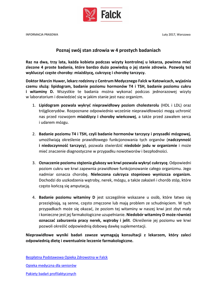 INFORMACJA PRASOWA Luty 2017, Warszawa Poznaj swój stan zdrowia w 4 prostych badaniach Raz na dwa, trzy lata, każda kobieta podczas wizyty kontrolnej u lekarza, powinna mieć zlecone 4 proste badania, które bardzo dużo powiedzą o jej stanie zdrowia. Pozwolą też wykluczyć częste choroby: miażdżycę, cukrzycę i choroby tarczycy. Doktor Marcin Huwer, lekarz rodzinny z Centrum Medycznego Falck w Katowicach, wyjaśnia czemu służą: lipidogram, badanie poziomu hormonów T4 i TSH, badanie poziomu cukru i witaminy D. Wszystkie te badania można wykonać podczas jednorazowej wizyty w laboratorium i dowiedzieć się w jakim stanie jest nasz organizm. 1. Lipidogram pozwala wykryć nieprawidłowy poziom cholesterolu (HDL i LDL) oraz trójglicerydów. Rozpoznane odpowiednio wcześnie nieprawidłowości mogą uchronić nas przed rozwojem miażdżycy i choroby wieńcowej, a także przed zawałem serca i udarem mózgu. 2. Badanie poziomu T4 i TSH, czyli badanie hormonów tarczycy i przysadki mózgowej, umożliwiają określenie prawidłowego funkcjonowania tych organów (nadczynność i niedoczynność tarczycy), pozwala stwierdzić niedobór jodu w organizmie i może mieć znaczenie diagnostyczne w przypadku nowotworów i bezpłodności. 3. Oznaczenie poziomu stężenia glukozy we krwi pozwala wykryć cukrzycę. Odpowiedni poziom cukru we krwi zapewnia prawidłowe funkcjonowanie całego organizmu. Jego nadmiar oznacza chorobę. Nieleczona cukrzyca stopniowo wyniszcza organizm. Dochodzi do uszkodzenia wątroby, nerek, mózgu, a także zakażeń i chorób stóp, które często kończą się amputacją. 4. Badanie poziomu witaminy D jest szczególnie wskazane u osób, które łatwo się przeziębiają, są senne, często zmęczone lub mają problem ze schudnięciem. W tych przypadkach może się okazać, że poziom tej witaminy w naszej krwi jest zbyt mały i konieczne jest jej farmakologiczne uzupełnianie. Niedobór witaminy D może również oznaczać zaburzenia pracy nerek, wątroby i jelit. Określenie jej poziomu we krwi pozwoli określić odpowiednią dobową dawkę suplementacji. Nieprawidłowe wyniki badań zawsze wymagają konsultacji z lekarzem, który zaleci odpowiednią dietę i ewentualnie leczenie farmakologiczne. Bezpłatna Podstawowa Opieka Zdrowotna w Falck Opieka medyczna dla seniorów Pakiety badań profilaktycznych