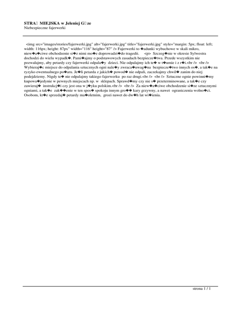 STRA� MIEJSKA w Jeleniej G�ze Niebezpieczne fajerwerki <img src="images/stories/fajerwerki.jpg" alt="fajerwerki.jpg" title="fajerwerki.jpg" style="margin: 5px; float: left; width: 116px; height: 87px" width="116" height="87" /> Fajerwerki to �adunki wybuchowe w skali mikro, niew�a�ciwe obchodzenie si�z nimi mo�e doprowadzi�do tragedii. <p> Szczeg�nie w okresie Sylwestra dochodzi do wielu wypadk�. Pami�ajmy o podstawowych zasadach bezpiecze�twa. Przede wszystkim nie pozwalajmy, aby petardy czy fajerwerki odpala�y dzieci. Nie odpalajmy ich te� w t�umie i z r�i.<br /> <br /> Wybieraj�c miejsce do odpalania sztucznych ogni nale�y zwraca�uwag�na bezpiecze�two innych os�, a tak�e na ryzyko ewentualnego po�aru. Je�li petarda z jakich� powod� nie odpali, zaczekajmy chwil� zanim do niej podejdziemy. Nigdy te� nie odpalajmy takiego fajerwerku po raz drugi.<br /> <br /> Sztuczne ognie powinni�my kupowa�jedynie w pewnych miejscach np. w sklepach. Sprawd�my czy nie s� przeterminowane, a tak�e czy zawieraj� instrukcj�i czy jest ona w j�yku polskim.<br /> <br /> Za niew�a�ciwe obchodzenie si�ze sztucznymi ogniami, a tak�e zak��enie w ten spos� spokoju innym gro�� kary grzywny, a nawet ograniczenia wolno�ci. Osobom, kt�e sprzedaj� petardy ma�oletnim, grozi nawet do dw�h lat wi�ienia. strona 1 / 1