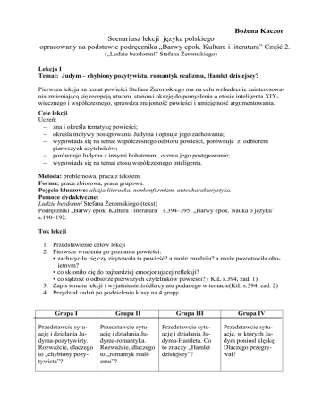 Bożena Kaczor Scenariusz lekcji języka polskiego opracowany na podstawie podręcznika „Barwy epok. Kultura i literatura” Część 2. („Ludzie bezdomni” Stefana Żeromskiego) Lekcja I Temat: Judym – chybiony pozytywista, romantyk realizmu, Hamlet dzisiejszy? Pierwsza lekcja na temat powieści Stefana Żeromskiego ma na celu wzbudzenie zainteresowania zmieniającą się recepcją utworu, stanowi okazję do pomyślenia o etosie inteligenta XIXwiecznego i współczesnego, sprawdza znajomość powieści i umiejętność argumentowania. Cele lekcji Uczeń: − zna i określa tematykę powieści; − określa motywy postępowania Judyma i opisuje jego zachowania; − wypowiada się na temat współczesnego odbioru powieści, porównuje z odbiorem pierwszych czytelników; − porównuje Judyma z innymi bohaterami, ocenia jego postępowanie; − wypowiada się na temat etosu współczesnego inteligenta. Metoda: problemowa, praca z tekstem. Forma: praca zbiorowa, praca grupowa. Pojęcia kluczowe: aluzja literacka, nonkonformizm, autocharakterystyka. Pomoce dydaktyczne: Ludzie bezdomni Stefana Żeromskiego (tekst) Podręczniki „Barwy epok. Kultura i literatura” s.394–395; „Barwy epok. Nauka o języku” s.190–192. Tok lekcji 1. Przedstawienie celów lekcji 2. Pierwsze wrażenia po poznaniu powieści: • zachwyciła cię czy zirytowała ta powieść? a może znudziła? a może pozostawiła obojętnym? • co skłoniło cię do najbardziej emocjonującej refleksji? • co sądzisz o odbiorze pierwszych czytelników powieści? ( KiL s.394, zad. 1) 3. Zapis tematu lekcji i wyjaśnienie źródła cytatu podanego w temacie(KiL s.394, zad. 2) 4. Przydział zadań po podzieleniu klasy na 4 grupy. Grupa I Grupa II Przedstawcie sytuację i działania Judyma-pozytywisty. Rozważcie, dlaczego to „chybiony pozytywista”? Przedstawcie sytuację i działania Judyma-romantyka. Rozważcie, dlaczego to „romantyk realizmu”? Grupa III Przedstawcie sytuację i działania Judyma-Hamleta. Co to znaczy „Hamlet dzisiejszy”? Grupa IV Przedstawcie sytuacje, w których Judym poniósł klęskę. Dlaczego przegrywał? Czas na wykonanie zadań – 15 minut. Prezentacja wyników pracy powinna trwać po 5 minut dla każdej grupy. 5. Wnioski po prezentacji: • Judym to nonkonformista. Do którego z bohaterów powieści pasuje to określenie? (ewentualnie: układamy zdania z tym pojęciem) • Jakie dostrzegacie podobieństwa, a jakie różnice w osobowości, postępowaniu oraz ideałach Wokulskiego i Judyma? (Kil s.395, zad. 4) • Na ile charakterystyka Judyma jest zarazem autocharakterystyką pisarza? (KiL s.395, zad.2b) • Czy Judymowie są dzisiaj potrzebni? Które cechy Judyma zaakceptuje współczesny inteligent? (NoJ s. 190-192) 6. Ocena pracy uczniów. 7. Praca domowa: KiL s. 395, zad 3. Obejrzyj Wenus z Milo (KiL s. 397) i Biednego rybaka (KiL s. 398) . Zapisz po trzy sądy wartościujące te dzieła sztuki. Lekcja II Temat: Między hedonizmem a altruizmem – Ludzie bezdomni Stefana Żeromskiego. Lekcja pod hasłem korespondencji sztuk oraz pogłębiania umiejętności interpretacyjnych kształtowanych poprzez porównanie własnego odbioru dzieł sztuki z artystycznym opisem Stefana Żeromskiego. Analiza środków artystycznego wyrazu służy utrwaleniu znajomości tropów artystycznych (KiL s.75–82) , rozwijaniu sprawności językowej uczniów, zmysłu estetycznego. W planowaniu działań uczniów wykorzystuję strategię przeżycia i badania. Cele Uczeń: − umiejscawia analizowany fragment w utworze i w sytuacji z życia bohatera; − czyta wskazany fragment ze zrozumieniem; − interpretuje analizowane dzieła sztuki na podstawie opisu pisarza; − wskazuje i interpretuje symbole; − ocenia postępowanie bohatera, opisuje jego rozterki; − formułuje wnioski uogólniające. Metoda: analiza dokumentacyjna. Pojęcia kluczowe: środki wyrazu – rzeźba, obraz, literatura; symbol, hedonizm, altruizm, liryzacja prozy Forma: praca zbiorowa, praca indywidualna. Pomoce dydaktyczne: Fragment rozdziału Wenus z Milo z „Ludzi bezdomnych” Wizerunek rzeźby Wenus z Milo (KiL s. 397) i reprodukcja Biednego rybaka P. de Chavannesa (KiL s. 398) O stylu artystycznym (NoJ s. 75–82) ; Wyrażamy uczucia (NoJ s. 142) Tok lekcji 1. 2. 3. Przedstawienie celów lekcji. Sprawdzenie pracy domowej (sądy wartościujące – indywidualna ocena oglądanych dzieł sztuki) W jakich okolicznościach te same dzieła sztuki oglądał Tomasz Judym? Jakie znaczenie dla Judyma miały poznane w Paryżu dzieła sztuki? ( indywidualna praca z fragmentem powieści. Notowanie spostrzeżeń w tabeli): Cechy Wenus z Milo 4. 5. 6. 7. 8. 9. Symbolika Wenus Cechy Ubogiego rybaka Symbolika rybaka Wskazany uczeń prezentuje po15 minutach wyniki pracy z tekstem. Uzupełnianie spostrzeżeń na bieżąco Porównanie odczytań z interpretacją J. Paszka (KiL s.397). Analiza środków wyrazu w opisie w powieści i na obrazie P. de Chavannesa. (NoJ s. 75–82); propozycja ciekawej notatki efektów pracy ( np. mapa mentalna, schemat, tabela). Który z obrazów (literacki, malarski) bardziej poruszył Twoją wyobraźnię? Dlaczego? Jakie drogi życia stały otworem przed praktykującym w Paryżu doktorem Tomaszem Judymem? Jak można określić te drogi życiowe? Podanie i zapisanie tematu lekcji. Ćwiczenia językowe, np. budowanie definicji słownikowych lub dopisywanie wyrazów pochodnych do pojęć hedonizm i altruizm. Jaką drogę wybrał Tomasz Judym? Jaki symbol w powieści to określa? Odczytajcie opis rozdartej sosny. Nazwijcie uczucia Judyma adekwatne do tej sytuacji.( NoJ s. 142) Dlaczego Judym jest jak rozdarta sosna? Praca domowa: KiL s.398, zad. 10 ( pierwsze pytanie) lub Zilustruj sytuację Judyma po rozstaniu z Joanną w taki sposób, aby wykorzystać wszystkie symbole interpretowane na dzisiejszej lekcji. Pamiętaj o zastosowaniu sugestywnych środków wyrazu. Lekcja III Temat: Hart sei1 – czy tak trzeba?- Lu