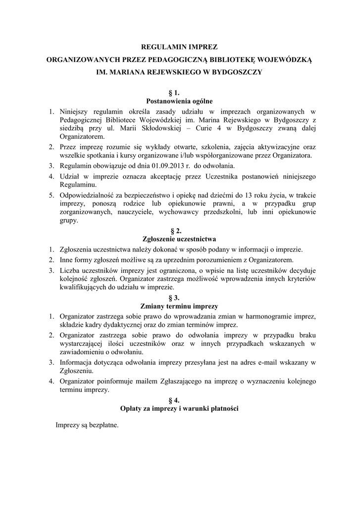 REGULAMIN IMPREZ ORGANIZOWANYCH PRZEZ PEDAGOGICZNĄ BIBLIOTEKĘ WOJEWÓDZKĄ IM. MARIANA REJEWSKIEGO W BYDGOSZCZY 1. 2. 3. 4. 5. 1. 2. 3. 1. 2. 3. 4. § 1. Postanowienia ogólne Niniejszy regulamin określa zasady udziału w imprezach organizowanych w Pedagogicznej Bibliotece Wojewódzkiej im. Marina Rejewskiego w Bydgoszczy z siedzibą przy ul. Marii Skłodowskiej – Curie 4 w Bydgoszczy zwaną dalej Organizatorem. Przez imprezę rozumie się wykłady otwarte, szkolenia, zajęcia aktywizacyjne oraz wszelkie spotkania i kursy organizowane i/lub współorganizowane przez Organizatora. Regulamin obowiązuje od dnia 01.09.2013 r. do odwołania. Udział w imprezie oznacza akceptację przez Uczestnika postanowień niniejszego Regulaminu. Odpowiedzialność za bezpieczeństwo i opiekę nad dziećmi do 13 roku życia, w trakcie imprezy, ponoszą rodzice lub opiekunowie prawni, a w przypadku grup zorganizowanych, nauczyciele, wychowawcy przedszkolni, lub inni opiekunowie grupy. § 2. Zgłoszenie uczestnictwa Zgłoszenia uczestnictwa należy dokonać w sposób podany w informacji o imprezie. Inne formy zgłoszeń możliwe są za uprzednim porozumieniem z Organizatorem. Liczba uczestników imprezy jest ograniczona, o wpisie na listę uczestników decyduje kolejność zgłoszeń. Organizator zastrzega możliwość wprowadzenia innych kryteriów kwalifikujących do udziału w imprezie. § 3. Zmiany terminu imprezy Organizator zastrzega sobie prawo do wprowadzania zmian w harmonogramie imprez, składzie kadry dydaktycznej oraz do zmian terminów imprez. Organizator zastrzega sobie prawo do odwołania imprezy w przypadku braku wystarczającej ilości uczestników oraz w innych przypadkach wskazanych w zawiadomieniu o odwołaniu. Informacja dotycząca odwołania imprezy przesyłana jest na adres e-mail wskazany w Zgłoszeniu. Organizator poinformuje mailem Zgłaszającego na imprezę o wyznaczeniu kolejnego terminu imprezy. § 4. Opłaty za imprezy i warunki płatności Imprezy są bezpłatne. 1. 2. 3. 4. 1. 2. § 5. Ochrona danych osobowych i wizerunku Uczestnika Zgodnie z Ustawą o ochronie danych osobowych z dnia 29 sierpnia 1997 roku (Dz. U. z dnia 29 października 1997 roku, Nr 133, poz. 833.) Organizator nie przekazuje, nie sprzedaje i nie użycza zgromadzonych danych osobowych Uczestników innym osobom lub instytucjom. Dane osobowe podane przez uczestnika (imię i nazwisko, adres e-mail) będą jednak przetwarzane przez Organizatora w celach marketingowych, przeprowadzenia szkolenia oraz w celach komunikacji pomiędzy Organizatorem a Uczestnikiem. Poprzez przystąpienie do udziału w Imprezie, uczestnicy wyrażają zgodę na przetwarzanie swoich danych osobowych przez Organizatora Organizator zastrzega sobie prawo utrwalania przebiegu imprezy w formie zapisu fotograficznego, filmowego oraz dźwiękowego w celach dokumentacyjnych, edukacyjnych i promocyjno-marketingowych. Udział w imprezie oznacza wyrażenie przez Uczestnika zgody na nieodpłatne utrwalenie swojego wizerunku w wyżej wskazanym zakresie, a także na jego rozpowszechnianie bez ograniczeń terytorialnych i czasowych, w szczególności poprzez umieszczanie fotografii, filmów i nagrań dźwiękowych: w serwisach internetowych prowadzonych przez Organizatora, w innych elektronicznych środkach przekazu zarządzanych, lub wykorzystywanych w dowolnym zakresie przez Organizatora, w publikacjach Organizatora, a także w publikacjach i serwisach osób trzecich, z zastrzeżeniem, że przedmiotowe fotografie i filmy w publikacjach osób trzecich mogą jedynie ilustrować informacje o działalności prowadzonej przez Organizatora, a ich wykorzystywanie w innym kontekście nie jest dozwolone. Organizator zapewnia, że wizerunek uczestników imprez nie będzie wykorzystywany przez niego w celach zarobkowych, a uczestnicy przyjmują do wiadomości, że z tytułu jego użycia nie przysługują im jakiekolwiek roszczenia, w szczególności prawo do wynagrodzenia. § 6. Odpowiedzialność Zabrania się Uczestnikom rejestrowania dźwięku, fotografowania i filmowania imprez oraz rozpowszechniania materiałów dydaktycznych bez zgody Organizatora i wykładowcy. Organizator oświadcza, że treści przekazane przez niego w trakcie imprezy mają charakter wyłącznie edukacyjny. Organizator nie ponosi żadnej odpowiedzialności za szkody powstałe u Uczestników lub osób trzecich, w związku lub na skutek wykorzystania przez Uczestników informacji, wiedzy lub umiejętności zdobytych w trakcie imprezy, w sposób niezgodny z ich przeznaczeniem. § 7. Zmiany Wszelkie zmiany w niniejszym regulaminie - stałe lub tymczasowe - zostaną opublikowane na stronie internetowej biblioteki: www.pbw.bydgoszcz.pl