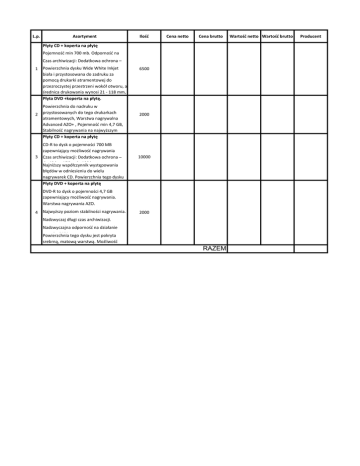 L.p. Asortyment Ilość Cena netto Cena brutto Płyty CD + koperta na płytę Pojemność min 700 mb. Odporność na działanie promieniDodatkowa UV. Czas archiwizacji: ochrona – 1 2 3 do 40 lat; AZOdysku – do 100 lat.White Inkjet Powierzchnia Wide biała i przystosowana do zadruku za pomocą drukarki atramentowej do przezroczystej przestrzeni wokół otworu, a średnica drukowania wynosi 21 - 118 mm, Płyta DVD +koperta na płytę. Powierzchnia do nadruku w przystosowanych do tego drukarkach atramentowych, Warstwa nagrywalna Advanced AZO+ , Pojemność min 4,7 GB, Stabilność nagrywania na najwyższym Płyty CD + koperta na płytę CD-R to dysk o pojemności 700 MB zapewniający możliwość nagrywania Czas archiwizacji: Dodatkowa ochrona – do 40 lat; współczynnik AZO – do 100 występowania lat. Najniższy 6500 2000 10000 błędów w odniesieniu do wielu nagrywarek CD. Powierzchnia tego dysku Płyty DVD + koperta na płytę DVD-R to dysk o pojemności 4,7 GB zapewniający możliwość nagrywania. Warstwa nagrywania AZO. 4 Najwyższy poziom stabilności nagrywania. 2000 Nadzwyczaj długi czas archiwizacji. Nadzwyczajna odporność na działanie promieni UV tego dysku jest pokryta Powierzchnia srebrną, matową warstwą. Możliwość RAZEM Wartość netto Wartość brutto Producent