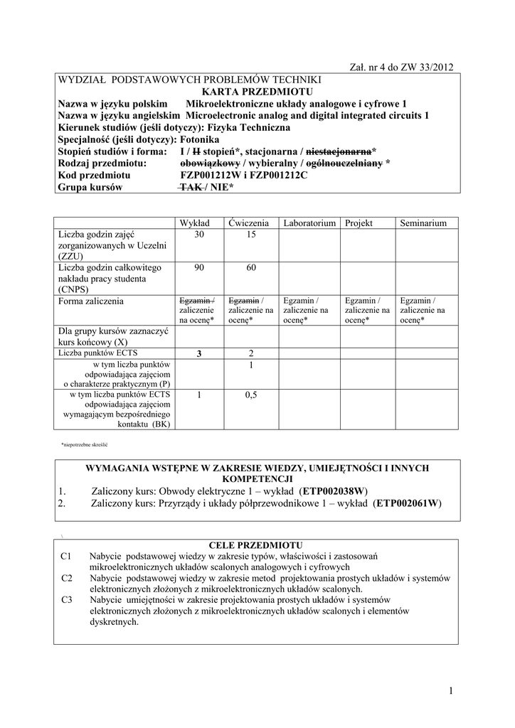 Zał. nr 4 do ZW 33/2012 WYDZIAŁ PODSTAWOWYCH PROBLEMÓW TECHNIKI KARTA PRZEDMIOTU Nazwa w języku polskim Mikroelektroniczne układy analogowe i cyfrowe 1 Nazwa w języku angielskim Microelectronic analog and digital integrated circuits 1 Kierunek studiów (jeśli dotyczy): Fizyka Techniczna Specjalność (jeśli dotyczy): Fotonika Stopień studiów i forma: I / II stopień*, stacjonarna / niestacjonarna* Rodzaj przedmiotu: obowiązkowy / wybieralny / ogólnouczelniany * Kod przedmiotu FZP001212W i FZP001212C Grupa kursów TAK / NIE* Liczba godzin zajęć zorganizowanych w Uczelni (ZZU) Liczba godzin całkowitego nakładu pracy studenta (CNPS) Forma zaliczenia Wykład 30 Ćwiczenia 15 90 60 Egzamin / zaliczenie na ocenę* Egzamin / zaliczenie na ocenę* 3 2 1 1 0,5 Laboratorium Projekt Seminarium Egzamin / zaliczenie na ocenę* Egzamin / zaliczenie na ocenę* Egzamin / zaliczenie na ocenę* Dla grupy kursów zaznaczyć kurs końcowy (X) Liczba punktów ECTS w tym liczba punktów odpowiadająca zajęciom o charakterze praktycznym (P) w tym liczba punktów ECTS odpowiadająca zajęciom wymagającym bezpośredniego kontaktu (BK) *niepotrzebne skreślić WYMAGANIA WSTĘPNE W ZAKRESIE WIEDZY, UMIEJĘTNOŚCI I INNYCH KOMPETENCJI 1. 2. Zaliczony kurs: Obwody elektryczne 1 – wykład (ETP002038W) Zaliczony kurs: Przyrządy i układy półprzewodnikowe 1 – wykład (ETP002061W) \ C1 C2 C3 CELE PRZEDMIOTU Nabycie podstawowej wiedzy w zakresie typów, właściwości i zastosowań mikroelektronicznych układów scalonych analogowych i cyfrowych Nabycie podstawowej wiedzy w zakresie metod projektowania prostych układów i systemów elektronicznych złożonych z mikroelektronicznych układów scalonych. Nabycie umiejętności w zakresie projektowania prostych układów i systemów elektronicznych złożonych z mikroelektronicznych układów scalonych i elementów dyskretnych. 1 PRZEDMIOTOWE EFEKTY KSZTAŁCENIA Z zakresu wiedzy: PEK_W01 Ma podstawową wiedzę w zakresie typów, właściwości i parametrów projektowych analogowych i cyfrowych układów mikroelektronicznych PEK_W02 Ma podstawową wiedzę w zakresie metod obliczania prostych układów oraz systemów elektronicznych i optoelektronicznych z elementami dyskretnym i układami scalonymi Z zakresu umiejętności: PEK_U01 Potrafi zastosować poznane metody do obliczania prostych układów elektronicznych i optoelektronicznych z układami scalonymi i elementami dyskretnymi Z zakresu kompetencji społecznych: PEK_K01 Rozumie potrzebę samodzielnego dokształcania, wykorzystuje współczesne środki przekazu do pozyskiwania potrzebnych informacji TREŚCI PROGRAMOWE Wy1 Wy2 Wy3 Wy4 Wy5 Wy6 Wy7 Forma zajęć - wykład Program wykładu, warunki zaliczenia. Sposoby opisu układów elektronicznych. Podstawowe elementy półprzewodnikowe – diody prostownicze, Zenera, pojemnościowe, LED, lasery diodowe. Tranzystory bipolarne, proste układy, metody rachunkowe. Wzmacniacze tranzystorowe, uproszczona metodyka analizy tych układów. Tranzystor jako klucz elektroniczny. Tranzystory polowe JFET, MOSFET jako podstawa technologii układów scalonych. Inwerter CMOS. Tranzystorowy wzmacniacz różnicowy – podstawowy element wzmacniaczy operacyjnych, uproszczona analiza, właściwości struktur różnicowych. Wzmacniacz operacyjny, modele wzmacniacza idealnego i rzeczywistego. Równania Kirchhoffa wzmacniacza ze sprzężeniem zwrotnym, układ wzmacniający odwracający i nieodwracający. Sprzężenie zwrotne, zasada sprzężenia zwrotnego, czwórnikowy schemat blokowy, równania. Podstawowe typy ujemnego sprzężenia zwrotnego ujemnego (USZ). Właściwości układów z USZ. Właściwości częstotliwościowe wzmacniaczy operacyjnych – charakterystyki częstotliwościowe. Odpowiedź na skok jednostkowy, współczynnik Slew Rate. Wymiana wzmocnienia i pasma. Przykłady prostych filtrów aktywnych RC I i II rzędu i ich charakterystyki częstotliwościowe. Wykresy Bodego. Dodatnie sprzężenie zwrotne w układach ze wzmacniaczami Wy9 operacyjnymi, generatory sygnałów sinusoidalnych RC i LC. Układy wzmacniaczy operacyjnych z elementami nieliniowymi. Wy10 Struktury złożone ze wzmacniaczy operacyjnych. Wzmacniacze Wy8 Liczba godzin 2 2 2 2 2 2 2 2 2 2 2 Wy11 Wy12 Wy13 Wy14 Wy15 instrumentalne. Wzmacniacze rail - to – rail, w pełni różnicowe, o małym poborze energii, z pojedynczym zasilaniem. Komparator napięcia, komparator napięcia z histerezą, charakterystyki. Przetwornik cyfrowo – analogowy, układ ze źródłami prądowymi. Przetwornik cyfrowo – analogowy z siecią rezystorów. Przetwornik analogowo-cyfrowy z podwójnym całkowaniem. Przetworniki analogowo-cyfrowe typu flash oraz z kompensacją wagową. Przetworniki analogowo-cyfrowe. Schematy blokowe, zasady działania, właściwości. Sygnały i układy logiczne. Standard sygnałów TTL. Układy scalone SSI. Funkcje logiczne, podstawowe funktory. Tablice prawdy. Kody binarne. Zaliczenie. Suma godzin Forma zajęć - ćwiczenia Ćw1 Ćw2 Ćw3 Ćw4 Ćw5 Ćw6 Ćw7 Ćw8 Ćw9 Ćw10 Ćw11 Ćw12 Ćw13 Ćw14 Ćw15 Obliczanie układów z diodami prostowniczymi i przełączającymi oraz diodami LED. Stabilizatory napięcia. Układy, obliczanie. Obliczanie układów tranzystorowych 1 – wzmacniacz w układzie WE. Podstawowe zasady. Obliczanie układów tranzystorowych 2 – wzmacniacz w układzie WE. Wzmacniacz różnicowy. Wtórnik napięcia, źródło prądowe, klucz tranzystorowy, układ Darlingtona. Wzmacniacz operacyjny, układy ze sprzężeniem zwrotnym 1 – metody obliczeniowe. Wzmacniacz operacyjny, układy ze sprzężeniem zwrotnym 2 – przykłady projektowo – obliczeniowe. Wyznaczanie charakterystyk częstotliwościowych układów ze sprzężeniem zwrotnym. Przetworniki sygnałów I/U. Współpraca z czujnikami o wyjściu prądowym Źródła prądowe, VCCS. Uklad NIC. Generator napięcia sinusoidalnego – z mostkiem Wiena, oscylatory z obwodami rezonansowymi. Generator sygnału pr