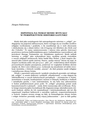 FILOZOFIA I NAUKA Studia filozoficzne i interdyscyplinarne Tom 4, 2016 Jürgen Habermas HIPOTEZA NA TEMAT SENSU RYTUAŁU W PERSPEKTYWIE HISTORII GATUNKU Kiedy dziś jako socjologowie lub antropologowie mówimy o „religii”, posługujemy się pojęciem inkluzywnym, które rozciąga się na wszelkie możliwe religijne wyobrażenia i praktyki, o ile manifestuje się w nich obcowanie i obchodzenie się z siłami dobra i zła (Umgang mit Mächten des Heils und des Unheils).1 To samo zainteresowanie i interes (das gleiche Interesse) przyświeca zarówno kalifornijskiemu guru i indiańskiemu czarownikowi, jak prorokowi Starego Testamentu czy chińskiemu mędrcowi. Kiedy jednak mówimy o „religii” jako wykształceni laicy, myślimy przede wszystkim o owych religiach światowych, które badał Max Weber, a Karl Jaspers tłumaczył jako wykwit epoki osiowej. Nazwa „epoka osiowa” bierze się stąd, że Jaspers wyobraża sobie rok 500 p.n.e. jako „oś”, wokół której obrót dziejów powszechnych niejako przyspiesza, ponieważ we względnie krótkim okresie między ok. 800 i 200 rokiem p.n.e. wydarzyły się niezależnie od siebie rewolucje mentalne, z których wynikły „mocne”, do dziś potężne nauki religijne i metafizyczne obrazy świata. Wtedy z opowieści mitycznych i praktyk rytualnych powstało coś takiego jak „religia”, w sensie doktryny i praktyki „ufundowanej”, a więc dającej się zidentyfikować w swych historycznych początkach – zoroastryzm w Iranie, monoteizm w Izraelu, konfucjanizm i taoizm w Chinach, buddyzm w Indiach i metafizyka grecka, z tym zastrzeżeniem, że nie była ona zakorzeniona w kulcie praktykowanym przez polis. Te „religie” przyjmują postać nauk kanonizowanych w pismach – nauk, które naznaczają całe cywilizacje. Święte księgi stanowią jądra krystalizacji dla dogmatycznego ukształtowania różnych tradycji, zdolne do ich racjonalizacji i instytucjonalizacji, jak też dla organizacji wspólnot kultowych o szerokim wpływie, rozpowszechnionych w świecie. Jaspers zwraca uwagę na fakt, że kosmologiczne obrazy świata i religie światowe powstały mniej więcej jednocześnie – jest to fakt godny ————————— 1 M. Riesebrodt, Cultus und Heilsversprechen. Eine Theorie der Religionen, München 2007, 109: „Generalnie religie w swych liturgiach zastrzegają sobie zdolność do obrony przed nieszczęściem (Unheil), opanowywania kryzysów i zapewniania zbawienia (Heilsstiftung) przez komunikację z mocami ponadludzkimi.” 30 Jürgen Habermas uwagi z punktu widzenia historii powszechnej, skłaniający go do tego, by eurocentrycznej perspektywie Jerozolimy i Aten przeciwstawić pluralistyczną tezę o równej pierwotności wielkich cywilizacji eurazjatyckich. Dostrzegając zrewolucjonizowanie sposobu myślenia, trzeba się wystrzegać intelektualistycznej jednostronności w rozpatrywaniu religijnych i metafizycznych obrazów świata. Kognitywne przełamanie, prowadzące do perspektyw zakotwiczonych poza światem – albo u podstawy świata – i do uniwersalistycznych koncepcji moralnych, czy też do nowych pojęć zbawienia i sprawiedliwości ocalającej, w rzeczy samej jest zdumiewającym osiągnięciem. Ale również w tych naukach zostaje zachowana archaiczna jedność mitu i rytuału, bo religijne interpretacje świata strzegą archaicznej jedności z praktykami kultowymi, transformując je i uzgadniając z wyższym szczeblem refleksji. Bez tego proprium religie nie mogłyby się do dziś utrzymać, zachowując autonomię wobec myślenia świeckiego. Poprzez zakorzenienie w kompleksie sakralnym utrzymują łączność z doświadczeniem archaicznym, które tymczasem dla wszystkich pozostałych sensoriów kulturowych stało się niedostępne. Żeby doświadczenie obcowania z tym, co „święte” zlokalizować w biegu rozwoju ludzkości i wyłuskać jego znaczeniowe jądro, chciałbym się zastanowić, jak się do siebie mają mit i rytuał. Rzut oka na odnośne teorie antropologiczne prowadzi mnie do rozważenia możliwości, że w praktykach rytualnych uległo przetworzeniu to zasypane doświadczenie filogenetyczne, które polegało na przestawieniu społecznego współżycia z wzorów zachowań wrodzonych dla gatunku na wzory kooperacji zapośredniczone symbolicznie. I. KOMPLEKS SAKRALNY Jeśli chcemy zrozumieć kompleks sakralny, musimy sięgnąć do obserwacji, które poczyniła antropologia kultury na temat tak zwanych nowoczesnych ludów naturalnych, z tych bowiem obserwacji można wnioskować wstecz o neolitycznych formach życia, sięgających 11 tysiąclecia p.n.e. W późniejszych świadectwach literackich wyższych kultur, lepiej dostępnych, i w dotyczących ich znaleziskach archeologicznych znajduje odbicie już rekonstrukcja starszego zasobu mitów i rytuałów. Jego opracowywanie i dalsze literackie kształtowanie dokonywało się od ok. 3000 lat p.n.e. pod wpływem interesów władzy zorganizowanej na sposób państwowy i na poziomie wykształcającej się świadomości historycznej. Początki kompleksu sakralnego sięgają jednak daleko wstecz poza młodszą epokę kamienia. Najstarsze malowidła naskalne, znalezione w Australii, świadczące o istnieniu miejsc kultu, datuje się na epokę sprzed 50 000 lat, a pierwsze zaświadczone u homo sapiens miejsce pochówku jest sprzed 100 000 lat. Z tego czasu pochodzą też najstarsze znaleziska przedmiotów ozdobnych. Niezniszczalny Hipoteza na temat sensu rytuału w perspektywie historii gatunku 31 materiał tych pereł przypomina o tym, że jeszcze dawniejsze opowieści mityczne i działania rytualne, spełniające się w bardziej ulotnych mediach mowy, śpiewu i tańca, nie mogły zostawić żadnych śladów.2 Dlatego nasuwają się spekulacje na temat starszych początków kompleksu sakralnego, sprzed znalezisk archeologicznych, w okresie powstawania homo sapiens i homo neanderthalensis z dawniejszego homo heidelbergiensis (przed 300 000 l