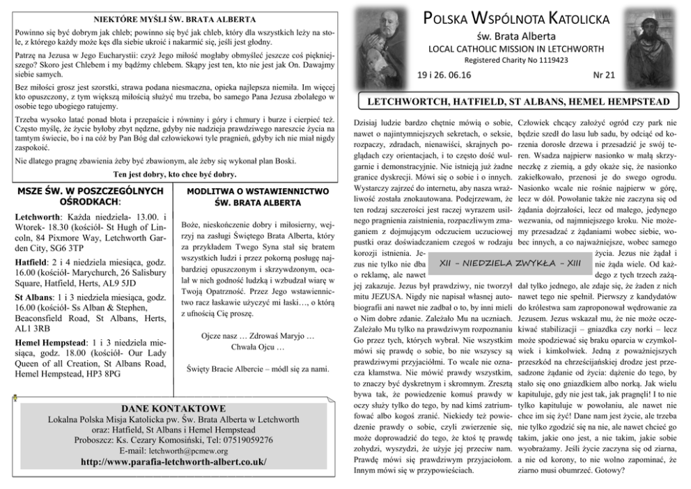 Biuletyn nr 21 z 19 i 26.06.2016 - Polska Parafia Św. Brata Alberta w