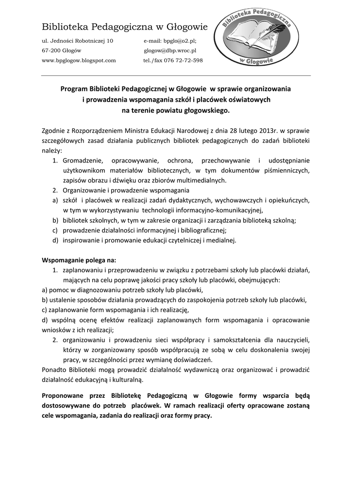 Biblioteka Pedagogiczna w Głogowie ul. Jedności Robotniczej 10 e-mail: [email protected]; 67-200 Głogów [email protected] www.bpglogow.blogspot.com tel./fax 076 72-72-598 Program Biblioteki Pedagogicznej w Głogowie w sprawie organizowania i prowadzenia wspomagania szkół i placówek oświatowych na terenie powiatu głogowskiego. Zgodnie z Rozporządzeniem Ministra Edukacji Narodowej z dnia 28 lutego 2013r. w sprawie szczegółowych zasad działania publicznych bibliotek pedagogicznych do zadań biblioteki należy: 1. Gromadzenie, opracowywanie, ochrona, przechowywanie i udostępnianie użytkownikom materiałów bibliotecznych, w tym dokumentów piśmienniczych, zapisów obrazu i dźwięku oraz zbiorów multimedialnych. 2. Organizowanie i prowadzenie wspomagania a) szkół i placówek w realizacji zadań dydaktycznych, wychowawczych i opiekuńczych, w tym w wykorzystywaniu technologii informacyjno-komunikacyjnej, b) bibliotek szkolnych, w tym w zakresie organizacji i zarządzania biblioteką szkolną; c) prowadzenie działalności informacyjnej i bibliograficznej; d) inspirowanie i promowanie edukacji czytelniczej i medialnej. Wspomaganie polega na: 1. zaplanowaniu i przeprowadzeniu w związku z potrzebami szkoły lub placówki działań, mających na celu poprawę jakości pracy szkoły lub placówki, obejmujących: a) pomoc w diagnozowaniu potrzeb szkoły lub placówki, b) ustalenie sposobów działania prowadzących do zaspokojenia potrzeb szkoły lub placówki, c) zaplanowanie form wspomagania i ich realizację, d) wspólną ocenę efektów realizacji zaplanowanych form wspomagania i opracowanie wniosków z ich realizacji; 2. organizowaniu i prowadzeniu sieci współpracy i samokształcenia dla nauczycieli, którzy w zorganizowany sposób współpracują ze sobą w celu doskonalenia swojej pracy, w szczególności przez wymianę doświadczeń. Ponadto Biblioteki mogą prowadzić działalność wydawniczą oraz organizować i prowadzić działalność edukacyjną i kulturalną. Proponowane przez Bibliotekę Pedagogiczną w Głogowie formy wsparcia będą dostosowywane do potrzeb placówek. W ramach realizacji oferty opracowane zostaną cele wspomagania, zadania do realizacji oraz formy pracy. Biblioteka Pedagogiczna w Głogowie ul. Jedności Robotniczej 10 e-mail: [email protected]; 67-200 Głogów [email protected] www.bpglogow.blogspot.com tel./fax 076 72-72-598 Biblioteka Pedagogiczna w Głogowie przygotowując się do realizacji powyższego rozporządzenia proponuje następujące obszary współpracy: Popularyzacja kultury czytelniczej Popularyzacja edukacji czytelniczej - rozwijanie wiedzy na temat dostępnych zasobów informacyjnych np. polskich bibliotek cyfrowych oraz kształcenie kompetencji czytelniczych, niezbędnych do odbioru tekstów literackich, naukowych i popularnonaukowych Popularyzacja edukacji medialnej - ukazanie roli mediów we współczesnej cywilizacji i wyrabianie umiejętności krytycznego odbioru komunikatów medialnych Popularyzacja edukacji informacyjnej - kształtowanie umiejętności wyszukiwania, selekcji oraz analizy informacji Wykorzystanie technologii informacyjno-komunikacyjnej (TIK) w pracy biblioteki szkolnej Wykorzystanie technologii informacyjno-komunikacyjnej (TIK) w nauczaniu przedmiotów nieinformatycznych Podnoszenie umiejętności posługiwania się pakietem Office w pracach nauczycieli na rzecz placówki Bezpieczeństwo w sieci – przeciwdziałanie zagrożeniom wynikającym z korzystania sieci Biblioteka Pedagogiczna w Głogowie proponuje wspomagania: następujące formy 1. Lekcje biblioteczne, pogadanki dla uczniów – w szkołach, przedszkolach. Zajęcia edukacyjne dla uczniów są realizowane w oparciu o podstawę programową, politykę oświatową państwa, a także są dostosowywane do wieku uczestników. Proponujemy zajęcia: • z zakresu edukacji informacyjnej – kształtowanie umiejętności wyszukiwania, selekcji oraz analizy informacji, • z zakresu edukacji czytelniczej - rozwijanie wiedzy na temat dostępnych zasobów informacyjnych np. polskich bibliotek cyfrowych oraz kształcenie kompetencji czytelniczych, niezbędnych do odbioru tekstów literackich, naukowych i popularnonaukowych, • z zakresu edukacji medialnej - ukazanie roli mediów we współczesnej cywilizacji i wyrabianie umiejętności krytycznego odbioru komunikatów medialnych, • zakresu edukacji regionalnej – kształtowanie świadomości regionalnej w szkole, • bezpieczeństwo w sieci. Biblioteka Pedagogiczna w Głogowie ul. Jedności Robotniczej 10 e-mail: [email protected]; 67-200 Głogów [email protected] www.bpglogow.blogspot.com tel./fax 076 72-72-598 Propozycje tematów lekcji bibliotecznych: a) b) c) d) e) f) g) h) Internet bez hejtu Prawo autorskie Warsztat informacyjny BP w Głogowie Bezpieczeństwo w Internecie (cyberbullying, cyberprzemoc) Spotkania dyskusyjnego Klubu Książki („Ja czytam”) Jak powstaje książka 1,2,3 – Internet Rozwijanie zainteresowań czytelniczych w klasach 1 – 3 (Lekcje w oparciu o lektury szkolne) i) Moje mocne i słabe strony. Rozpoznawanie preferencji zawodowych. j) Junior Edu – Jesień, Zima, Wiosna, Lato (przedszkola) k) Edukacja matematyczna 2. Projekcje filmów edukacyjnych dla młodzieży gimnazjalnej ponadgimnazjalnej (spis filmów w załączniku nr 1 „Projekcja filmów”). i 3. Tworzenie zestawów bibliograficznych zgodnie z zapotrzebowaniem szkoły/placówki, na różnorodne formy doskonalenia prowadzone przez pracowników Ośrodka Doradztwa Metodycznego w Głogowie. 4. Gromadzenie literatury zgodnie z potrzebami placówek – przeprowadzanie diagnozy potrzeb w szkołach i placówkach oświatowych. 5. Opracowanie informacji oświatowej na określony przez placówkę temat. 6. Wspomaganie biblioteki szkolnej poprzez: a) Organizowanie szkoleń, kursów, warsztatów metodycznych, przeprowadzanych przez edukatora zewnętrznego, mające na celu doskonalenie warsztatu pracy bibliotekarzy szkol
