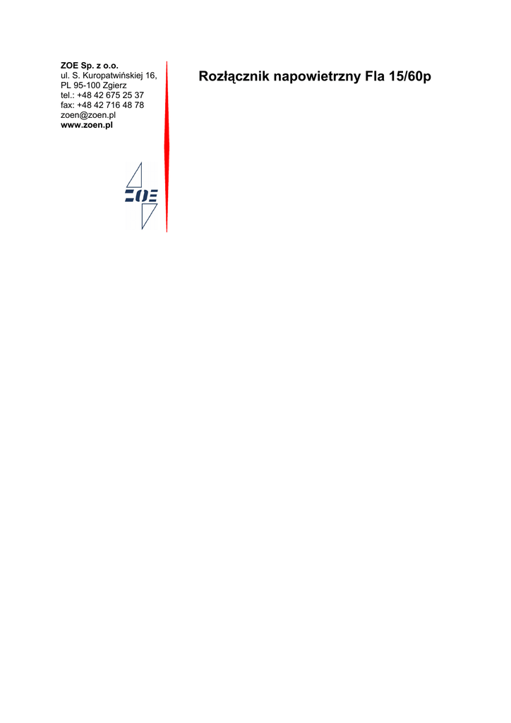 ZOE Sp. z o.o. ul. S. Kuropatwińskiej 16, PL 95-100 Zgierz tel.: +48 42 675 25 37 fax: +48 42 716 48 78 [email protected] www.zoen.pl Rozłącznik napowietrzny Fla 15/60p Rozłącznik napowietrzny Fla 15/60p Napowietrzne rozłączniki Fla 15/60p Produkowane według dokumentacji firmy Driescher. Od wielu lat znajdują się w eksploatacji w napowietrznych sieciach SN, udowadniając swoją wysoką niezawodność i bezpieczeństwo użytkowania. Mechaniczna wytrzymałość była sprawdzona dla 2000 cykli załącz/wyłącz. Rozłączniki spełniają normę: PN-EN 60694, PN-EN 60129+A1, PN-EN 60265-1. Użyte izolatory wsporcze odpowiadają obszarom zanieczyszczenia III stopnia. Prosta i wytrzymała konstrukcja rozłącznika w znakomity sposób sprawdziła się w różnych warunkach klimatycznych. Podstawą konstrukcji jest spawana stalowa rama, wykonana z otwartego profilu zabezpieczonego za pomocą cynkowania ogniowego. W podobny sposób zabezpieczone są pozostałe części, w tym wałki rozłącznika poruszające się w łożyskach z brązu. Łączenie przebiega w szczelnie zamkniętych komorach gaszących napełnionych olejem transformatorowym Shell Diala D albo ulegającym biodegradacji olejem transformatorowym Shell Fluid 4600. Do atmosfery nie są wydzielane żadne produkty spalania (gaszenia łuku). Dlatego też Fla 15/60p spełnia najściślejsze ekologiczne normy. Producent dodatkowo zapewnia możliwość bezpłatnej ekologicznej utylizacji zużytego oleju. Zdolność biodegradacji oleju Shell Fluid 4600 była sprawdzona i jest gwarantowana przez firmę Deutsche Shell AG. Pomiar był przeprowadzony według międzynarodowego standardu CEC-L-33-A-93. Wszystkie przewodzące prąd części rozłączników wykonane są z galwanicznie posrebrzanej elektrolitycznej miedzi. Odpowiednio zastosowany przekrój części przewodzących oraz właściwie dobrane naprężenie sprężyn gwarantują bezbłędne łączenie przez długie lata eksploatacji rozłącznika w ekstremalnych warunkach, także przy szadzi. Rozłączniki są dostarczane z izolatorami wsporczymi wykonanym z żywicy lub porcelany. Fla 15/60p mogą być dostarczane z zabudowanymi uziemnikami, z możliwością umieszczenia ich po stronie stałego lub ruchomego izolatora wsporczego. Stosowanie uziemników jest warunkowane zastosowaniem podwójnego, ewentualnie potrójnego napędu z prostą mechaniczną blokadą uniemożliwiającą niepoprawne manipulacje. Do lokalnego sterownia rozłączników i uziemników są dostarczane ręczne napędy, dla potrzeb zdalnego sterowania mechaniczne zewnętrzne napędy. Rozłącznik można wyposażyć w zabudowany pomocniczy łącznik (IP 44), umieszczony bezpośrednio na urządzeniu, co gwarantuje prawidłową sygnalizację załączenia i wyłączenia. Zwarciowe właściwości łączników są dotrzymywane z wielką rezerwą, dotyczy to zarówno rozłączników jak i uziemników. Sprawdzona konstrukcja rozłączników, wysoka jakość użytych materiałów i staranność przy produkcji zgodna z zasadami kontroli jakości ISO 9000 gwarantują niskie nakłady na eksploatację i utrzymanie. W warunkach normalnej eksploatacji rozłączniki zapewniają dziesięcioletnią bezobsługową pracę. Zastosowane małoolejowe komory gaszące zapewniają bezobsługową pracę przez okres 16 lat. Na komory regenerowane producent udziela gwarancji jak na komory nowe. ZOE Sp. z o.o. – www.zoen.pl 2 Rozłącznik napowietrzny Fla 15/60p Warunki klimatyczne Wielkość charakterystyczna Jednostka Wartość Maksymalna temperatura o +40 Minimalna temperatura o C -30 % 100 C Maksymalna względna wilgotność powietrza Maksymalna ciśnienie wiatru Pa (m/s) Maksymalna grubość lodu lub szadzi przy której jest urządzenie zdolne do realizacji swojej funkcji mm 700 (34) 20 Typowa nadmorska wysokość m n. p. m. do 1000* * zastosowanie przy większych wysokościach należy skonsultować z producentem Parametry techniczne Wielkość charakterystyczna Jednostka Wartość Napięcie znamionowe KV 24/36 Częstotliwość znamionowa Hz 50 Poziom znamionowy izolacji KV 125/50 A 400 A 630/200 Prąd znamionowy wyłączeniowy w sieci pierścieniowej A 400/200 Prąd znamionowy wyłączeniowy ładowania kabli A 11/10 Prąd znamionowy wyłączeniowy zwarcia doziemnego A 56/30 A 33 Prąd znamionowy krótkotrwały wytrzymywany KA 16 Prąd znamionowy szczytowy wytrzymywany KA 40 Cykle C-O 2000 Prąd znamionowy ciągły Prąd znamionowy wyłączeniowy w obwodzie o małej indukcyjności Prąd znamionowy wyłączeniowy ładowania kabli i linii w warunkach zwarcia doziemnego Trwałość mechaniczna ZOE Sp. z o.o. – www.zoen.pl 3 Rozłącznik napowietrzny Fla 15/60p Opis funkcji Sprawdzone olejowe komory gaszące rozłącznika są połączone równolegle z głównym obwodem i są wyposażone w mechanizm szybko rozłączający. Komory gaszące posiadają wystarczającą wytrzymałość, aby ich szczelność nie byłą naruszona nawet w ekstremalnych warunkach pracy. Każda komora gasząca jest napełniona około 0,5 litra oleju Shell Diala D lub Shell Fluid 4600. Przedstawione powyżej rysunki obrazują przebieg prądu w trakcie wyłączania: stan zamknięty, stan pośredni i stan otwarty rozłącznika. Młoteczkowy styk umieszczony na wahadłowych nożach jest zakończony dwoma młoteczkami (2), ich wygięcie jest skierowane do wewnątrz. Komora gasząca (1) jest sterowana przez widłowy styk z nierdzewnej stali (3). W trakcie sterowania łącznikiem ten widełkowy styk jest unoszony przez młoteczek zarówno w czasie załączania, jak i wyłączania. Migawkowy (migowy) mechanizm połączony ze stykiem widełkowym oddziałuje na system styków wewnątrz komory zamykając lub otwierając je błyskawicznie, niezależnie od szybkości ręcznego sterowania. W trakcie wyłączania otworzą się najpierw styki główne, a następnie po osiągnięciu bezpiecznej odległości dojdzie do błyskawicznego otwarcia styków w gaszącej komorze. Komory gasz