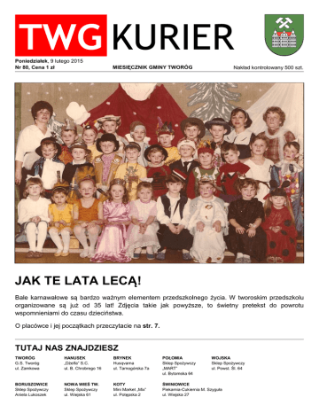 TWG KURIER Poniedziałek, 9 lutego 2015 Nr 80, Cena 1 zł MIESIĘCZNIK GMINY TWORÓG Nakład kontrolowany 500 szt. JAK TE LATA LECĄ! Bale karnawałowe są bardzo ważnym elementem przedszkolnego życia. W tworoskim przedszkolu organizowane są już od 35 lat! Zdjęcia takie jak powyższe, to świetny pretekst do powrotu wspomnieniami do czasu dzieciństwa. O placówce i jej początkach przeczytacie na str. 7. TUTAJ NAS ZNAJDZIESZ TWORÓG G.S. Tworóg ul. Zamkowa HANUSEK „Dżelfa” S.C. ul. B. Chrobrego 16 BRYNEK Husqvarna ul. Tarnogórska 7a POŁOMIA Sklep Spożywczy „MART” ul. Bytomska 64 WOJSKA Sklep Spożywczy ul. Powst. Śl. 64 BORUSZOWICE Sklep Spożywczy Aniela Lukoszek NOWA WIEŚ TW. Sklep Spożywczy ul. Wiejska 61 KOTY Mini Market „Mix” ul. Potępska 2 ŚWINIOWICE Piekarnia-Cukiernia M. Szyguła ul. Wiejska 27 TWG TABLICA KURIER O G Ł O S Z E N I E 1 PROCENT DLA OSP ZAPRASZAM Serdecznie dziękujemy wszystkim ludziom dobrej woli za coroczne przekazywanie 1% podatku strażakom Ochotniczej Straży Pożarnej w Tworogu. Mgr Krystyna Kwinto Tłumacz Przysięgły Języka Angielskiego Uzyskana z tego tytułu darowizna wspomaga naszą jednostkę w jej codziennym funkcjonowaniu, a co za tym idzie podnosi poziom bezpieczeństwa mieszkańców, jednocześnie podnosząc standard pracy strażakówochotników. Nigdy nie zawiedliśmy się na mieszkańcach naszej gminy i dlatego również w tym roku serdecznie prosimy o wsparcie naszej jednostki, za co z góry serdecznie DZIĘKUJEMY. Tworóg, ul. Słowików 5 Tel. 32 450 09 73 e-mail: [email protected] OFERTA PRACY Firma „Simet” z Tworoga poszukuje pracownika na stanowisko: pilarz-magazynier materiałów stalowych. Wymagania: dobra znajomość rysunku technicznego CV prosimy wysyłać na adres mailowy: [email protected] R E K L A M A Jeśli masz problem z rozliczeniem PIT – rozliczymy go za Ciebie – nie pobieramy opłat! Ty przekazujesz nam swój 1% podatku – my rozliczymy Twój podatek za 2014 i dostarczymy dokumenty do Urzędu Skarbowego za Ciebie. Bliższych informacji udziela Sławomir Dramski tel. 602-796-458 2 TWG KURIER WSTĘPNIAK OD REDAKCJI SPIS TREŚCI DRODZY MIESZKAŃCY, TABLICA………………………………………………….str.2 HOBBYSTA……………………………………………...str.4 – Bezpiecznie z Akademią Jazdy Lanette – Słodki sukces – SP w Tworogu gra o medal! POD LUPĄ……………………………………………….str.6 – Milenka chce chodzić – Apel – Jak te lata lecą! KULTURALNIE………………………………….………str.8 – Tworożanie na lodzie – Z cyklu Stowarzyszenia na Rzecz Rozwoju Gminy Tworóg – Noworoczne klimaty – Zostań aktorem! – Złota szopka dla gimnazjalistów – Bal nad bale – Anielskie życzenia – Niespodzianka dla jubilatów – Dzień seniora w Boruszowicach – Walc dla dziadka – Przygotowując się do Światowych Dni Młodzieży – Bałwanki 3D – Malarskie inspiracje – Tworogowska dycha po trowie – Lekcja życia dla młodzieży NA BIEŻĄCO………………………………….……….str.13 – Ta wieża zatruje nam życie – Wiarygodni! – Wypalenie zawodowe jej nie grozi – Garść ciekawostek z Wojski – Nie czekaj, zbadaj się! – Gabinet Rehabilitacyjny – Zajęcia karate w TG stacji W lutowym wydaniu naszego miesięcznika proponujemy Wam „podróż w czasie”. Odwiedzamy miejsce w Tworogu, które w pierwszej połowie XX w. sprzyjało zimowej zabawie. Mowa o stawie obok tworoskiego pałacu. Pod wpływem silnego mrozu stawał się naturalnym lodowiskiem. Zobacz jak wyglądała zabawa na str. 8. W lutym mija 35 lat istnienia Gminnego Przedszkola w Tworogu. To świetna okazja do wspomnień, tym bardziej, że w przedszkolu do dzisiaj uczy ktoś, kto pamięta jego początki! Więcej na ten temat w dziale „Pod Lupą”. Z kolei w Hanusku wciąż toczy się batalia o stację bazową telefonii komórkowej. Mieszkańcy nie mają zamiaru odpuścić, chcą doprowadzić do wstrzymania prac i rozbiórki wieży. Czy mają na to szanse? O tym na str. 13. Ponadto relacjonujemy obchody Dnia Babci i Dziadka w gminie, które jak zawsze dostarczyły jubilatom wielu okazji do wzruszeń i opisujemy pewien słodki sukces, będący zasługą młodej mieszkanki Świniowic… Zapraszamy do lektury! www.twg-kurier.pl [email protected] REDAKTOR NACZELNA Marta Kobędza-Krain KREACJA Łukasz Krain MECENAT Grażyna Chmiel – dyrektor Gminnego Ośrodka Kultury GOŚCINNIE Hanna Blacha, Elwira Ecler, Zbigniew Łacisz, Irena Jonecko, Bertold Kubitza, Hanna Pawełczyk, Anna Rogala-Goj, Kornelia Sobel, Elżbieta Zawartka WYDAWCA Gminny Ośrodek Kultury w Tworogu, ul. Zamkowa 1, 42-690 Tworóg, tel. (32) 285 74 92 DRUK Foto&druk www.fotoidruk.pl Redakcja zastrzega sobie prawo do redagowania i skracania tekstów przesyłanych do druku. 3 TWG KURIER HOBBYSTA W jaki sposób zapewnić najlepszy kontakt kierowcy z fotelem? Plecy kierowcy powinny przylegać do oparcia siedzenia, pośladki być ciasno wpasowane w zagłębienie łącznika oparcie-siedzisko. Dzięki takiej pozycji kierowca dokładnie czuje, co się dzieje z pojazdem w czasie ruchu. Jak powinno wyglądać ułożenie rąk? Po maksymalnym wyprostowaniu rąk (przy całkowitym oparciu o fotel samochodowy) kierowca powinien być w stanie położyć nadgarstki na godzinie 12 (wyobrażamy sobie kierownicę jako tarczę zegara). Przedramię pozostawiamy wyprostowane, a plecy nie odrywają się od oparcia. Dzięki takiej pozycji jesteśmy w stanie prowadzić samochód rękami delikatnie zgiętymi w łokciach podczas skrętu kierownicą (przy prawidłowym ich ułożeniu na kierownicy podczas jazdy). Ważna jest też pozycja nóg kierowcy. Kiedy pedał sprzęgła jest całkowicie wciśnięty stopą (całą stopą, nie palcami), noga powinna być ugięta w kolanie. W ten sposób unikniemy obrażeń w razie wypadku (nieudane hamowanie awaryjne) oraz stworzymy warunki do łatwie
