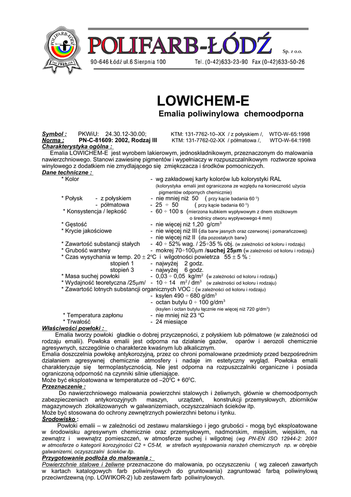 LOWICHEM-E Emalia poliwinylowa chemoodporna Symbol : PKWiU: 24.30.12-30.00; KTM: 131-7762-10–XX / z połyskiem /, WTO-W- 65:1998 Norma : PN-C-81609: 2002, Rodzaj III KTM: 131-7762-02-XX / półmatowa /, WTO-W- 64:1998 Charakterystyka ogólna : Emalia LOWICHEM-E jest wyrobem lakierowym, jednoskładnikowym, przeznaczonym do malowania nawierzchniowego. Stanowi zawiesinę pigmentów i wypełniaczy w rozpuszczalnikowym roztworze spoiwa winylowego z dodatkiem nie zmydlającego się zmiękczacza i środków pomocniczych. Dane techniczne : * Kolor - wg zakładowej karty kolorów lub kolorystyki RAL * Połysk - z połyskiem - półmatowa * Konsystencja / lepkość - (kolorystyka emalii jest ograniczona ze względu na konieczność użycia pigmentów odpornych chemicznie) nie mniej niż 50 ( przy kącie badania 60 0) 25 ÷ 50 ( przy kącie badania 60 0) 60 ÷ 100 s (mierzona kubkiem wypływowym z dnem stożkowym o średnicy otworu wypływowego 4 mm) * Gęstość * Krycie jakościowe - nie więcej niż 1,20 g/cm3 - nie więcej niż III (dla barw jasnych oraz czerwonej i pomarańczowej) - nie więcej niż II (dla pozostałych barw) * Zawartość substancji stałych - 40 ÷ 52% wag. / 25÷35 % obj. (w zależności od koloru i rodzaju) * Grubość warstwy - mokrej 70÷100µm /suchej 25µm (w zależności od koloru i rodzaju) * Czas wysychania w temp. 20 ± 2oC i wilgotności powietrza 55 ± 5 % : stopień 1 - najwyżej 2 godz. stopień 3 - najwyżej 6 godz. * Masa suchej powłoki - 0,03 ÷ 0,05 kg/m2 (w zależności od koloru i rodzaju) * Wydajność teoretyczna /25µm/ - 10 ÷ 14 m2 / dm3 (w zależności od koloru i rodzaju) * Zawartość lotnych substancji organicznych VOC : (w zależności od koloru i rodzaju) - ksylen 490 ÷ 680 g/dm3 - octan butylu 0 ÷ 100 g/dm3 (ksylen i octan butylu łącznie nie więcej niż 720 g/dm3) * Temperatura zapłonu - nie mniej niż 23 oC * Trwałość - 24 miesiące Właściwości powłoki : Emalia tworzy powłoki gładkie o dobrej przyczepności, z połyskiem lub półmatowe (w zależności od rodzaju emalii). Powłoka emalii jest odporna na działanie gazów, oparów i aerozoli chemicznie agresywnych, szczególnie o charakterze kwaśnym lub alkalicznym. Emalia doszczelnia powłokę antykorozyjną, przez co chroni pomalowane przedmioty przed bezpośrednim działaniem agresywnej chemicznie atmosfery i nadaje im estetyczny wygląd. Powłoka emalii charakteryzuje się termoplastycznością. Nie jest odporna na rozpuszczalniki organiczne i posiada ograniczoną odporność na czynniki silnie utleniające. Może być eksploatowana w temperaturze od –200C + 600C. Przeznaczenie : Do nawierzchniowego malowania powierzchni stalowych i żeliwnych, głównie w chemoodpornych zabezpieczeniach antykorozyjnych maszyn, urządzeń, konstrukcji przemysłowych, zbiorników magazynowych zlokalizowanych w galwanizerniach, oczyszczalniach ścieków itp. Może być stosowana do ochrony zewnętrznych powierzchni betonu i tynku. Środowisko : Powłoki emalii – w zależności od zestawu malarskiego i jego grubości - mogą być eksploatowane w środowisku agresywnym chemicznie oraz przemysłowym, nadmorskim, miejskim, wiejskim, na zewnątrz i wewnątrz pomieszczeń, w atmosferze suchej i wilgotnej (wg PN-EN ISO 12944-2: 2001 w atmosferze o kategorii korozyjności C2 ÷ C5-M, w strefach występowania narażeń chemicznych np. w obrębie galwanizerni, oczyszczalni ścieków itp. Przygotowanie podłoża do malowania : Powierzchnie stalowe i żeliwne przeznaczone do malowania, po oczyszczeniu ( wg zaleceń zawartych w kartach katalogowych farb poliwinylowych do gruntowania) zagruntować farbą poliwinylową przeciwrdzewną (np. LOWIKOR-2) lub zestawem farb poliwinylowych. Przy renowacji starych powłok wskazane jest umycie konstrukcji wodą pod wysokim ciśnieniem i w zależności od stopnia zniszczenia powłoki podłoże oczyścić metodą strumieniowo-ścierną do stopnia czystości Sa 2 1/2 (całą powierzchnię lub miejscowo). Dopuszcza się miejscowe czyszczenie ręczne lub narzędziami z napędem mechanicznym do stopnia czystości P St 3. Ubytki powłoki malarskiej odpowiednio uzupełnić farbą lub zestawem farb poliwinylowych. Powierzchnie z betonu i tynku - czyste i suche - malować nie wcześniej niż po upływie 4 - 5 tygodni od wykonania. Powierzchnie przeznaczone do malowania renowacyjnego oczyścić z luźno przylegającej starej powłoki lakierowej, ubytki w podłożu betonowym lub w tynku uzupełnić zaprawkami odpowiednimi pod względem materiałowym i wytrzymałościowym do naprawianej powierzchni. Podłoże – w zależności od potrzeb – na całej powierzchni lub miejscowo zagruntować emalią rozcieńczoną rozcieńczalnikiem. Warunki malowania : Temperatura wyrobu Temperatura podłoża Wilgotność wzgl. powietrza 10 ÷ 30 oC 5 ÷ 40 oC najwyżej 80 % Temperatura podłoża powinna być wyższa od punktu rosy co najmniej 3oC. Emalię przed użyciem dokładnie wymieszać, nawet gdy osad nie występuje. Sposób aplikacji : Emalię można nakładać : - pędzlem : rozcieńczenie 0 ÷ 5 % wag. - przez zanurzanie lub polewanie : rozcieńczenie 0 ÷ 15 % wag. - natryskiem powietrznym : rozcieńczenie 10 ÷ 25 % wag. - natryskiem bezpowietrznym: rozcieńczenie 0 ÷ 10 % wag., średnica dyszy 0,28 ÷ 0,38 mm, ciśnienie natrysku 12 ÷ 18 MPa, kąt natrysku 20 ÷ 60 o (zależy od uwarunkowań praktycznych). Emalia w wykonaniu specjalnym (emalia poliwinylowa chemoodporna do elektrostatycznego natrysku KTM: 131-7762-17-XX) lub po dostosowaniu może być nakładana również natryskiem elektrostatycznym. Rozcieńczalnik / zmywacz : Rozcieńczalnik do wyrobów poliwinylowych i chlorokauczukowych ogólnego stosowania (KTM : 1318157-01-01). Nie stosować benzyny do lakierów ! Czas sezonowania powłoki przed nałożeniem następnej warstwy : Na powłokę emalii można nakładać następną warstwę „mokro na mokro” tj. po 2 godz. schnięcia poprzedniej warstwy lub w dowolnie d