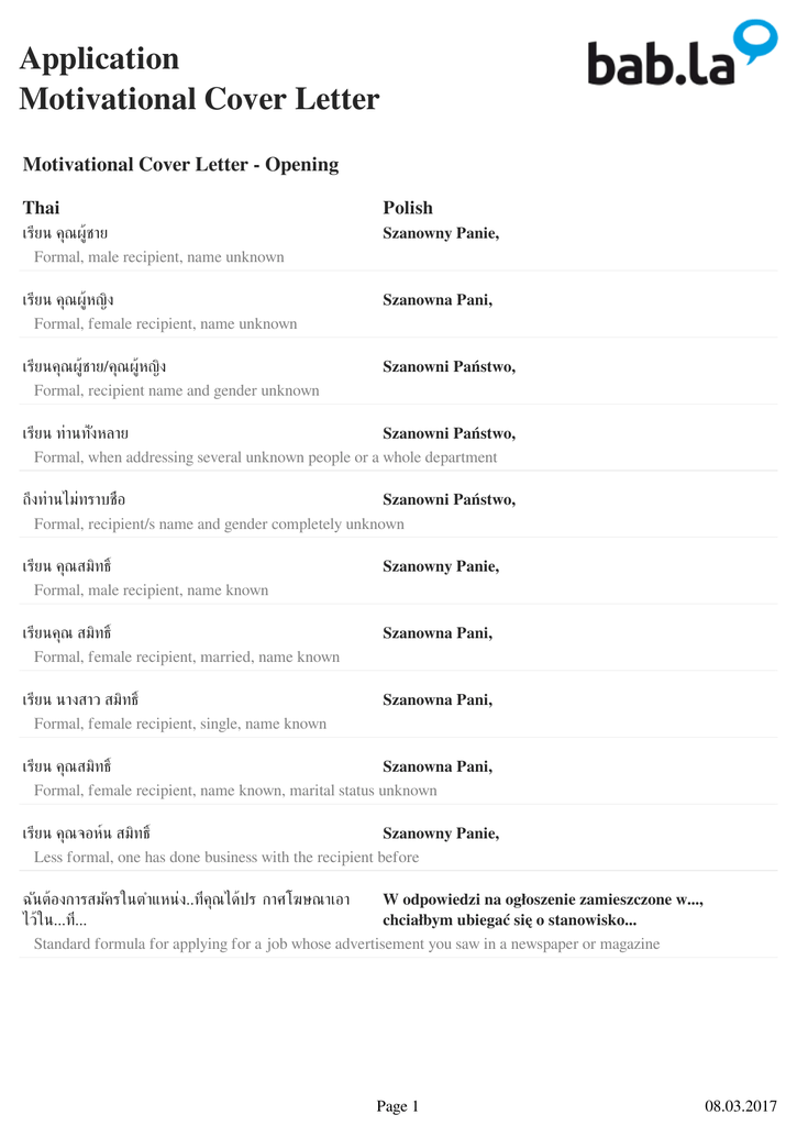 Phrases: Application | Motivational Cover Letter (Thai-Polish)