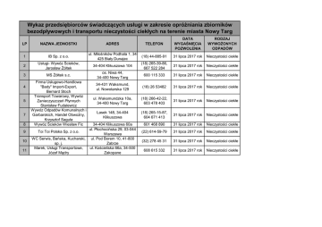 Wykaz przedsiębiorców świadczących usługi w zakresie opróżniania zbiorników bezodpływowych i transportu nieczystości ciekłych na terenie miasta Nowy Targ LP NAZWA JEDNOSTKI 1 IB Sp. z o.o. 2 Usługi- Wywóz Ścieków, Jarosław Żółtek 3 MS Żółtek s.c. 4 5 7 8 9 10 11 Firma Usługowo-Handlowa "Bady" Import-Export, Bernard Stoch Transport Towarowy, Wywóz Zanieczyszczeń Płynnych Stanisław Fudalewicz Wywóz Odpadów Komunalnych i Garbarskich, Handel Obwoźny, Krzysztof Saguła Wywóz Ścieków Wiesław Fic ADRES TELEFON ul. Miłośników Podhala 1, 34(18) 44-885-91 425 Biały Dunajec (18) 265-39-86, 34-404 Klikuszowa 104 667 522 284 os. Niwa 44, 600 115 333 34-400 Nowy Targ DATA WYGAŚNIĘCIA POZWOLENIA RODZAJ WYWOŻONYCH ODPADÓW 31 lipca 2017 rok Nieczystości ciekłe 31 lipca 2017 rok Nieczystości ciekłe 31 lipca 2017 rok Nieczystości ciekłe 34-431 Waksmund, ul. Nowotarska 129 (18) 26 53482 31 lipca 2017 rok Nieczystości ciekłe ul. Waksmundzka 10a, 34-400 Nowy Targ (18) 266-42-22, 603 478 403 31 lipca 2017 rok Nieczystości ciekłe Lasek 148, 34-404 Klikuszowa (18) 265-15-87, 604 671 413 31 lipca 2017 rok Nieczystości ciekłe 601 468 890 31 lipca 2017 rok Nieczystości ciekłe (22) 614-59-79 31 lipca 2017 rok Nieczystości ciekłe (32) 278 45 31 31 lipca 2017 rok Nieczystości ciekłe 608 615 332 31 lipca 2017 rok Nieczystości ciekłe 34-404 Klikuszowa 60a ul. Płochocińska 29, 03-044 Toi Toi Polska Sp. z o.o. Warszawa WC Serwis, Bańska, Kucharski, ul. Pod Borem 10, 41-800 sp. j. Zabrze Marek, Usługi Transportowe, ul. Kościeliska 66a, 34-500 Józef Mądry Zakopane