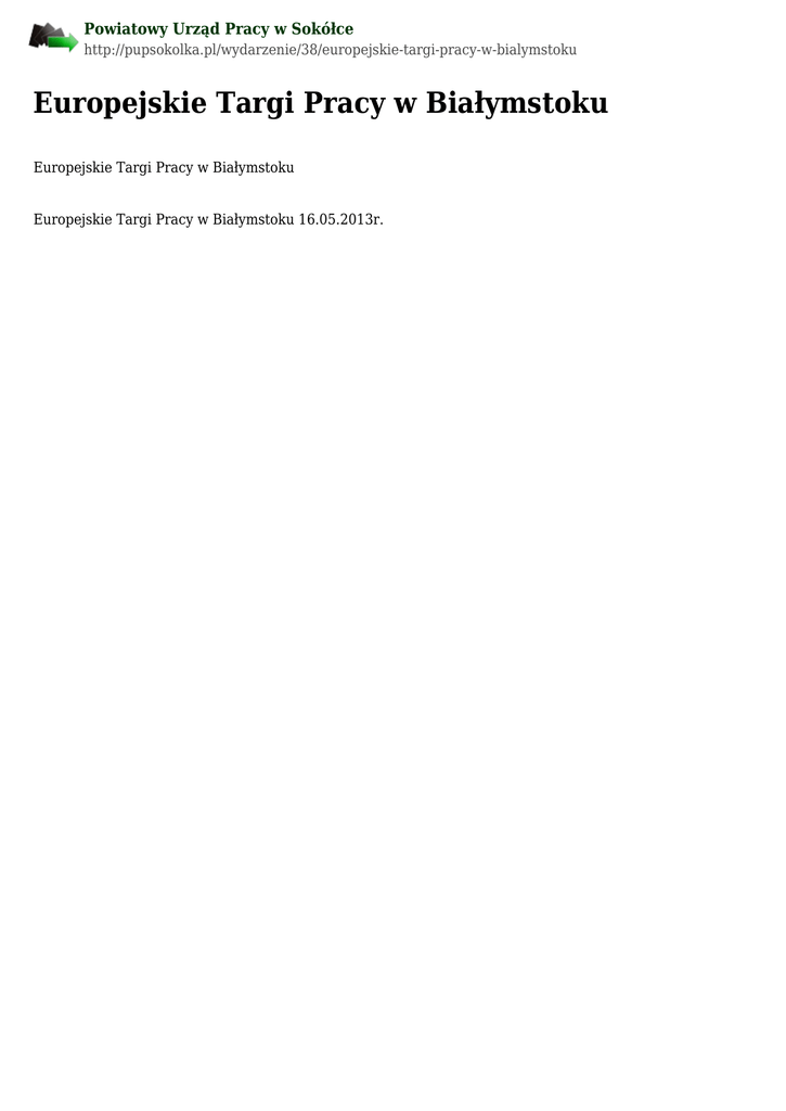 Powiatowy Urząd Pracy w Sokółce http://pupsokolka.pl/wydarzenie/38/europejskie-targi-pracy-w-bialymstoku Europejskie Targi Pracy w Białymstoku Europejskie Targi Pracy w Białymstoku Europejskie Targi Pracy w Białymstoku 16.05.2013r.