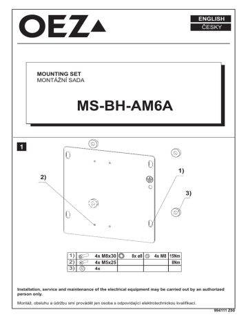 ENGLISH ČESKY MOUNTING SET MONTÁŽNÍ SADA MS-BH-AM6A 1 1) 2) 3) 1) 2) 3) 4x M8x30 4x M5x25 8x ø8 4x M8 15Nm 8Nm 4x Installation, service and maintenance of the electrical equipment may be carried out by an authorized person only. Montáž, obsluhu a údržbu smí provádět jen osoba s odpovídající elektrotechnickou kvalifikací. 994111 Z00 2 FIXED DESIGN, FRONT CONNECTION. PEVNÉ PROVEDENÍ, PŘEDNÍ PŘÍVOD. 1 182 mm 246 mm MS-BH-AM6A 2 3) M8x30 15Nm 3) 3) 3) MS-BH-AM6A -2- 994111 Z00 3 MS-BH-AM6A 4 MS-BH-AM6A M5x25 8Nm BH630... -3- 994111 Z00 5 MS-BH-AM6A BH630... 3 Only materials which have low adverse environmental impact and which do not contain dangerous substances as specified in ROHS directive have been used in the product. Ve výrobku jsou použity materiály s nízkým negativním dopadem na životní prostředí, které neobsahují zakázané nebezpečné látky dle ROHS. -4- 994111 Z00 ESPAÑOL SLOVENSKY ПО-РУССКИ PO POLSKU DEUTSCH MS-BH-AM6A -1- 994111- Z00 Návod k použitiu SLOVENSKY Montážna sada - MS-BH-AM6A Montáž, obsluhu a údržbu môže vykonávať iba osoba s odpovedajúcou elektrotechnickou 1 2 3 kvalifikáciou. Pevné prevedenie Vo výrobku sú použite materiály s nízkym negatívnym dopadom na životné prostredie, ktoré neobsahuje zakázané latky podľa ROHS Инструкция по эксплуатации ПО-РУССКИ Монтажный комплект - MS-BH-AM6A Установку, обслуживание и уход может проводить только лицо с соответствующей 1 2 3 электротехнической квалификацией. Стационарное исполнение В изделии применены материалы с малым негативным влиянием на окружающую среду, которые не содержат запрещенные опасные вещества, указанные в директиве ROHS. Instrukcja obsługi PO POLSKU Zestawa montażowa - MS-BH-AM6A Montaż, obsługę i konserwację wykonywać może wyłącznie odpowiednio wykwalifikowana 1 2 3 osoby z branży elektrotechnicznej. Wykonanie stałe W wyrobie zastosowane zostały materiały z niskim negatywnym oddziaływaniem na środowisko naturalne, które nie zawierają zakazanych niebezpiecznych substancji zgodnie z ROHS. Gebrauchsanweisung DEUTSCH Montagesatz - MS-BH-AM6A Die Montage, die Bedienung und Instandhaltung kann nur der Arbeiter mit der 1 2 3 entsprechenden elektrotechnischen Qualifikation verrichten. Feste Ausführung Für das Erzeugnis werden Stoffe mit niedrigen negativen Umweltauswirkungen angewandt, die keine verbotenen gefährlichen Stoffe nach ROHS enthalten. Instrucciones de uso ESPAÑOL Juego de montaje - MS-BH-AM6A El montaje, servicio y mantenimiento puede realizar únicamente la persona con la 1 2 3 cualificación electrotécnica correspondiente. Versión fija En el producto están usados los materiales que tienen incidencia negativa baja al medio ambiente, que no incluyen las materias peligrosas prohibidas según ROHS. -2- 994111- Z00