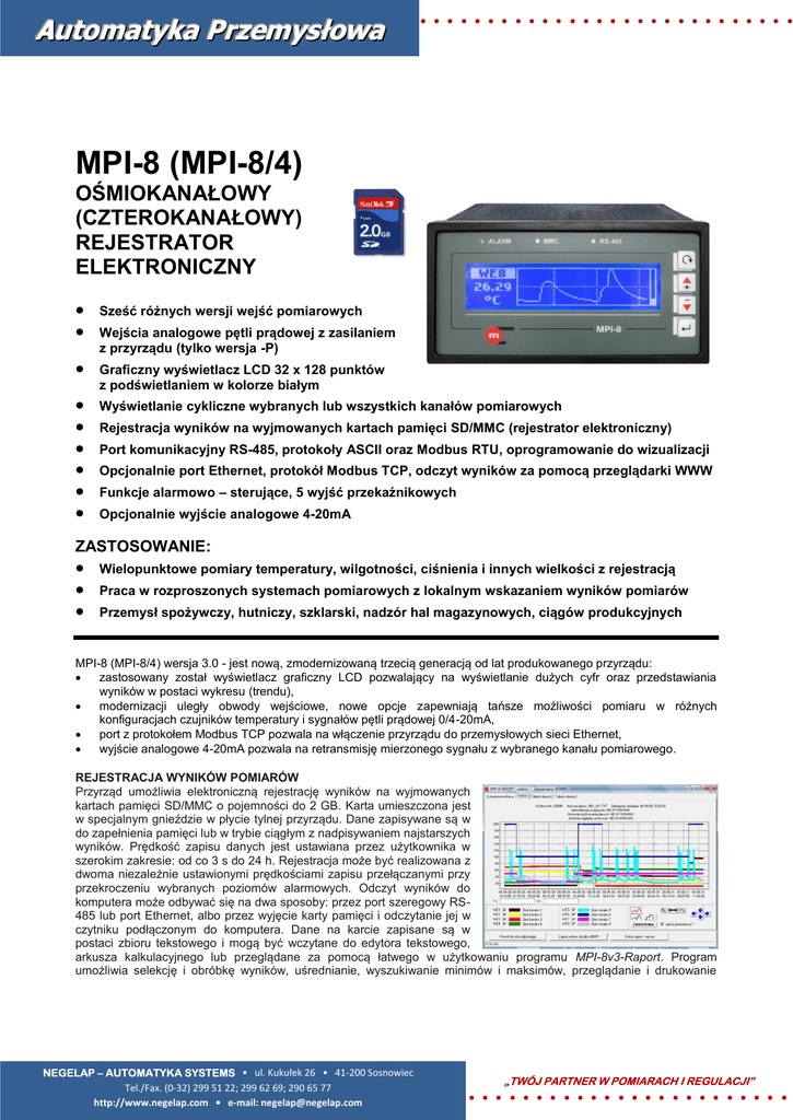 Automatyka Przemysłowa ............................ . MPI-8 (MPI-8/4) OŚMIOKANAŁOWY (CZTEROKANAŁOWY) REJESTRATOR ELEKTRONICZNY Sześć różnych wersji wejść pomiarowych Wejścia analogowe pętli prądowej z zasilaniem z przyrządu (tylko wersja -P) Graficzny wyświetlacz LCD 32 x 128 punktów z podświetlaniem w kolorze białym Wyświetlanie cykliczne wybranych lub wszystkich kanałów pomiarowych Rejestracja wyników na wyjmowanych kartach pamięci SD/MMC (rejestrator elektroniczny) Port komunikacyjny RS-485, protokoły ASCII oraz Modbus RTU, oprogramowanie do wizualizacji Opcjonalnie port Ethernet, protokół Modbus TCP, odczyt wyników za pomocą przeglądarki WWW Funkcje alarmowo – sterujące, 5 wyjść przekaźnikowych Opcjonalnie wyjście analogowe 4-20mA ZASTOSOWANIE: Wielopunktowe pomiary temperatury, wilgotności, ciśnienia i innych wielkości z rejestracją Praca w rozproszonych systemach pomiarowych z lokalnym wskazaniem wyników pomiarów Przemysł spożywczy, hutniczy, szklarski, nadzór hal magazynowych, ciągów produkcyjnych MPI-8 (MPI-8/4) wersja 3.0 - jest nową, zmodernizowaną trzecią generacją od lat produkowanego przyrządu: zastosowany został wyświetlacz graficzny LCD pozwalający na wyświetlanie dużych cyfr oraz przedstawiania wyników w postaci wykresu (trendu), modernizacji uległy obwody wejściowe, nowe opcje zapewniają tańsze możliwości pomiaru w różnych konfiguracjach czujników temperatury i sygnałów pętli prądowej 0/4-20mA, port z protokołem Modbus TCP pozwala na włączenie przyrządu do przemysłowych sieci Ethernet, wyjście analogowe 4-20mA pozwala na retransmisję mierzonego sygnału z wybranego kanału pomiarowego. REJESTRACJA WYNIKÓW POMIARÓW Przyrząd umożliwia elektroniczną rejestrację wyników na wyjmowanych kartach pamięci SD/MMC o pojemności do 2 GB. Karta umieszczona jest w specjalnym gnieździe w płycie tylnej przyrządu. Dane zapisywane są w do zapełnienia pamięci lub w trybie ciągłym z nadpisywaniem najstarszych wyników. Prędkość zapisu danych jest ustawiana przez użytkownika w szerokim zakresie: od co 3 s do 24 h. Rejestracja może być realizowana z dwoma niezależnie ustawionymi prędkościami zapisu przełączanymi przy przekroczeniu wybranych poziomów alarmowych. Odczyt wyników do komputera może odbywać się na dwa sposoby: przez port szeregowy RS485 lub port Ethernet, albo przez wyjęcie karty pamięci i odczytanie jej w czytniku podłączonym do komputera. Dane na karcie zapisane są w postaci zbioru tekstowego i mogą być wczytane do edytora tekstowego, arkusza kalkulacyjnego lub przeglądane za pomocą łatwego w użytkowaniu programu MPI-8v3-Raport. Program umożliwia selekcję i obróbkę wyników, uśrednianie, wyszukiwanie minimów i maksimów, przeglądanie i drukowanie NEGELAP – AUTOMATYKA SYSTEMS • ul. Kukułek 26 • 41-200 Sosnowiec Tel./Fax. (0-32) 299 51 22; 299 62 69; 290 65 77 http://www.negelap.com • e-mail: [email protected] „TWÓJ PARTNER W POMIARACH I REGULACJI” ........................ Automatyka Przemysłowa ............................ . raportów w postaci graficznej i tabelarycznej. Możliwy jest również odczyt wyników mierzonych „on-line” i przedstawienie ich w postaci wykresu, tabeli oraz ekranu synoptycznego na tle rysunku lub zdjęcia. PORT SZEREGOWY RS-485, PORT ETHERNET Przyrząd standardowo wyposażony jest w port komunikacyjny RS-485, umożliwiający programowanie ustawień z komputera oraz odczyt mierzonych i zarejestrowanych wyników. Transmisja jest zgodna ze standardem Modbus RTU lub w kodzie ASCII, zapewniając współpracę z innymi uniwersalnymi systemami sterowania i wizualizacji. Opcjonalnie może być zainstalowany port do pracy w przemysłowych sieciach Ethernet z protokołem Modbus TCP do odczytu wyników pomiarów przez programy typu SCADA. Wyniki mogą być również przeglądane w postaci tabelarycznej lub w postaci trendu za pomocą zwykłej przeglądarki WWW. UKŁAD ALARMOWO - STERUJĄCY Układ umożliwia swobodne programowanie w każdym kanale do 4 poziomów granicznych AL1 do AL4, których przekroczenie powoduje zgłoszenie alarmu lub zmianę stanu przekaźnika sterującego. Przyrząd ma pięć półprzewodnikowych przekaźników wyjściowych, które mogą być swobodnie przypisane do progów alarmowych. WERSJE WYKONANIA Wersja 8 kanałowa MPI-8 -x -y -n -T - 0 Brak wyjścia analogowego 4-20 mA - 1 Wyjście analogowe 4-20 mA, retransmisja jednego z kanałów pomiarowych - 0 Brak dodatkowego portu Ethernet - 1 Dodatkowy port Ethernet, protokół Modbus TCP, serwer WWW Ilość wejść 0/4-20 mA, pozostałe typu RTD/TC, komutacja przekaźnikami sygnałowymi, brak zasilania pętli prądowych z przyrządu, separacja galwaniczna między kanałami 8 wejść typu 0/4-20 mA, komutacja elektroniczna, wspólny zacisk I-, możliwość zasilania pętli prądowych z przyrządu 8 wejść typu RTD/TC, komutacja elektroniczna -x -y -n - 0 Brak wyjścia analogowego 4-20 mA - 1 Wyjście analogowe 4-20 mA, retransmisja jednego z kanałów pomiarowych - 0 Brak dodatkowego portu Ethernet - 1 Dodatkowy port Ethernet, protokół Modbus TCP, serwer WWW Ilość wejść 0/4-20 mA, pozostałe typu RTD/TC, komutacja przekaźnikami sygnałowymi, brak zasilania pętli prądowych z przyrządu, separacja galwaniczna między kanałami 4 wejść typu 0/4-20 mA, komutacja elektroniczna, wspólny zacisk I-, możliwość zasilania pętli prądowych z przyrządu 4 wejść typu RTD/TC, komutacja elektroniczna -P -z Wersja 4 kanałowa MPI-8/4 -P -T -z WYPOSAŻENIE DODATKOWE Konwerter z separacją galwaniczną CONV485USB-I (USB / RS-485) Konwerter serwisowy bez separacji galwanicznej CONV485USB (USB / RS-485) Konwerter CONV485E (Ethernet / RS-485) Program do wizualizacji danych MPI-8v3-Raport.exe Karta SD do rejestracji wyników pomiarów 2 GB (firmy SanDisk) Czytnik kart MMC/SD - USB SDDR-113 (firmy SanDisk) Transformator zasilający PSS 10VA 230/24 VAC (fir
