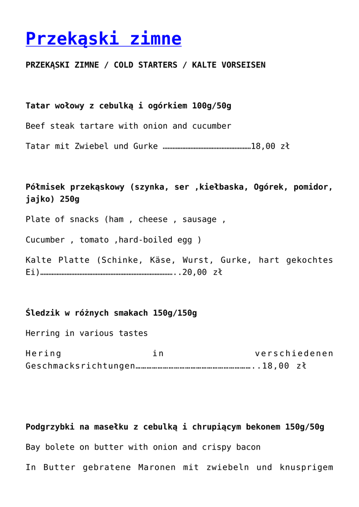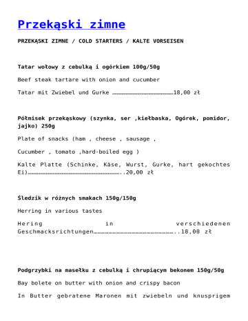 Przekąski zimne PRZEKĄSKI ZIMNE / COLD STARTERS / KALTE VORSEISEN Tatar wołowy z cebulką i ogórkiem 100g/50g Beef steak tartare with onion and cucumber Tatar mit Zwiebel und Gurke ………………………………………………18,00 zł Półmisek przekąskowy (szynka, ser ,kiełbaska, Ogórek, pomidor, jajko) 250g Plate of snacks (ham , cheese , sausage , Cucumber , tomato ,hard-boiled egg ) Kalte Platte (Schinke, Käse, Wurst, Gurke, hart gekochtes Ei)………………………………………………………………………..20,00 zł Śledzik w różnych smakach 150g/150g Herring in various tastes Hering in verschiedenen Geschmacksrichtungen………………………………………………………..18,00 zł Podgrzybki na masełku z cebulką i chrupiącym bekonem 150g/50g Bay bolete on butter with onion and crispy bacon In Butter gebratene Maronen mit zwiebeln und knusprigem Bacon………………………………………………………………22,00 zł Paluchy ze schabu na sosie curry 200g Pork loins in curry sauce Schnitzelstäbchen mit Currysoße ………………………………………………….. 22,00 zł Wątróbka drobiowa z cebulką i jabłkiem 150g Poultry liver with onion and apple Geflügelleber mit Zwiebeln und Äpfeln …………………………………………16,00 zł